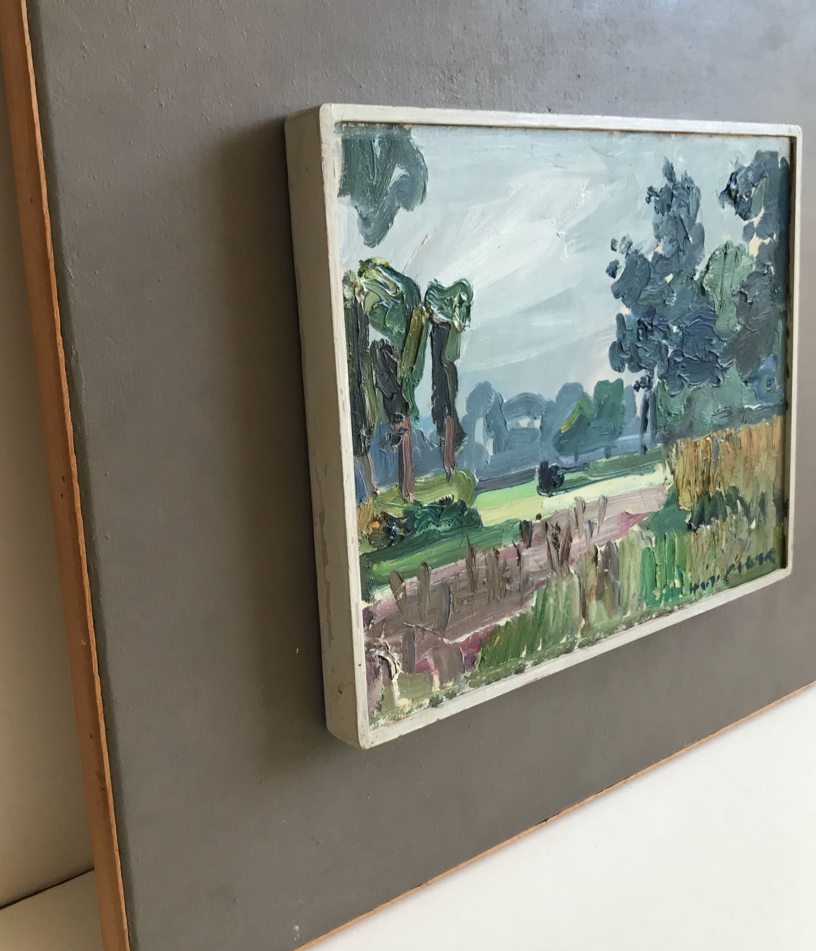 Mooi zomers landschap van Hein Stork, geschilder op een paneel, dat vervolgens weer op een ingelijst paneel is bevestigd. Het buitenste paneel is met een bruin/grijze olieverf beschilderd. Het binnenste paneel heeft een witte rand, waarvan de verf aan de linkerzijkant een klein beetje afgebladderd is. In 1990 aangeschaft voor 600 gulden