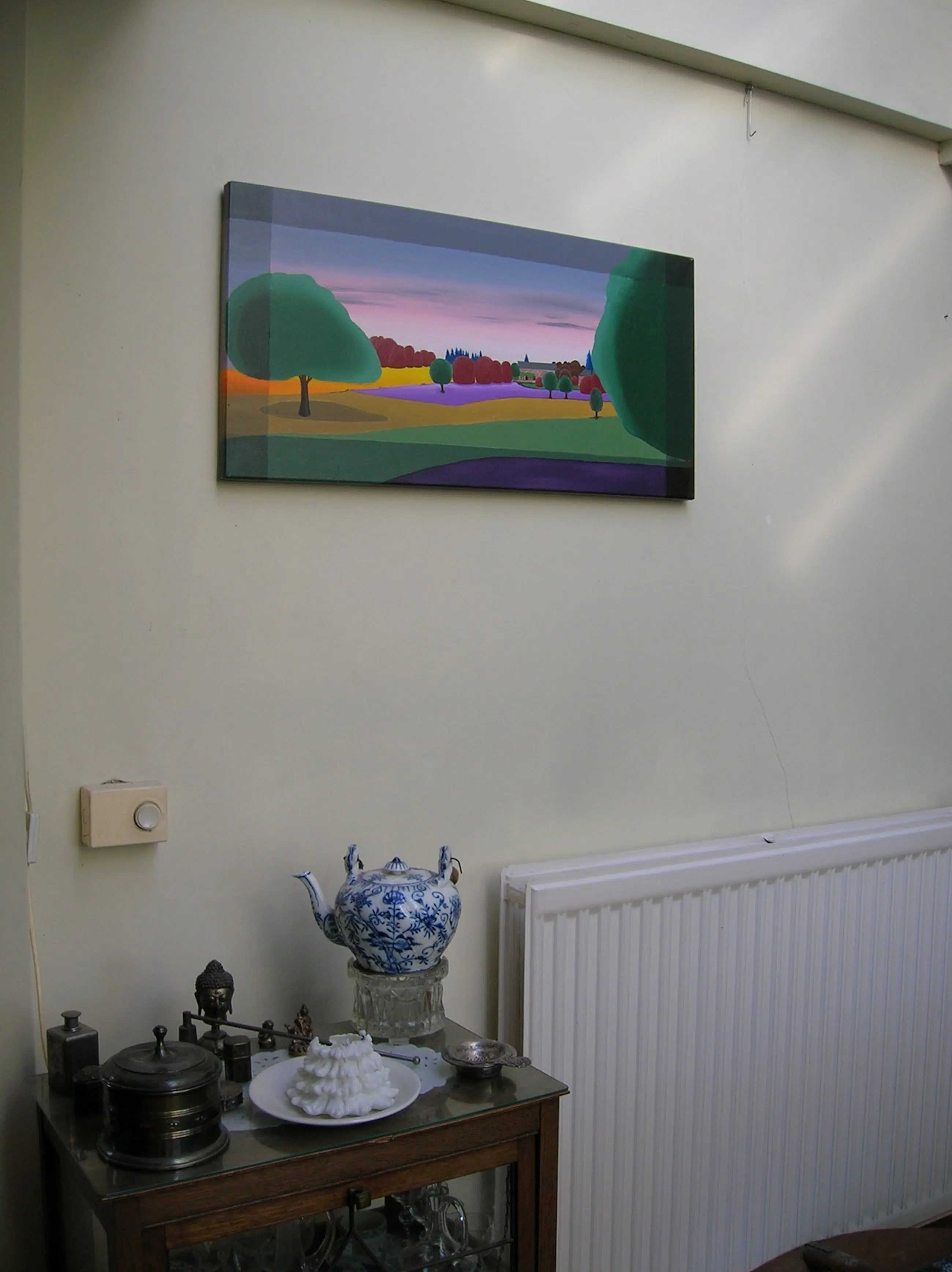 Het is ook aan de zijkant geschilderd. Het kan dus zonder lijst op gehangen worden. Er een kan een zwarte baklijst bij geleverd worden €30,-