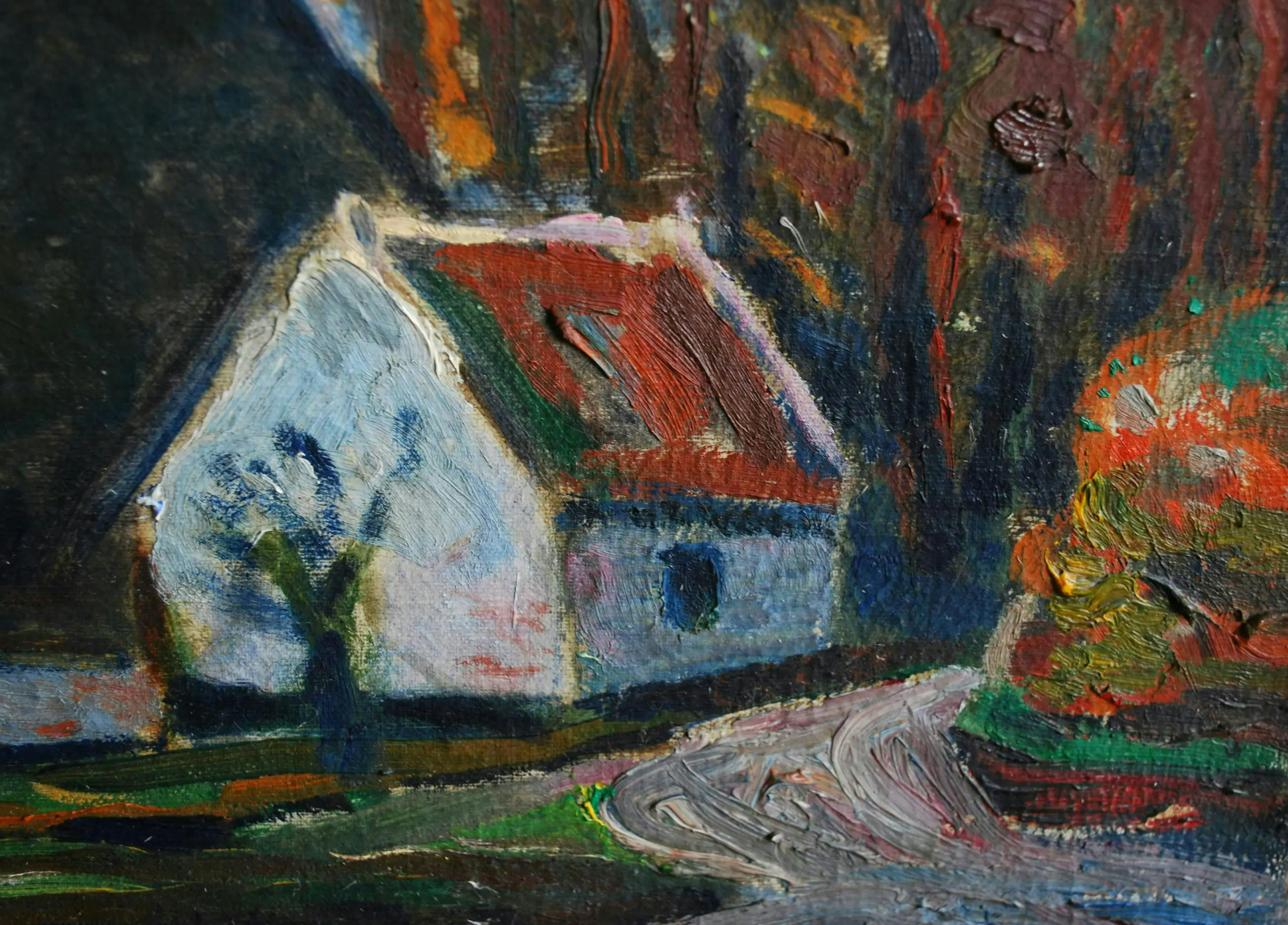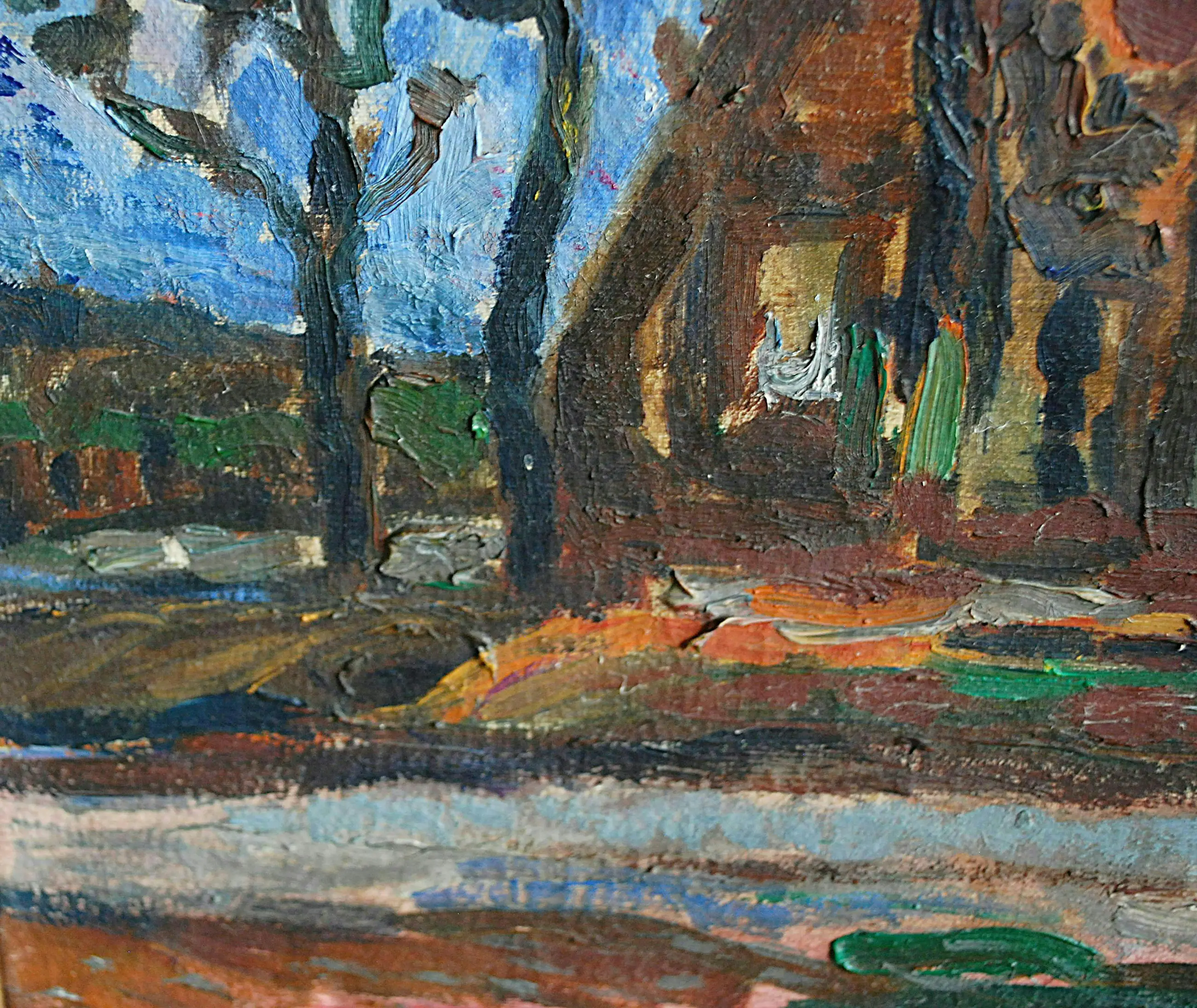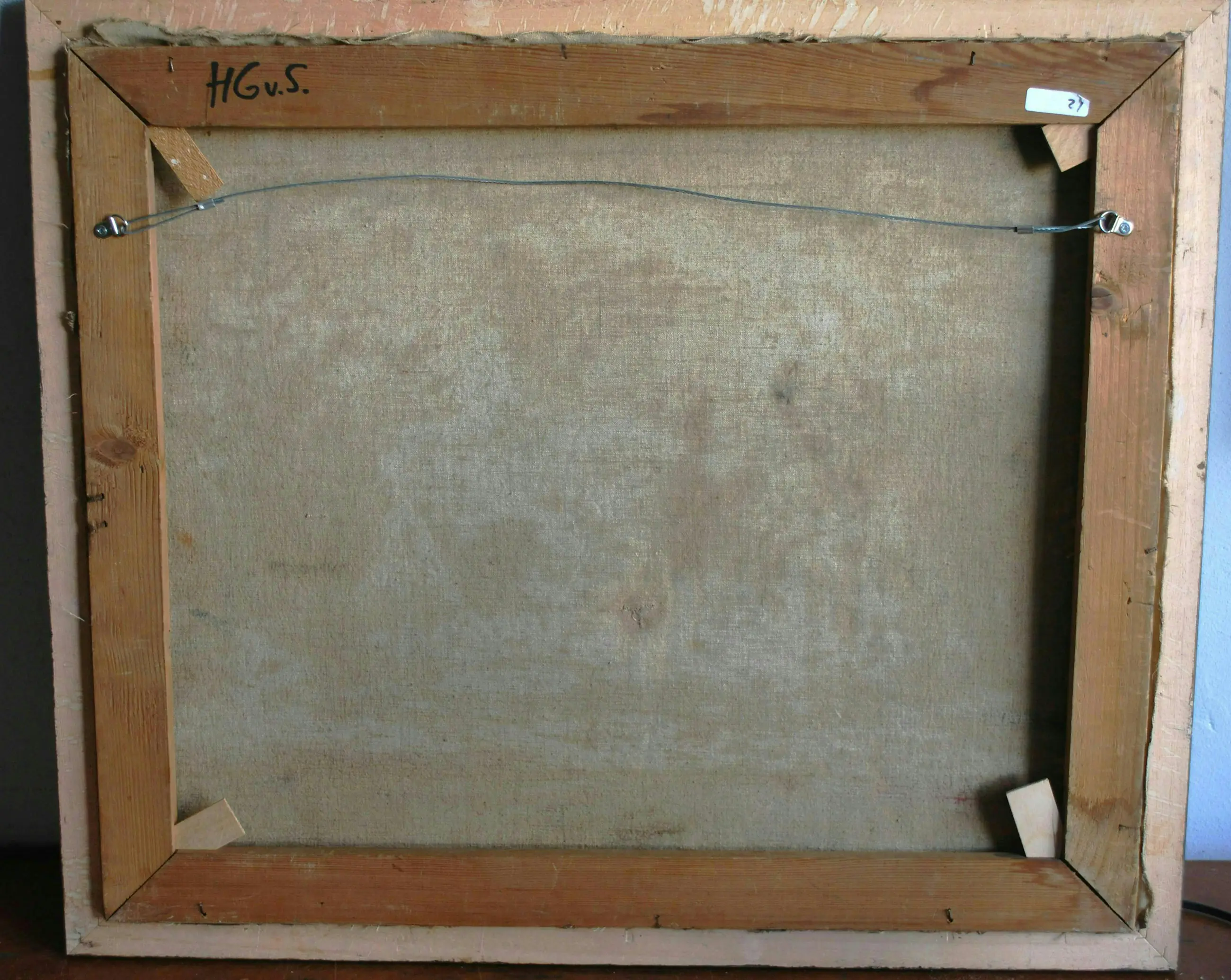 Dit zal een Gelderse scene zijn, ca. jaren 40. Pasteus en 'droog' geschilderd, de randen zijn meest onbeschilderd. Het linnen doek is genageld op een spieraam, initialen aan de achterzijde. In een fraaie houten lijst.