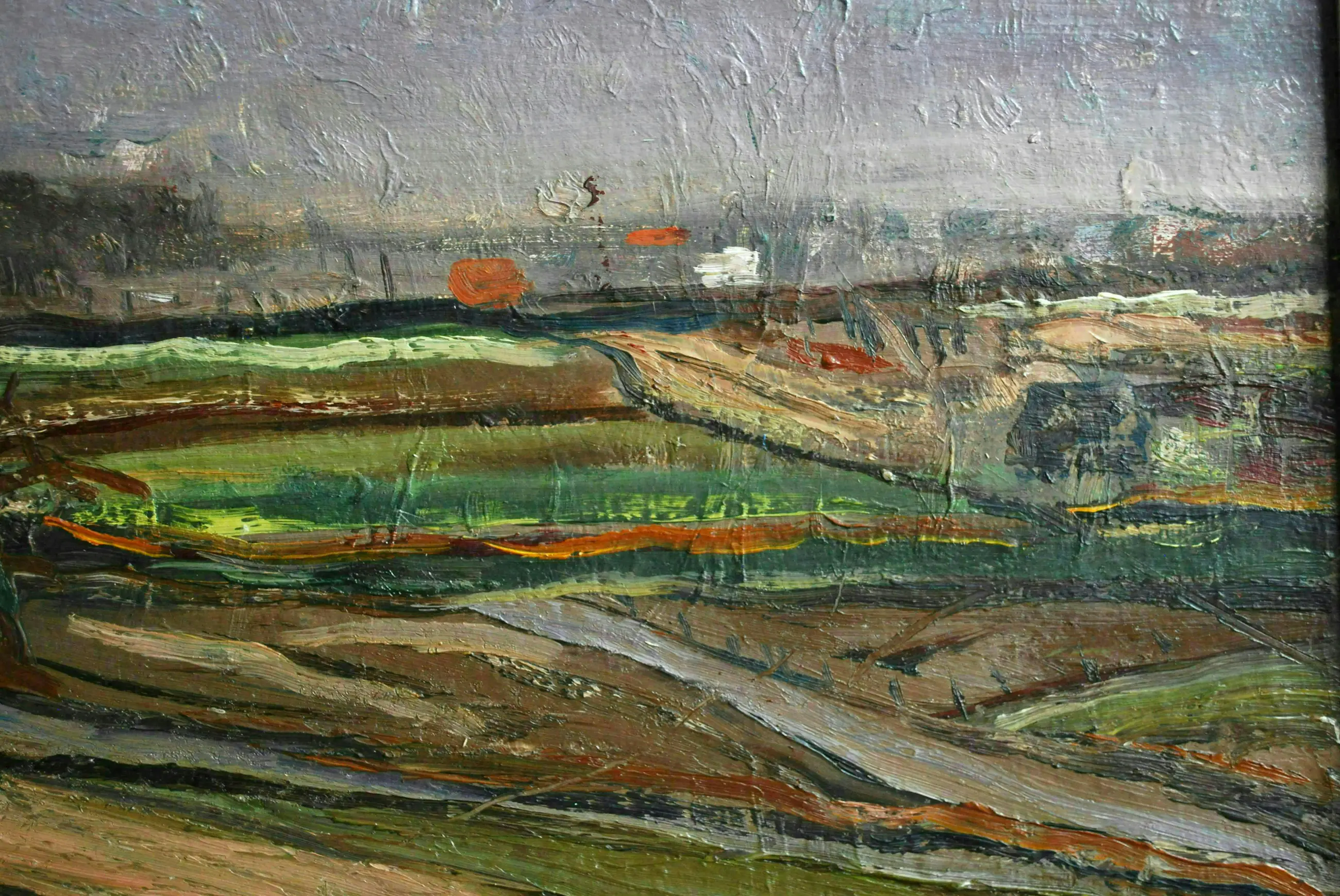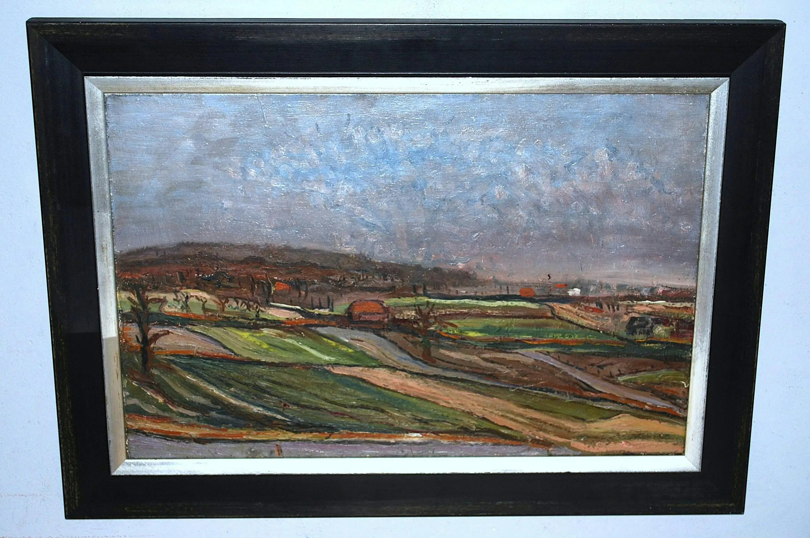 Dit zal de Gelderse vallei zijn, ca. jaren 40. Het linnen doek is genageld op een spieraam, initialen aan de achterzijde op een spielat. In een hoge kwaliteit houten lijst.