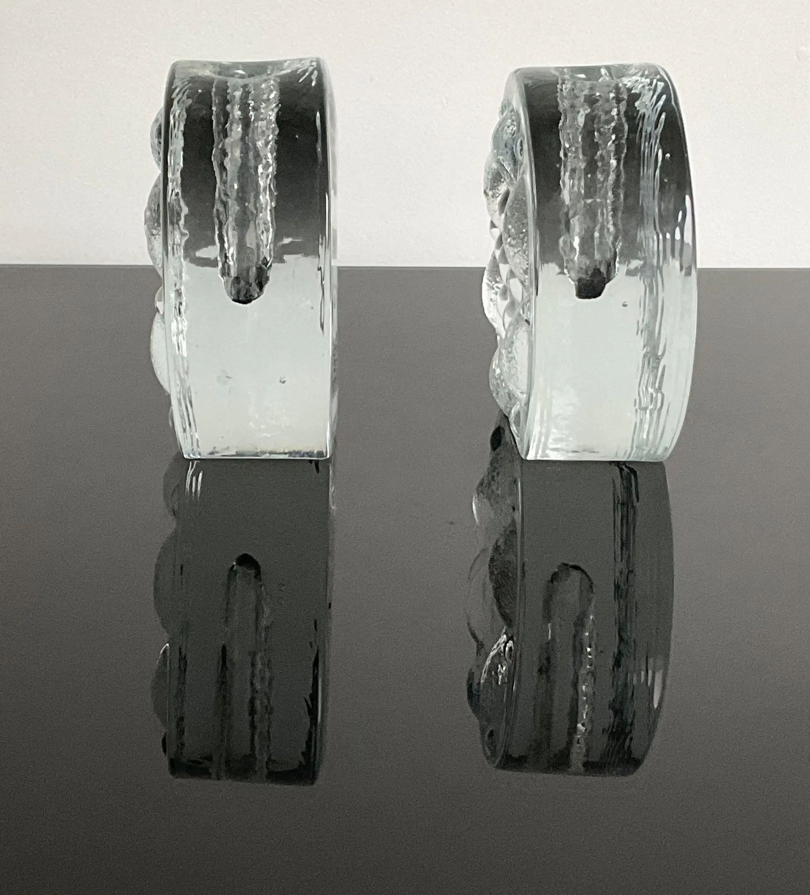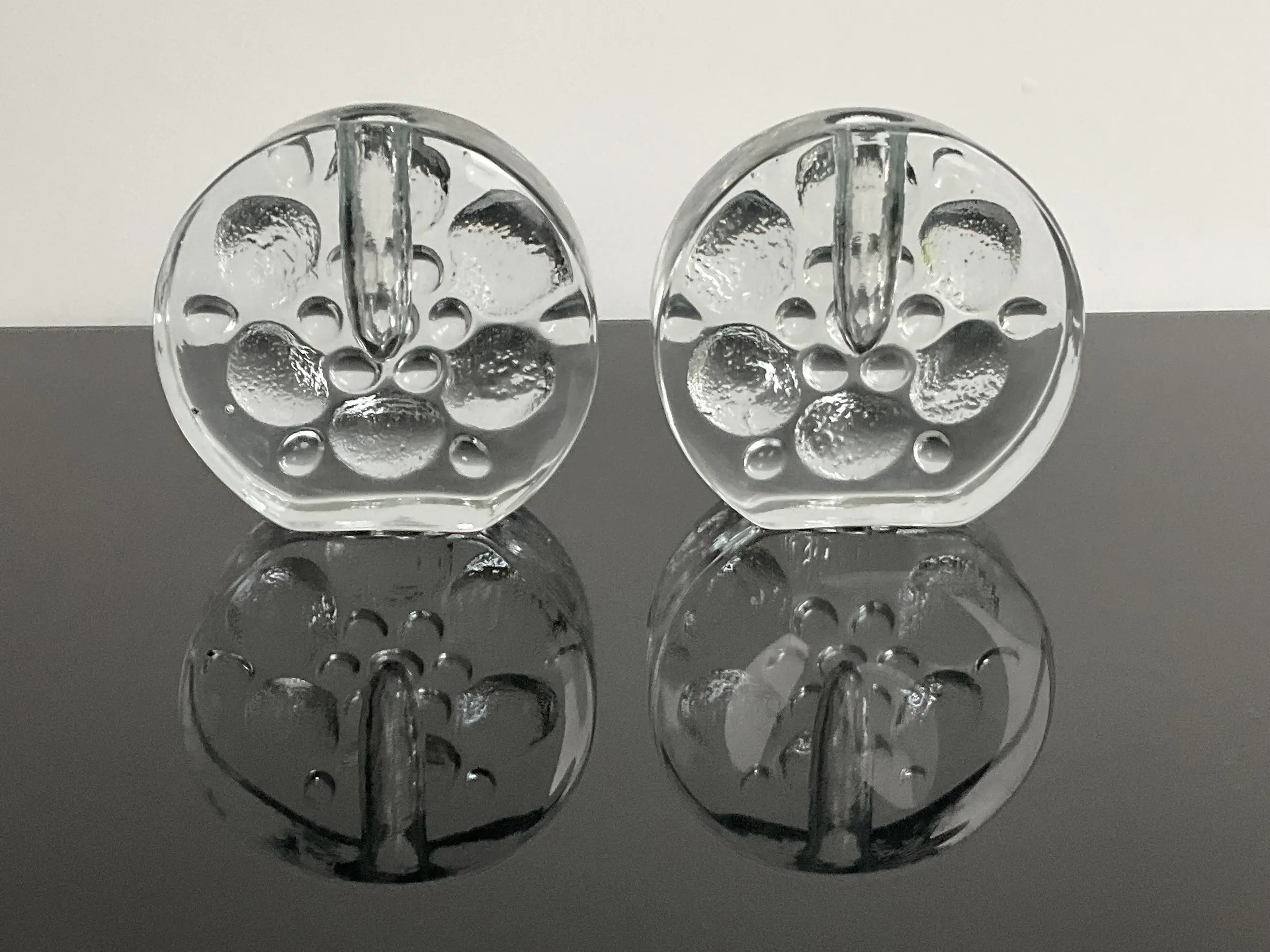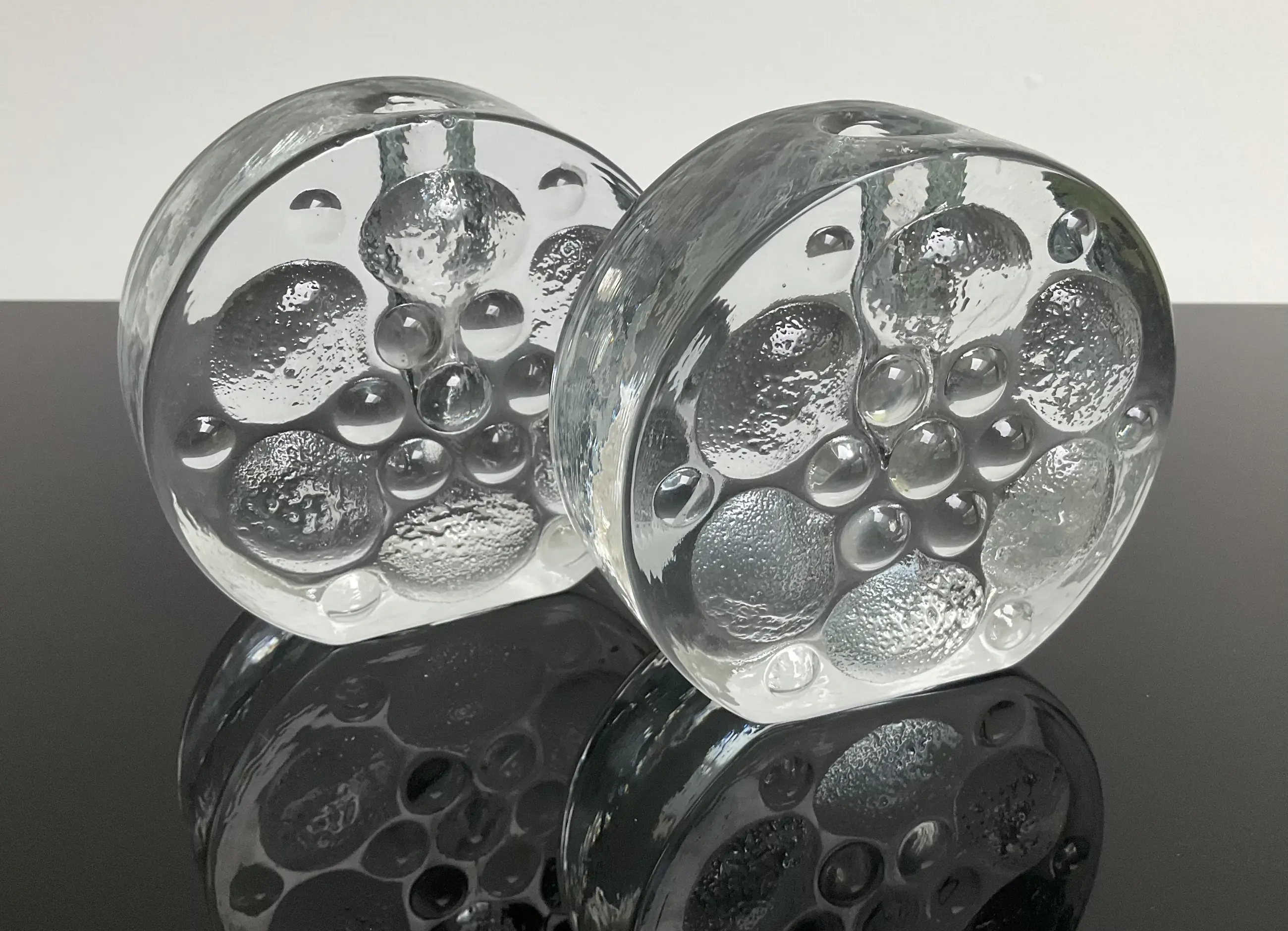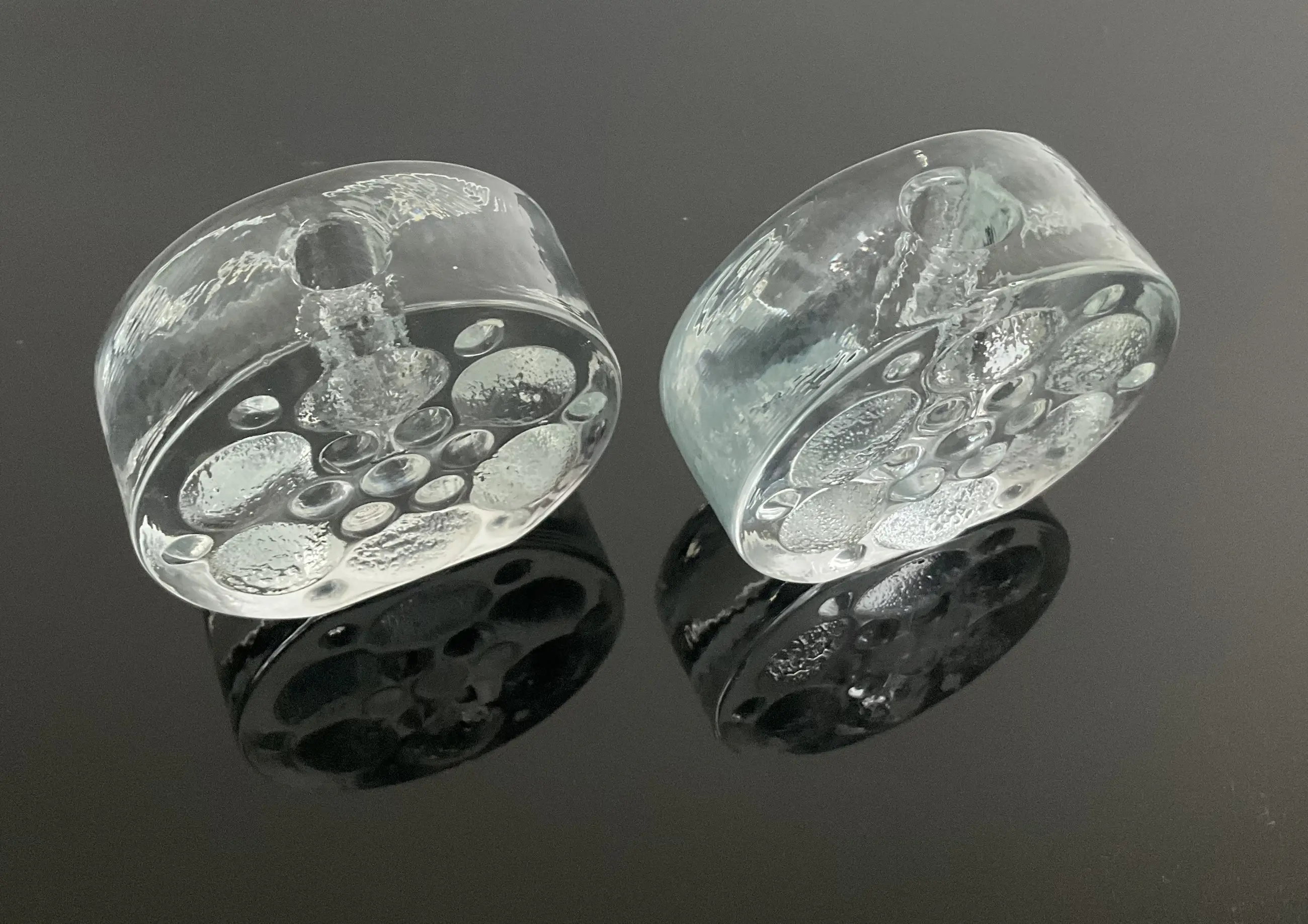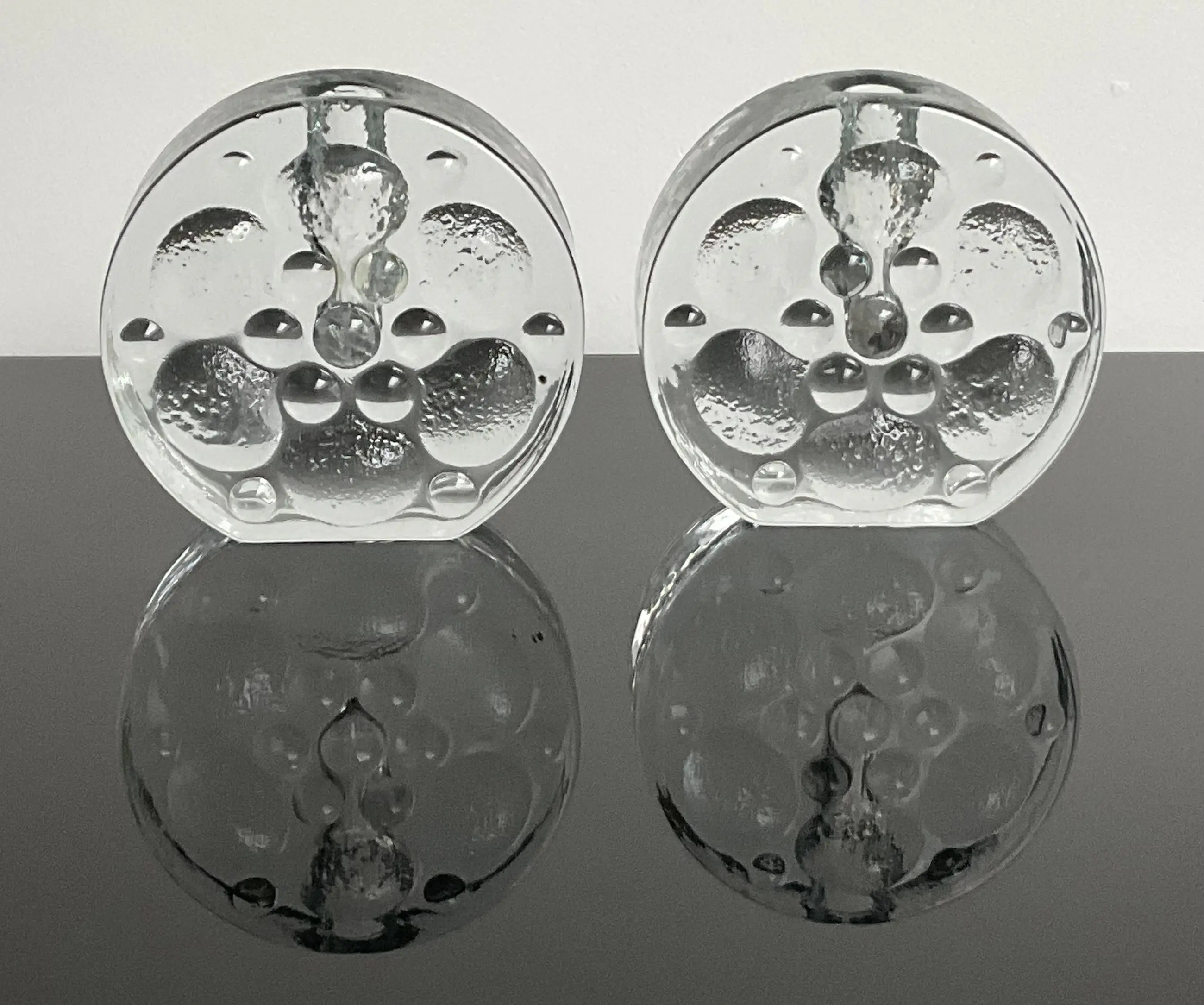 De twee vaasjes van persglas zijn een ontwerp uit de jaren 60 van Heiner Düsterhaus voor Walther glas. De vaasjes zijn aan de voorzijde gedecoreerd in de vorm van een bloem en zijn aan de achterzijde glad.