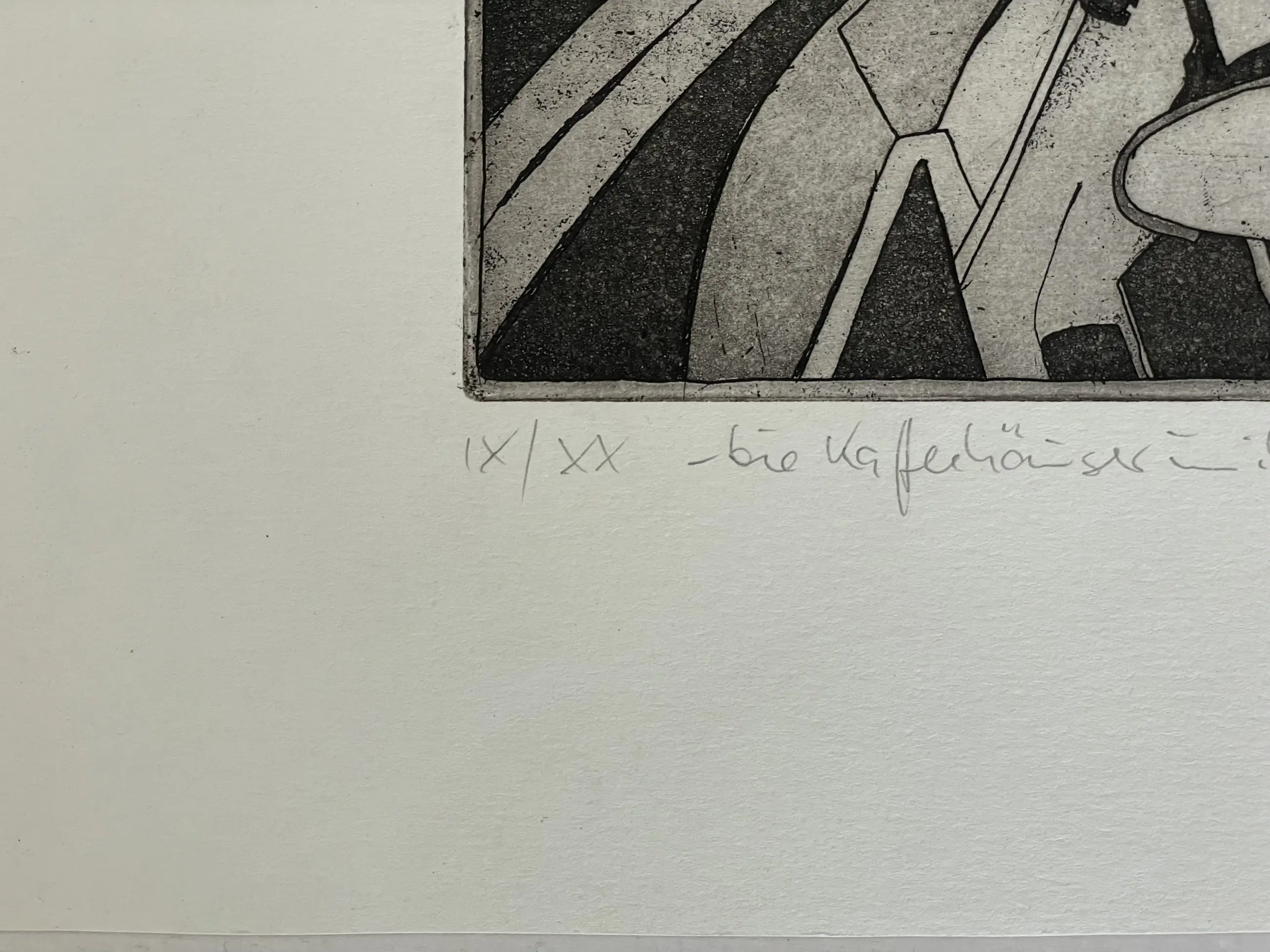 Een prachtige haast architecturale aquatint van Heiner Ulrich met als titel “die kaffeehäuser in ihrer verstrickung” uit de herfst van 1987 en genummerd ix/xx. Een tweede exemplaar is opgenomen in de collectie van de Kunsthalle der Sparkasse Leipzig. Het werk is in prachtige conditie en altijd vlak bewaard.