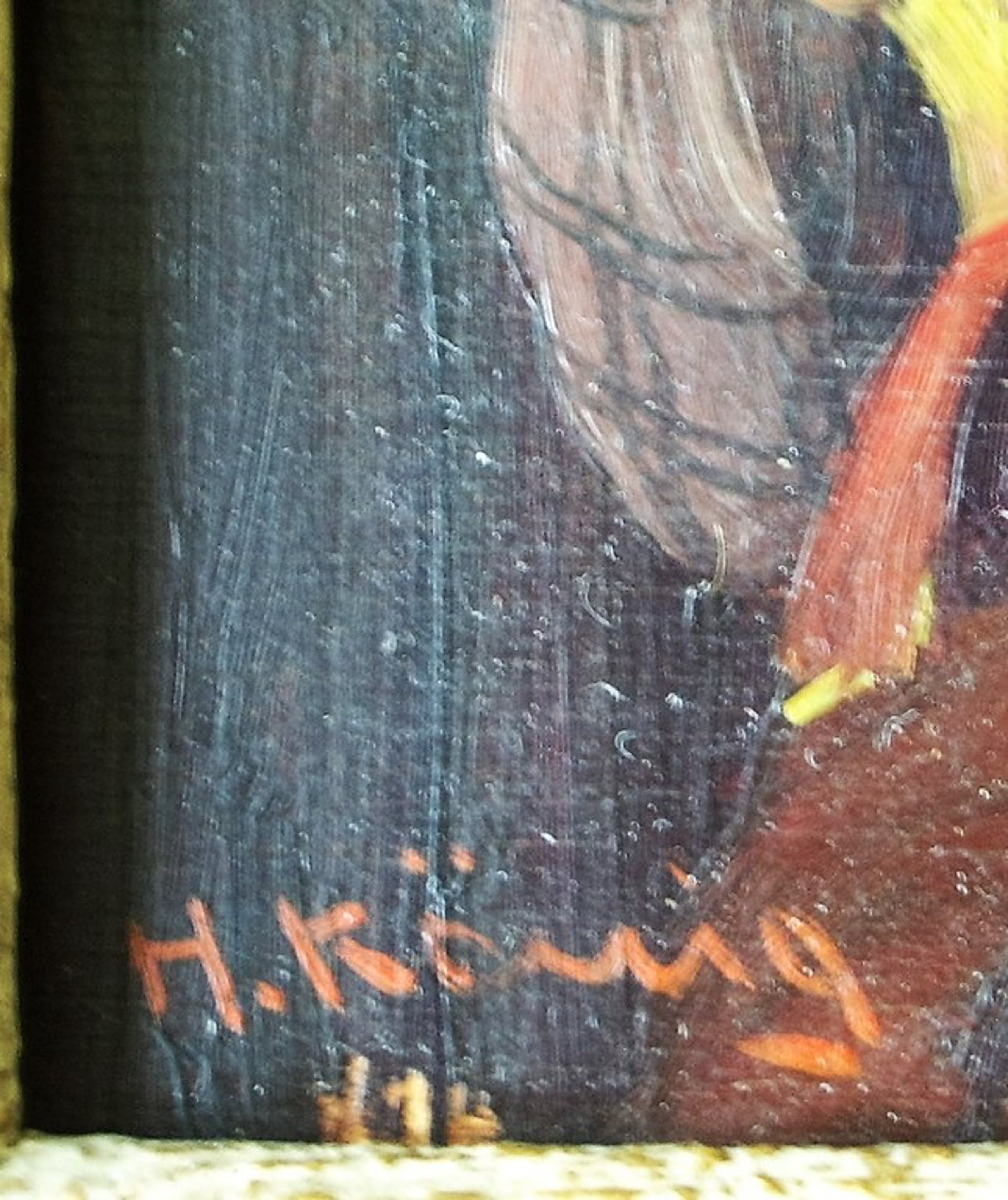 Heinrich König ( * 1821 Weener ) was kunstenaar en leraar. Na 1854 werkte hij in Duitsland. ( zie o.a. ook Scheen ) Zijn werk bevindt zich in diverse musea en privé-collecties. Kenmerkend is de grote expressive kracht, die van zijn werk uitgaat. Dit portret is daarvan een karakteristiek voorbeeld.Het schilderij is l.o. gesigneerd en gedateerd ( 1874 ) en is in uitstekende staat. De fraaie handgemaakte verdiepte lijst heeft enkele kleine gebruikssporen. Uit privé-bezit van verkoper.