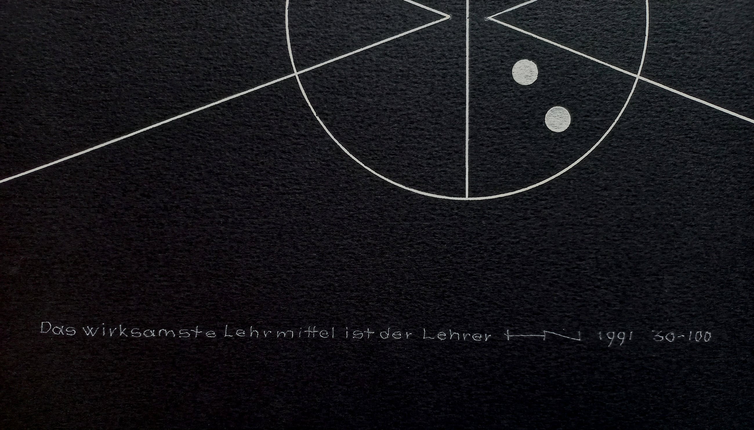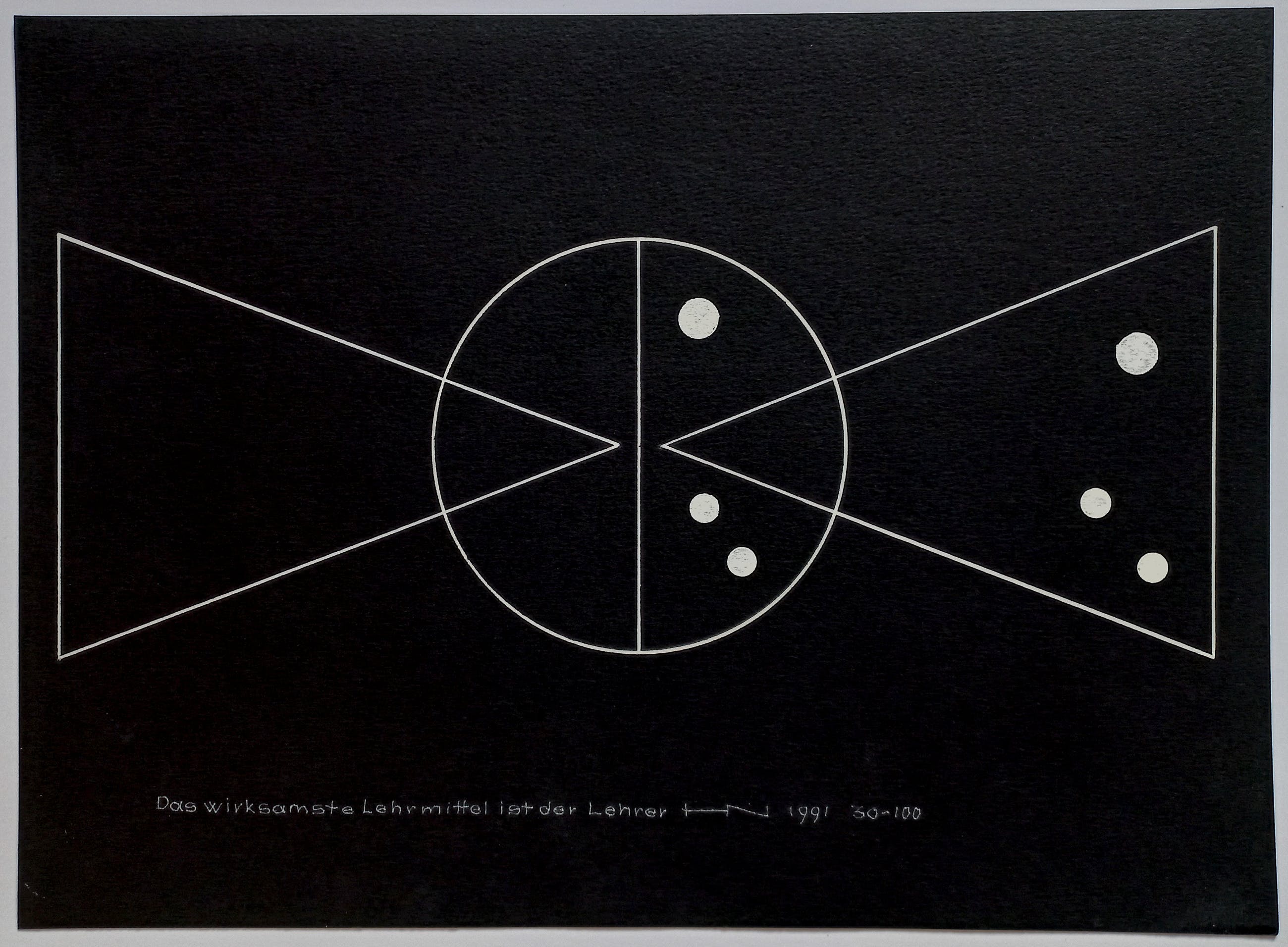 Strakke, geometrische compositie van de Duitser Heinrich Neuy, één van de jongste Bauhaus kunstenaars. Zeefdruk op zwart papier uit de serie Beweisende Malerei, gemonogrammeerd, gedateerd (1991) en genummerd (30-100). In uitstekende conditie.