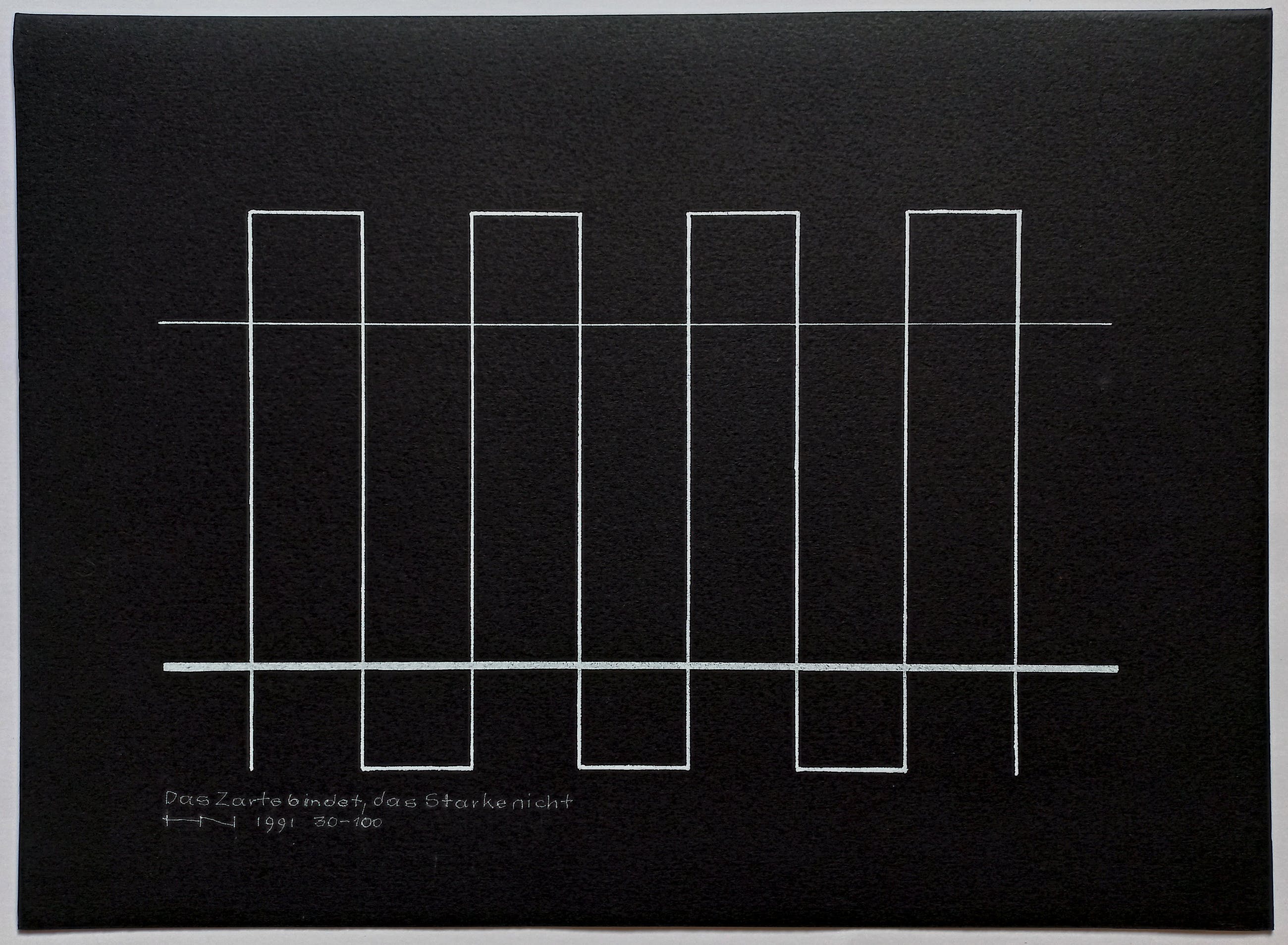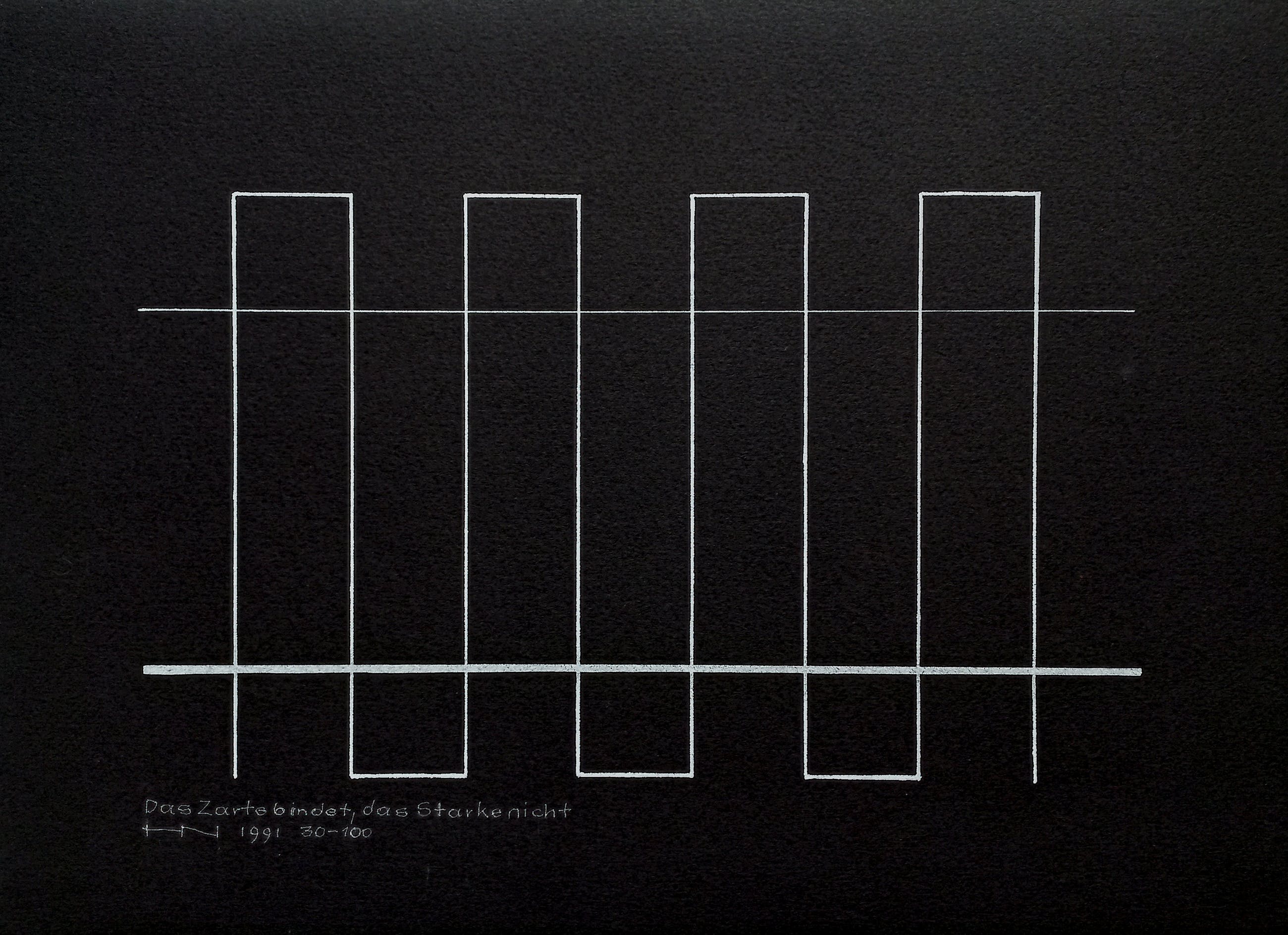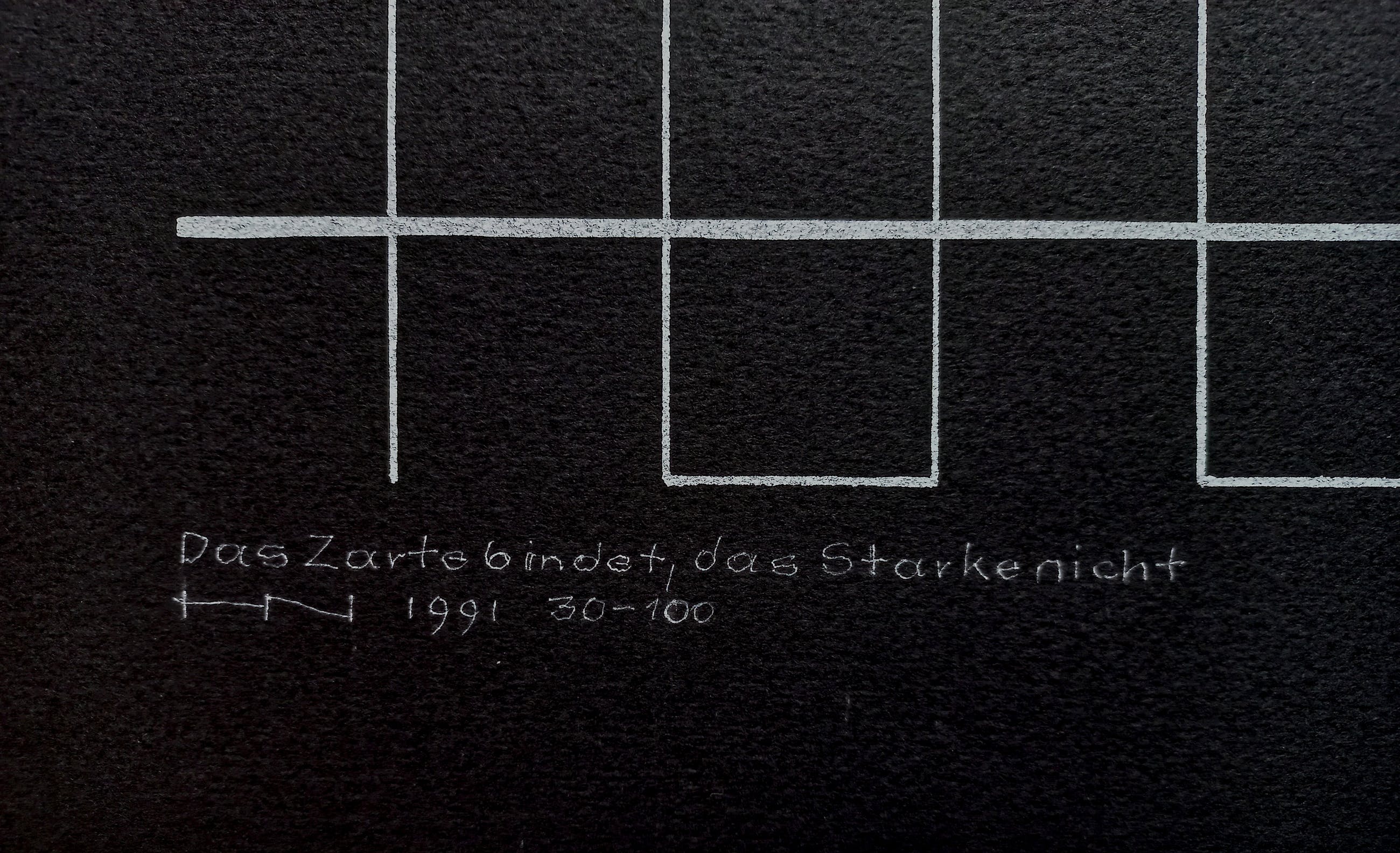 Strakke, geometrische compositie van de Duitser Heinrich Neuy, één van de jongste Bauhaus kunstenaars. Zeefdruk op zwart papier uit de serie Beweisende Malerei, gemonogrammeerd, gedateerd (1991) en genummerd (30-100). In uitstekende conditie.