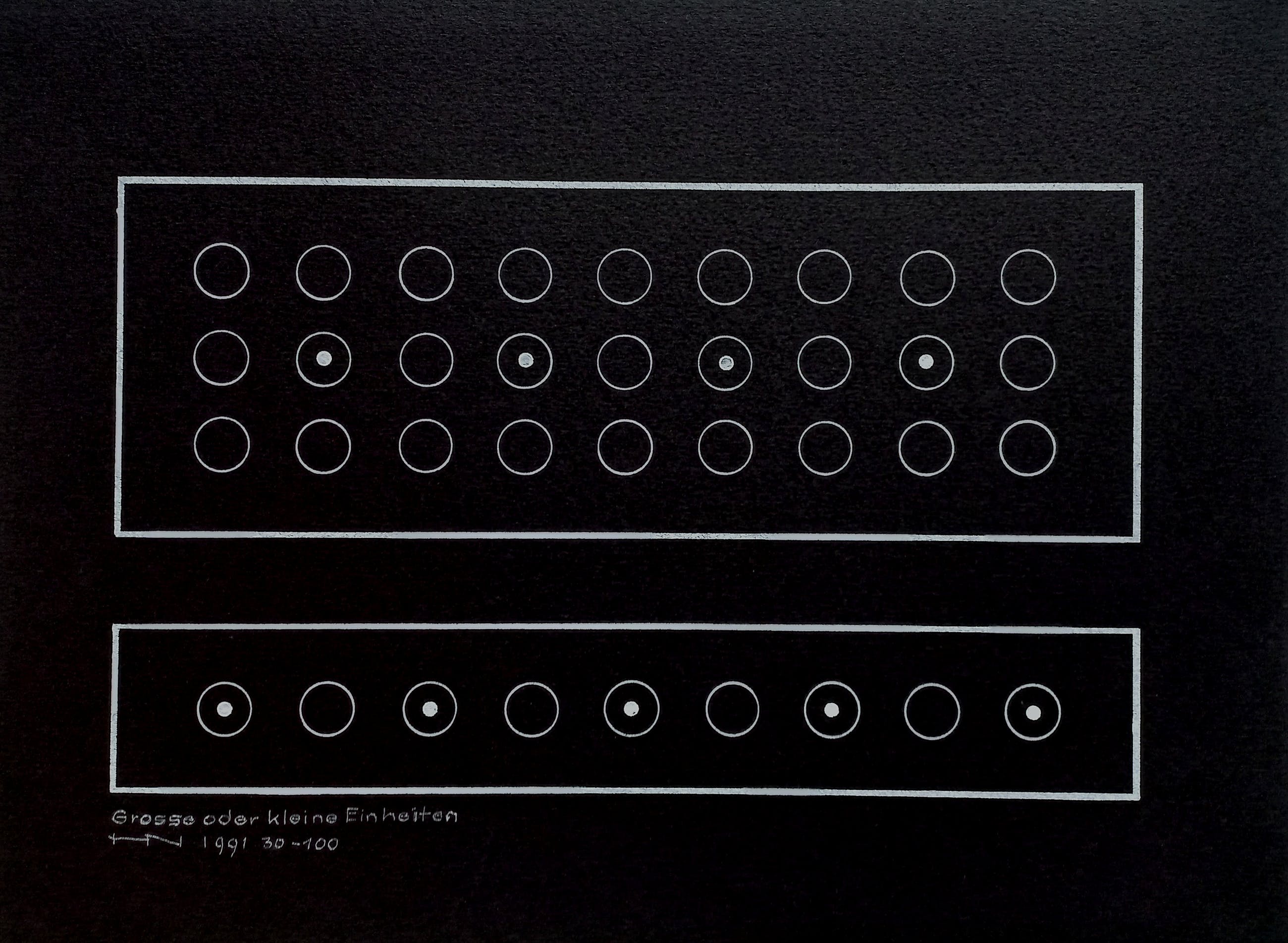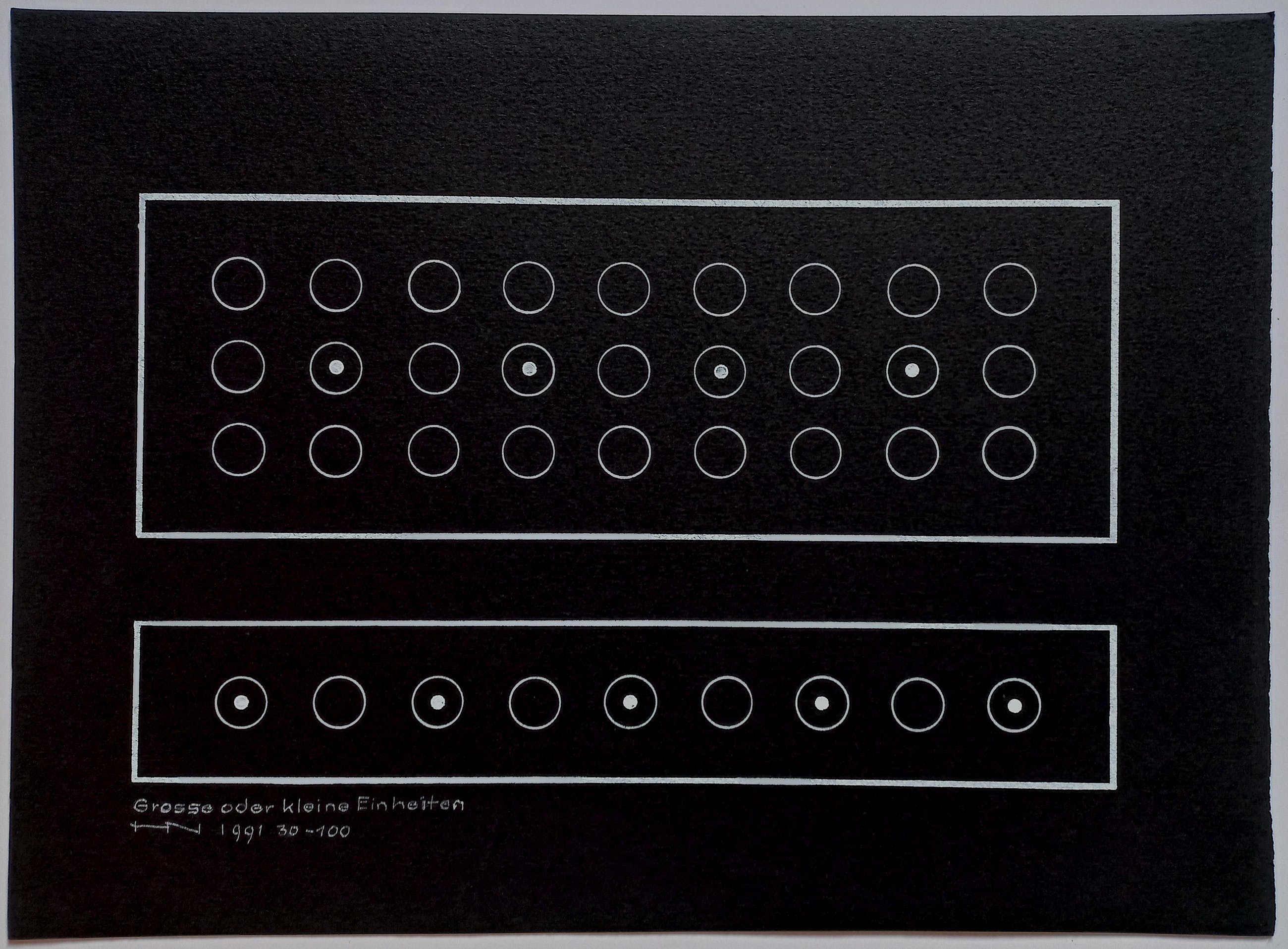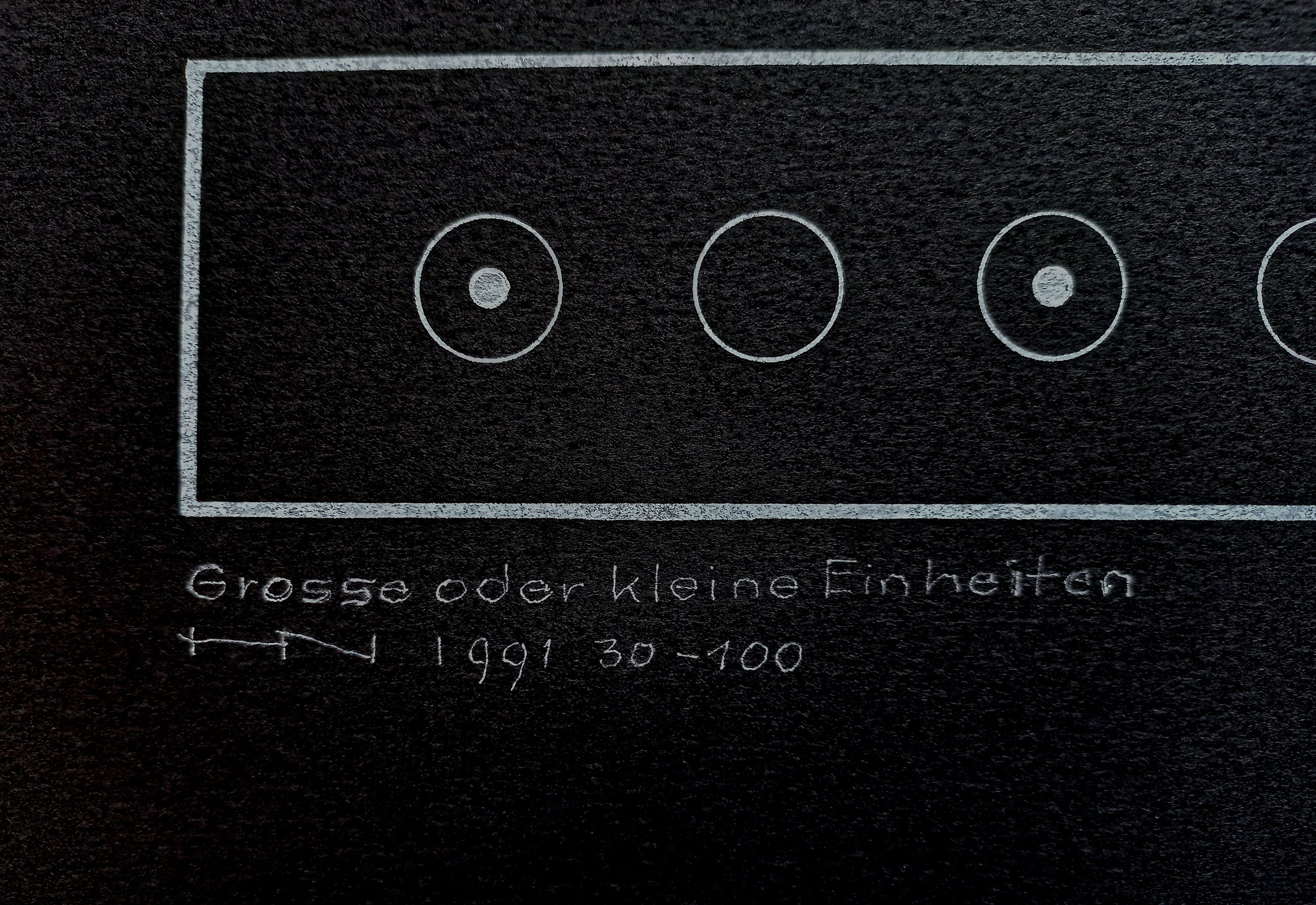 Strakke, geometrische compositie van de Duitser Heinrich Neuy, één van de jongste Bauhaus kunstenaars. Zeefdruk op zwart papier uit de serie Beweisende Malerei, gemonogrammeerd, gedateerd (1991) en genummerd (30-100). In uitstekende conditie.