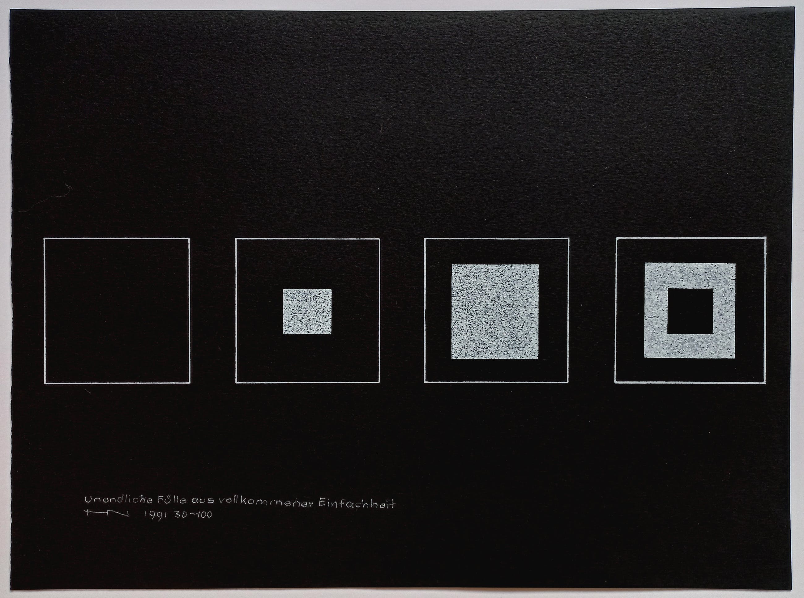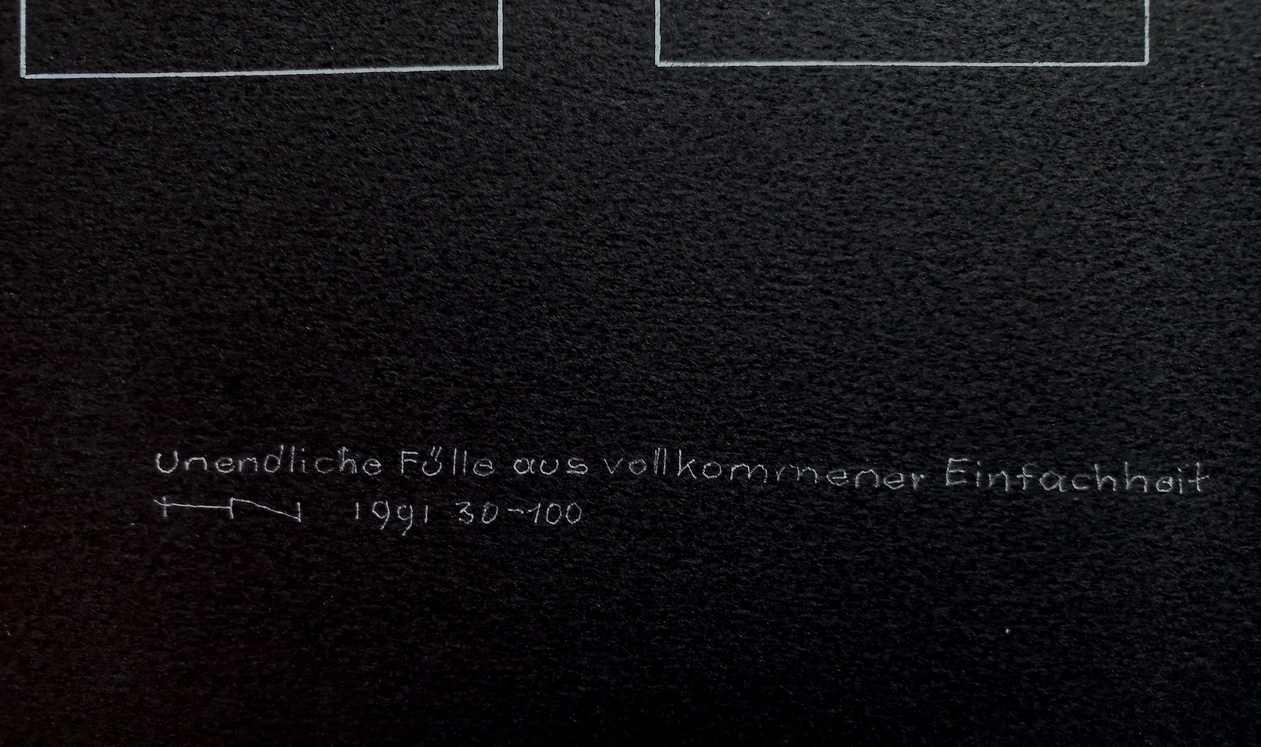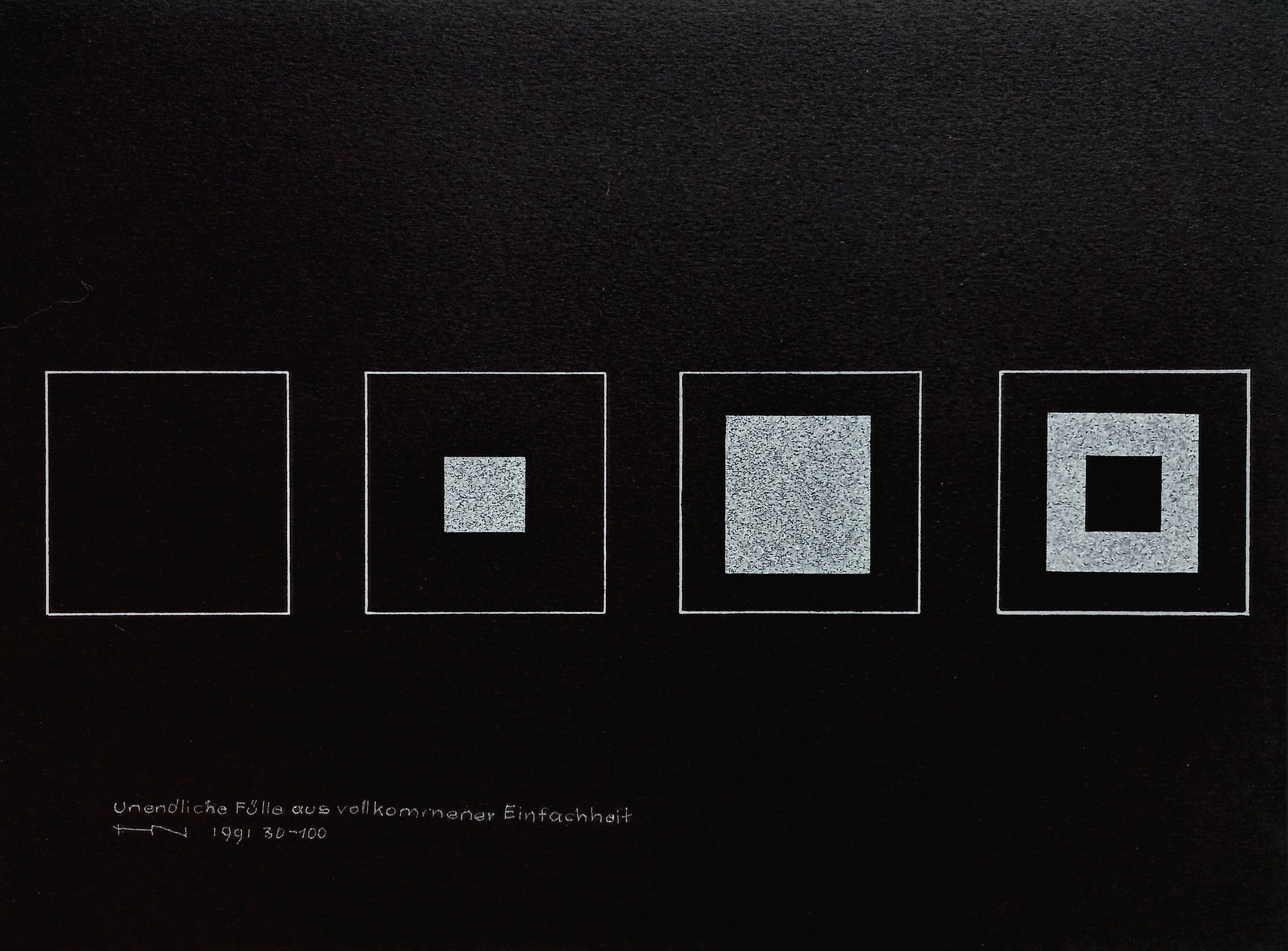 Strakke, geometrische compositie van de Duitser Heinrich Neuy, één van de jongste Bauhaus kunstenaars. Zeefdruk op zwart papier uit de serie Beweisende Malerei, gemonogrammeerd, gedateerd (1991) en genummerd (30-100). In uitstekende conditie.