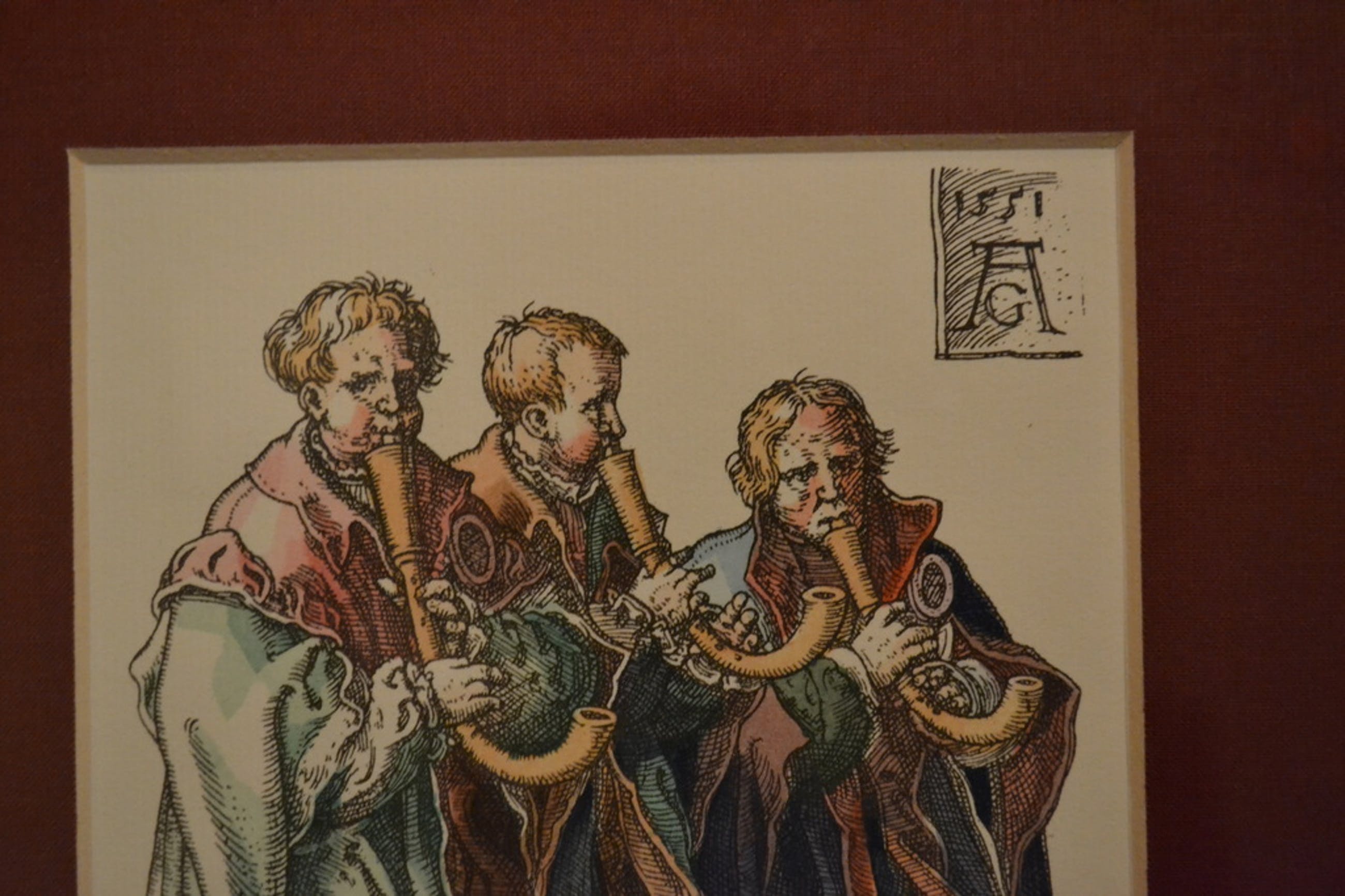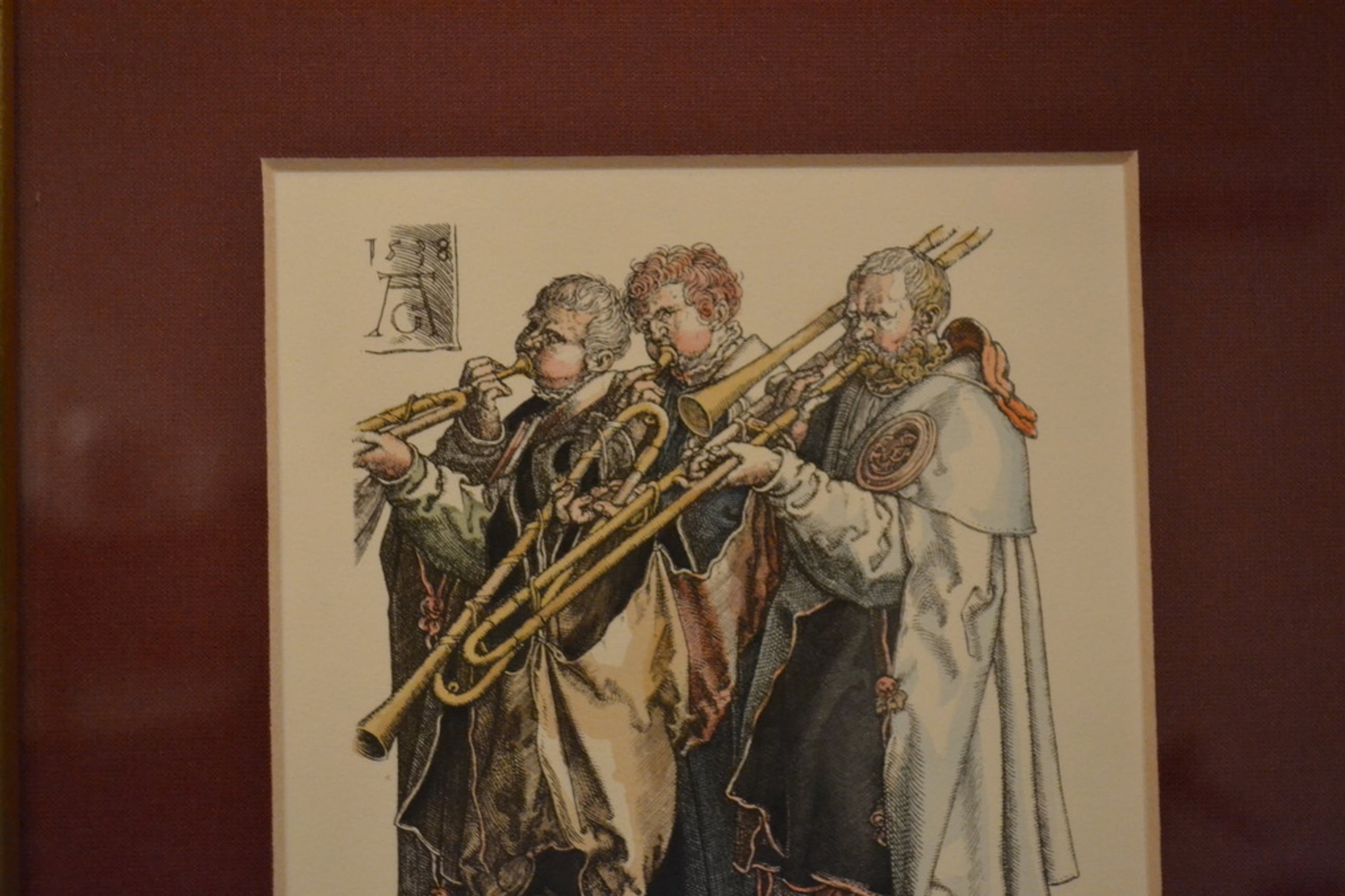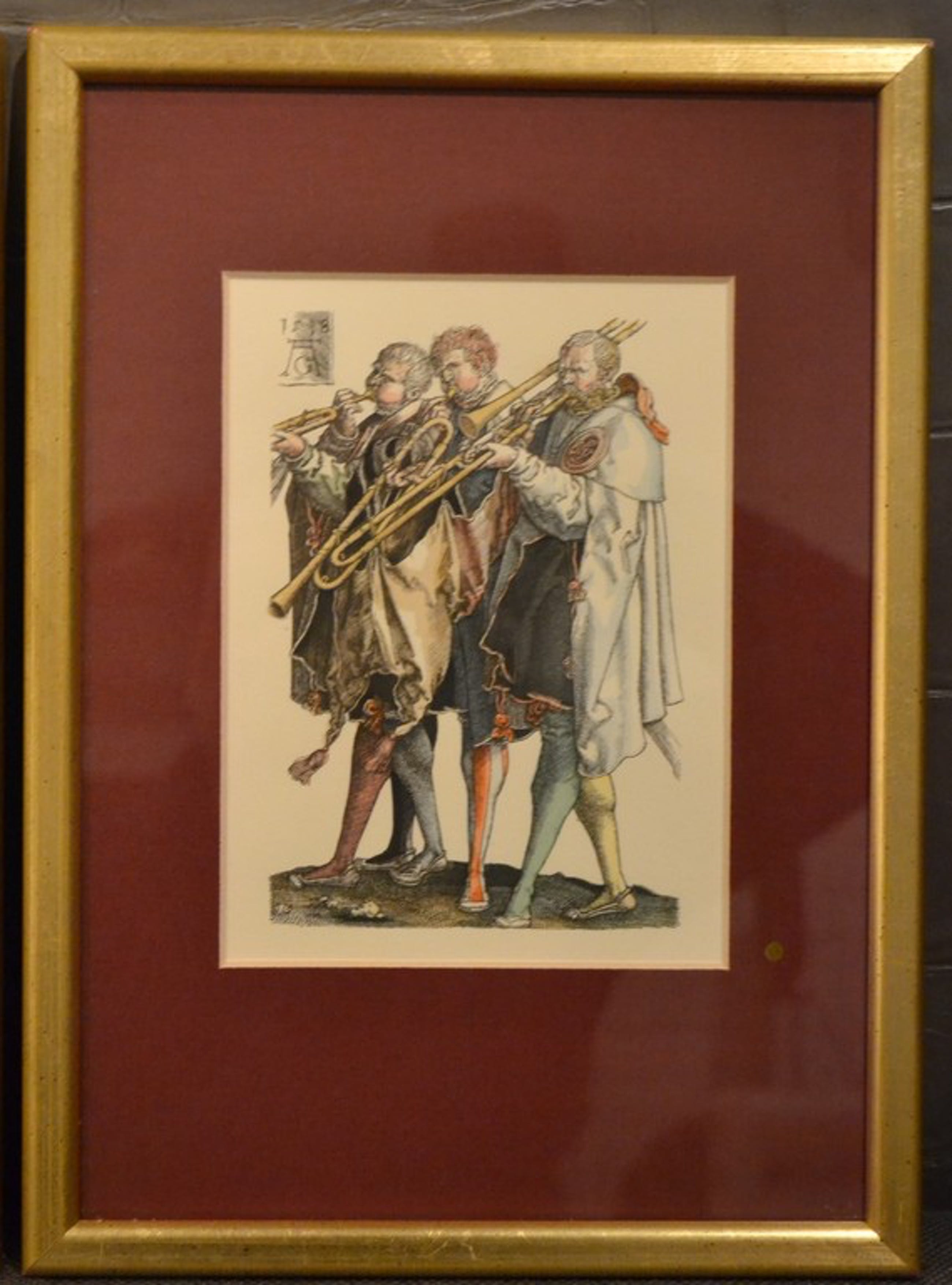 Twee prenten van Heinrich Aldegrever in kleur. Prent “Drie muzikanten die trombone spelen (1538)” en prent “Drie muzikanten (1551)”. Beide prenten zien er prachtig uit in zitten in een fraaie lijst met donkerrode passe-partout. Afmetingen lijst zijn 24x33,5 cm. Vermoedelijk 20ste eeuw gemaakt.