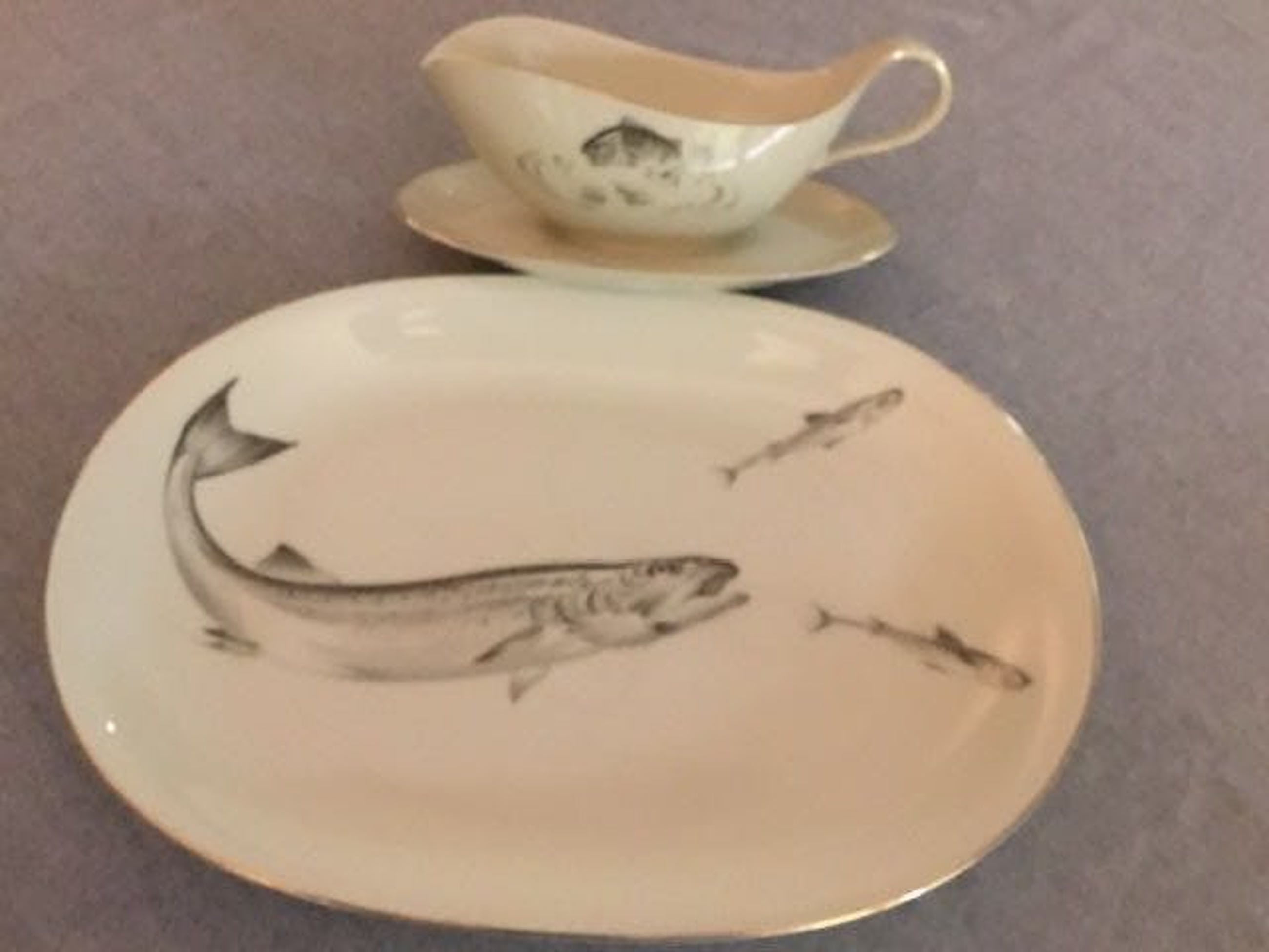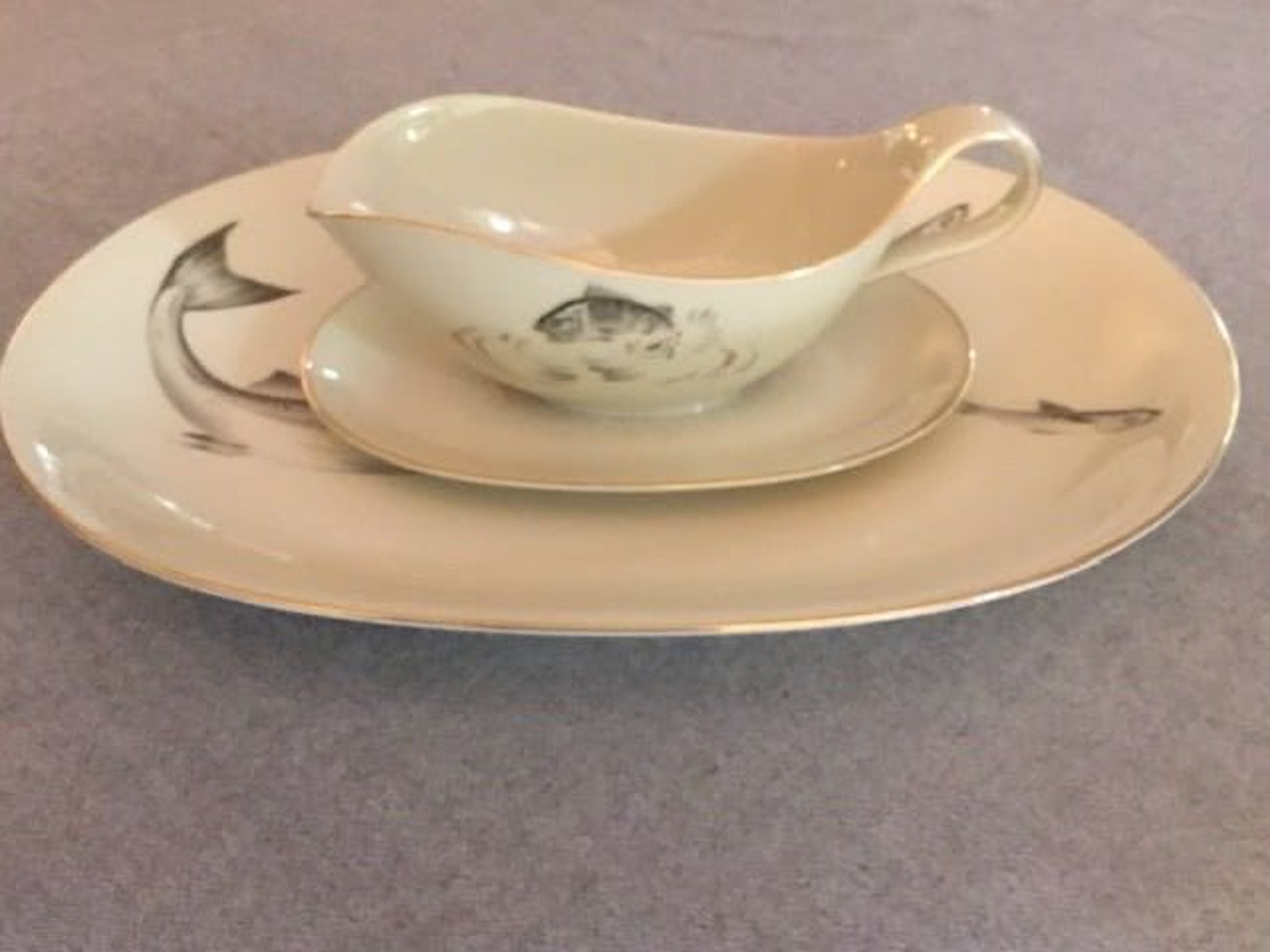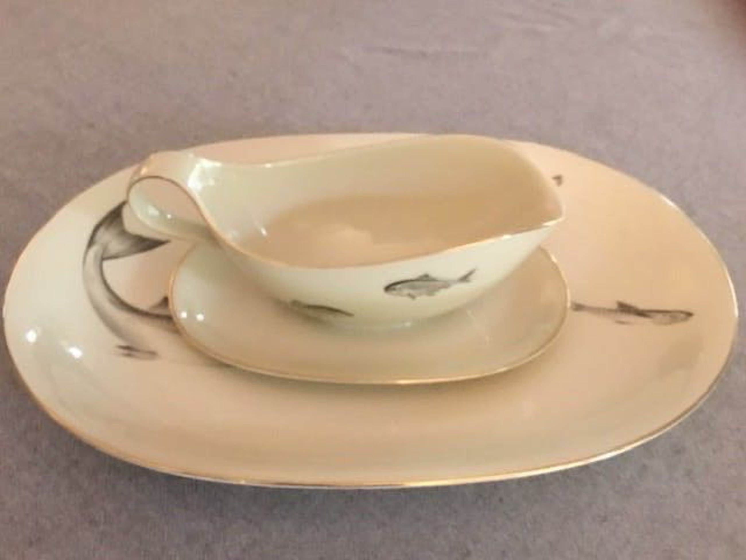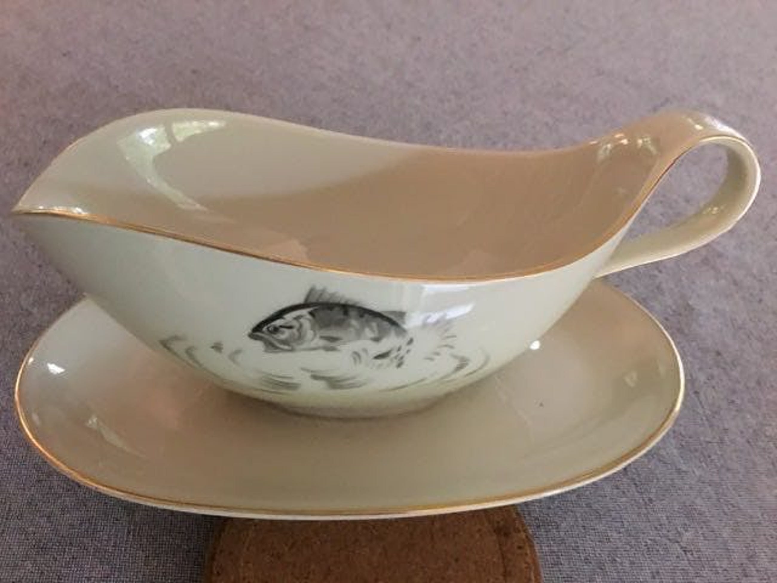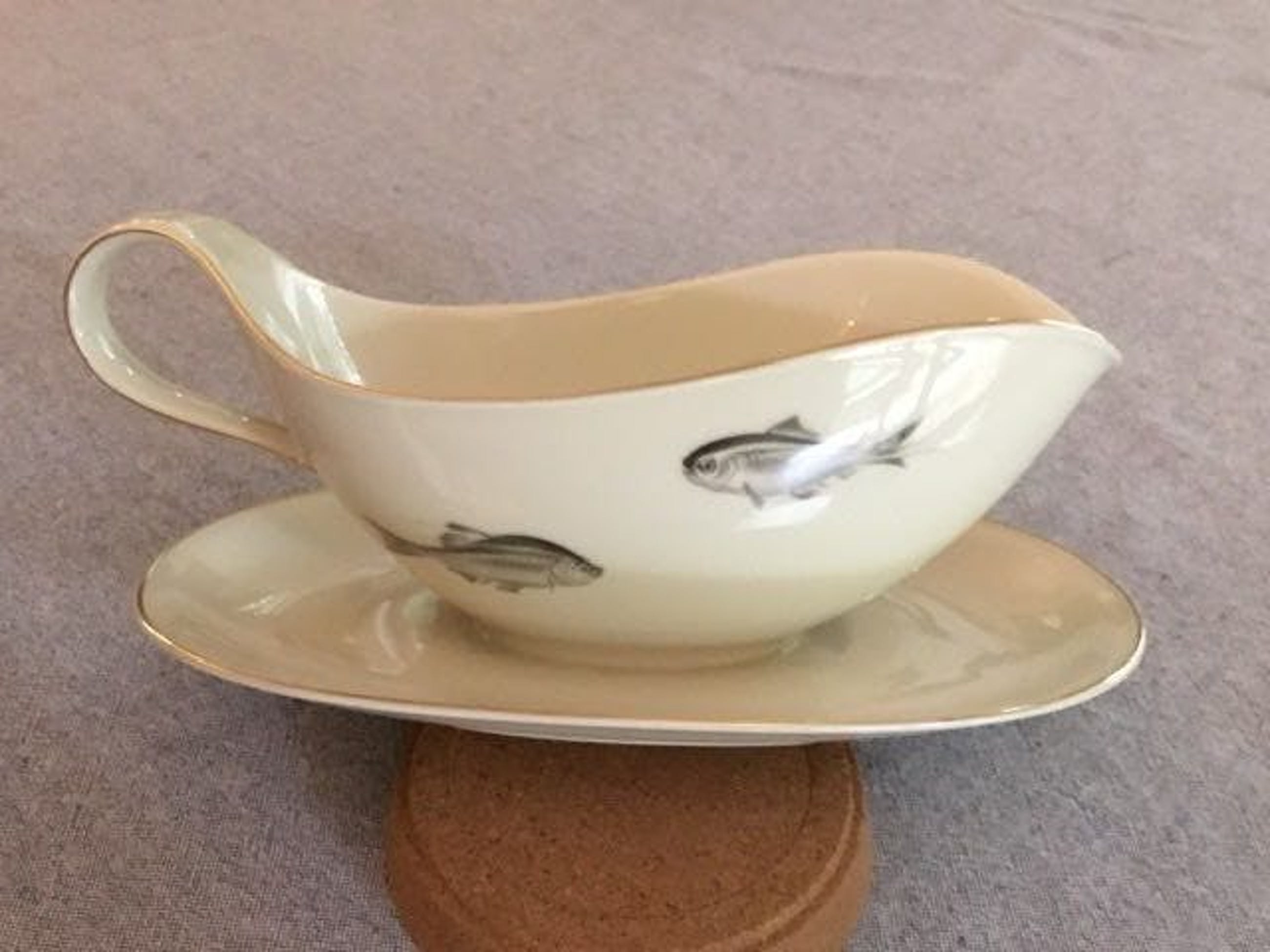 Elegante, fraai gedecoreerde porseleinen ivoorkleurige visschaal met bijbehorende genummerde saus-/jus-kom (#18623), volgens Anmut-ontwerp van Heinrich H&C (Selb - Bavaria).