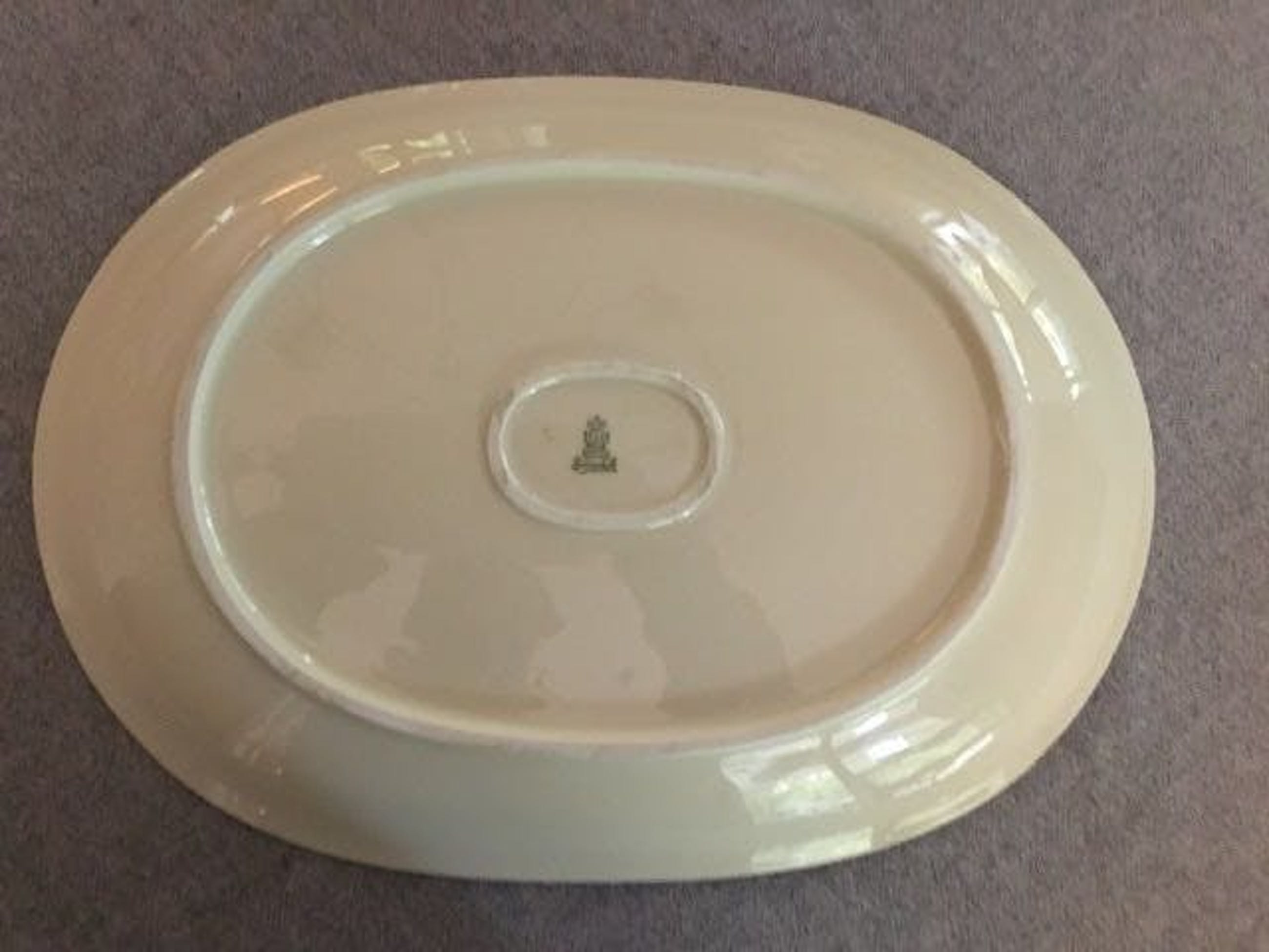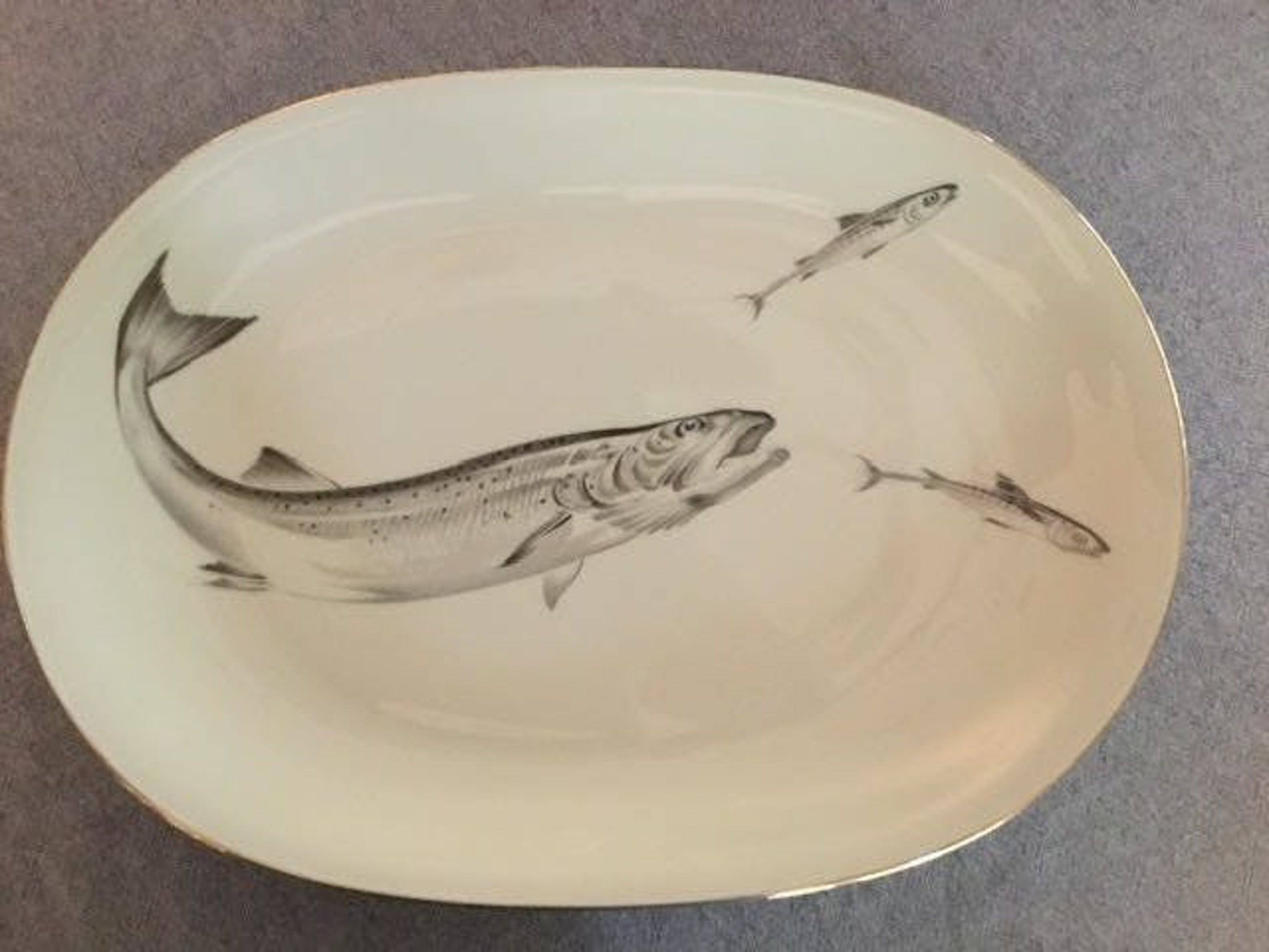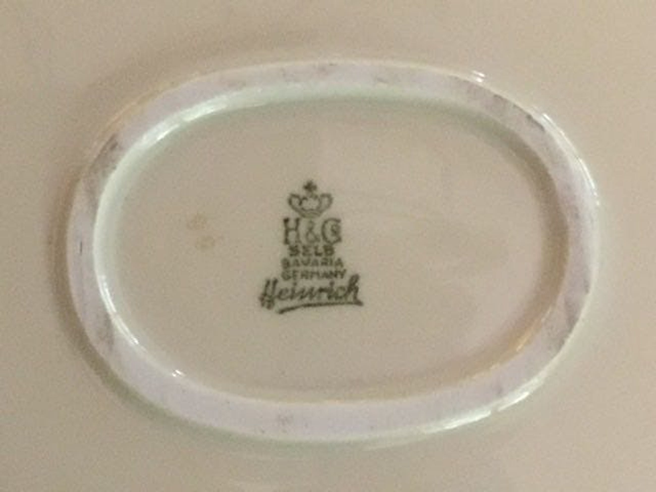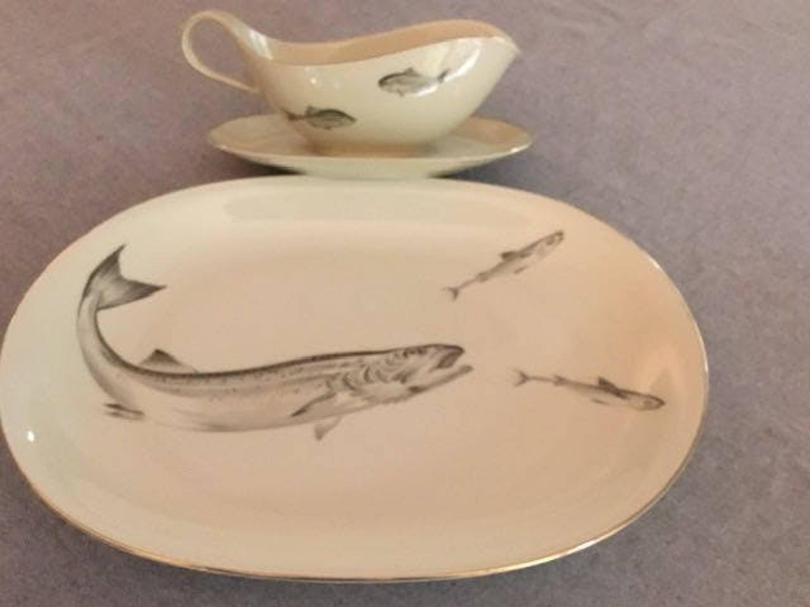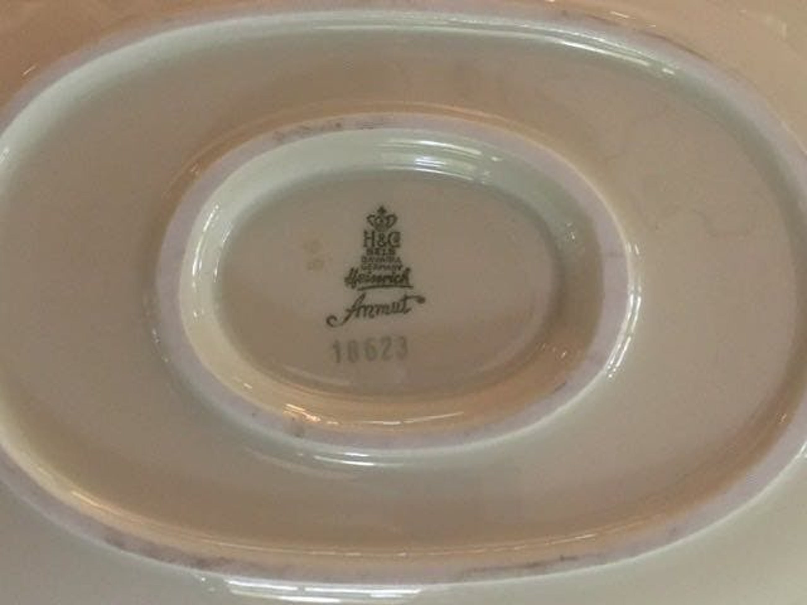 Elegante, fraai gedecoreerde porseleinen ivoorkleurige visschaal met bijbehorende genummerde saus-/jus-kom (#18623), volgens Anmut-ontwerp van Heinrich H&C (Selb - Bavaria).