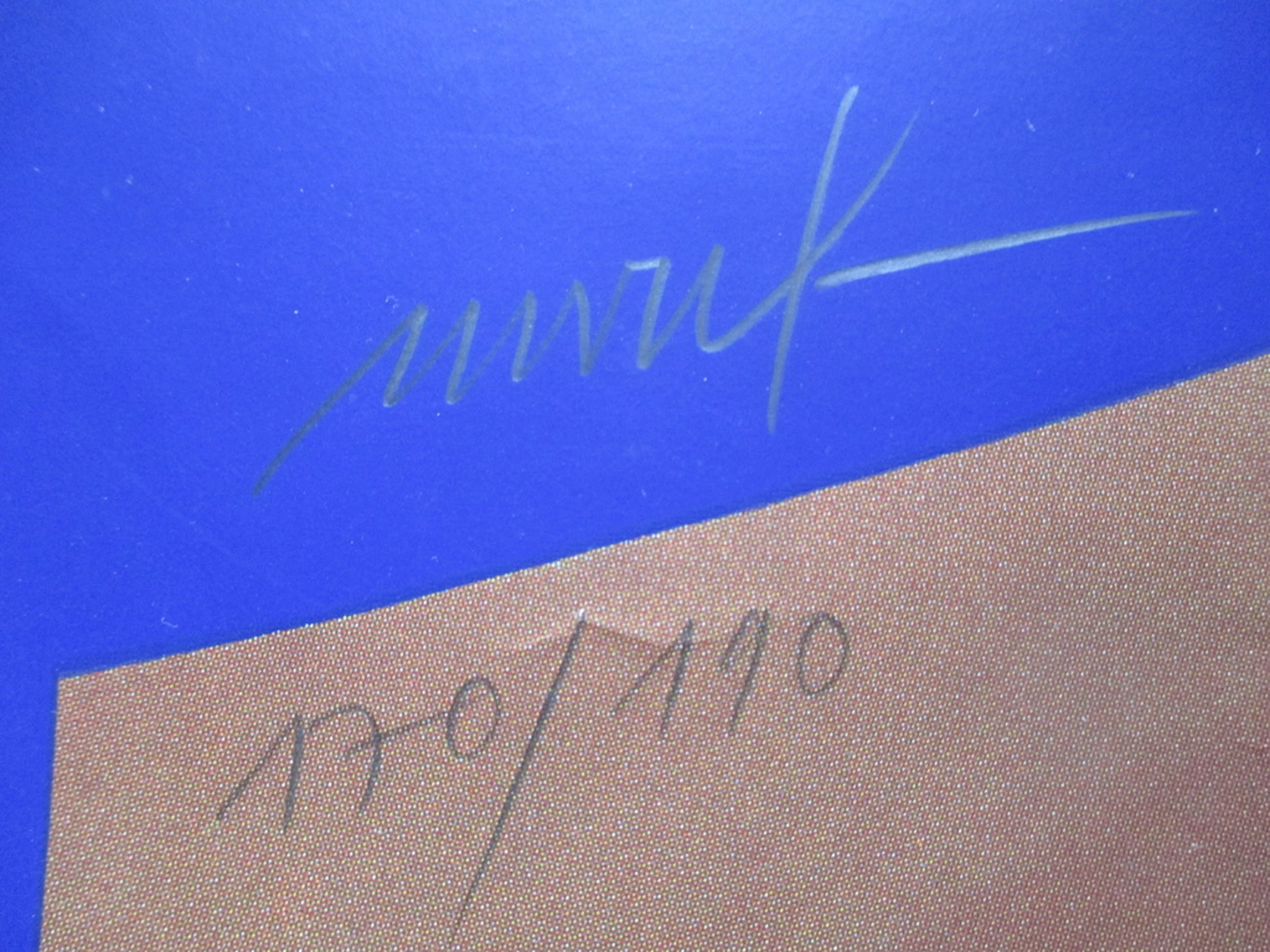 Grafiek (zeefdruk of ander soort print) van Heinz Mack?. Afmeting blad 75,5x105. Genummerd 170/190, gesigneerd in potlood. Conditie blad: zie foto 1.