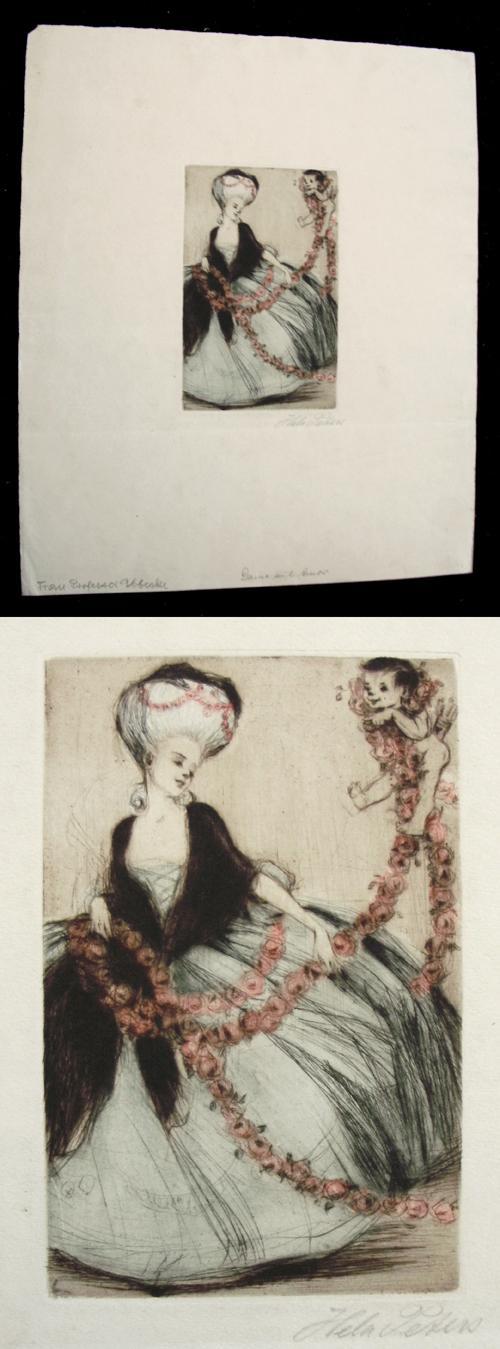 Hela Peters Ebbecke (1885-1973). Dame mit Amor, Farbradierung, um 1920.