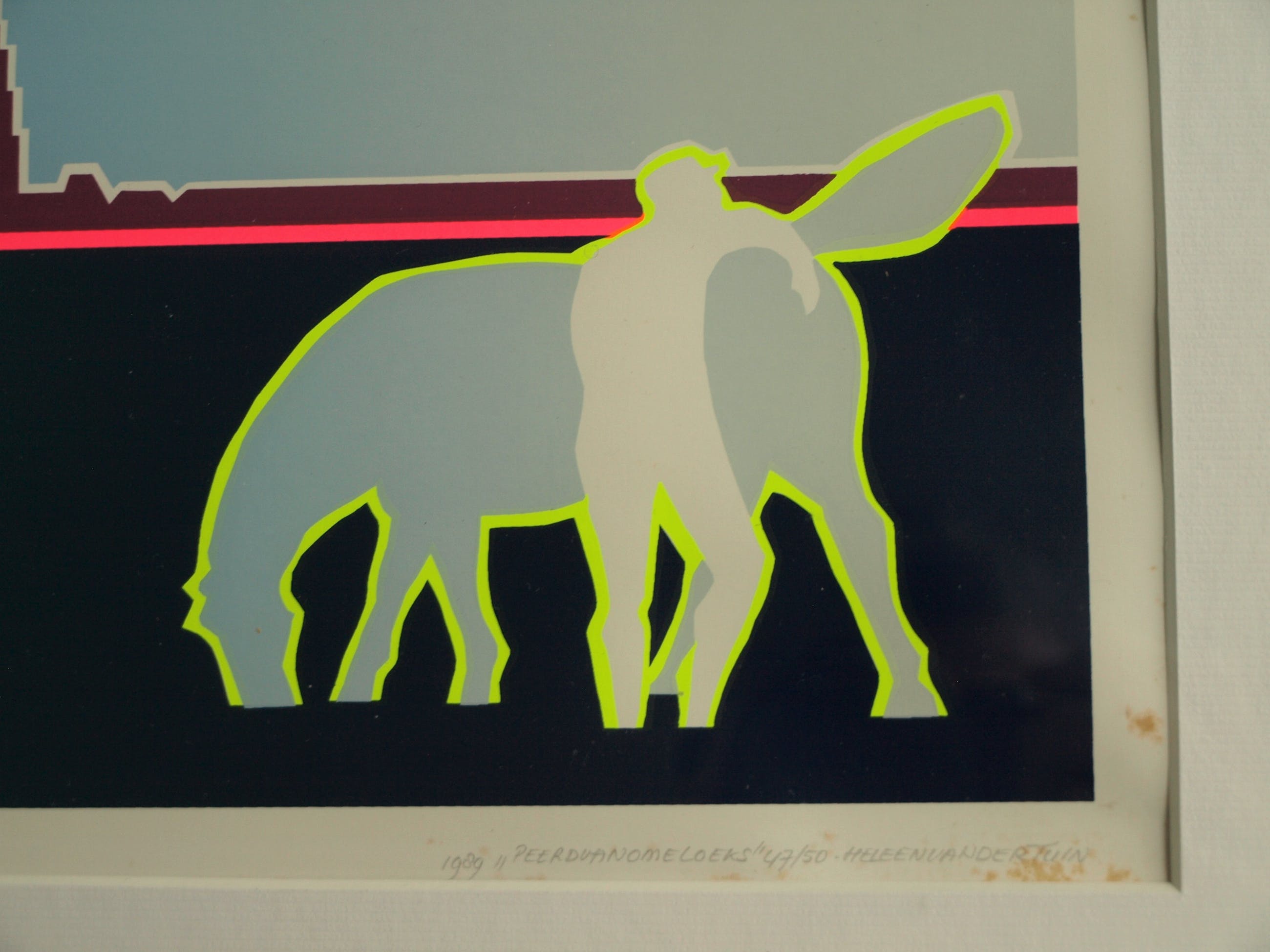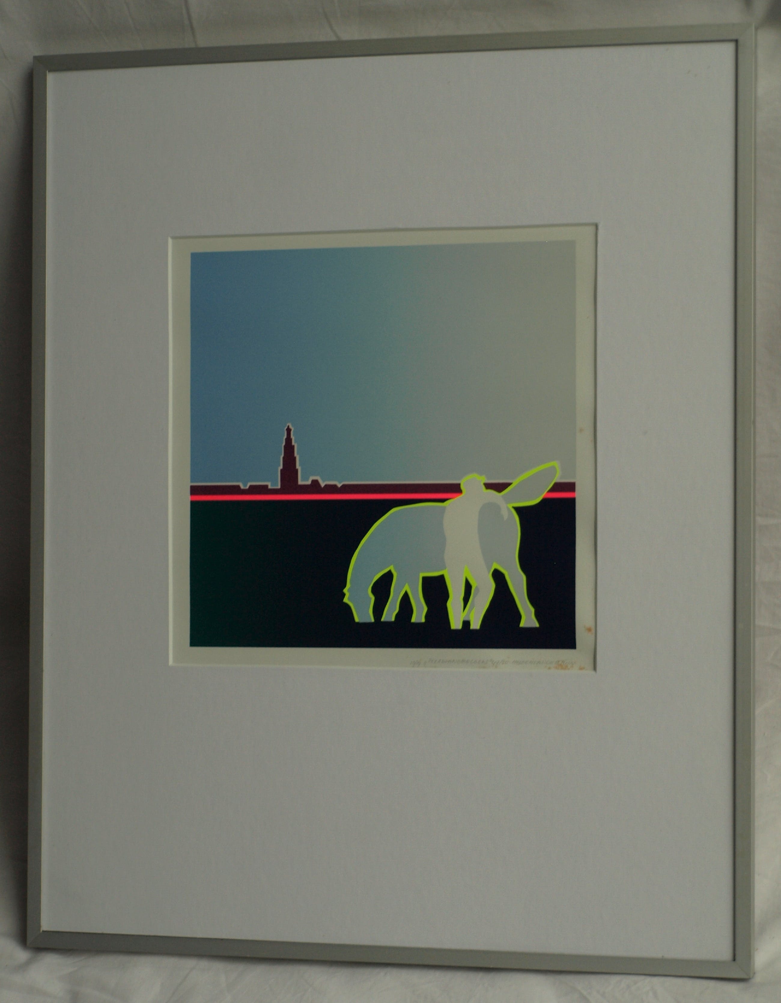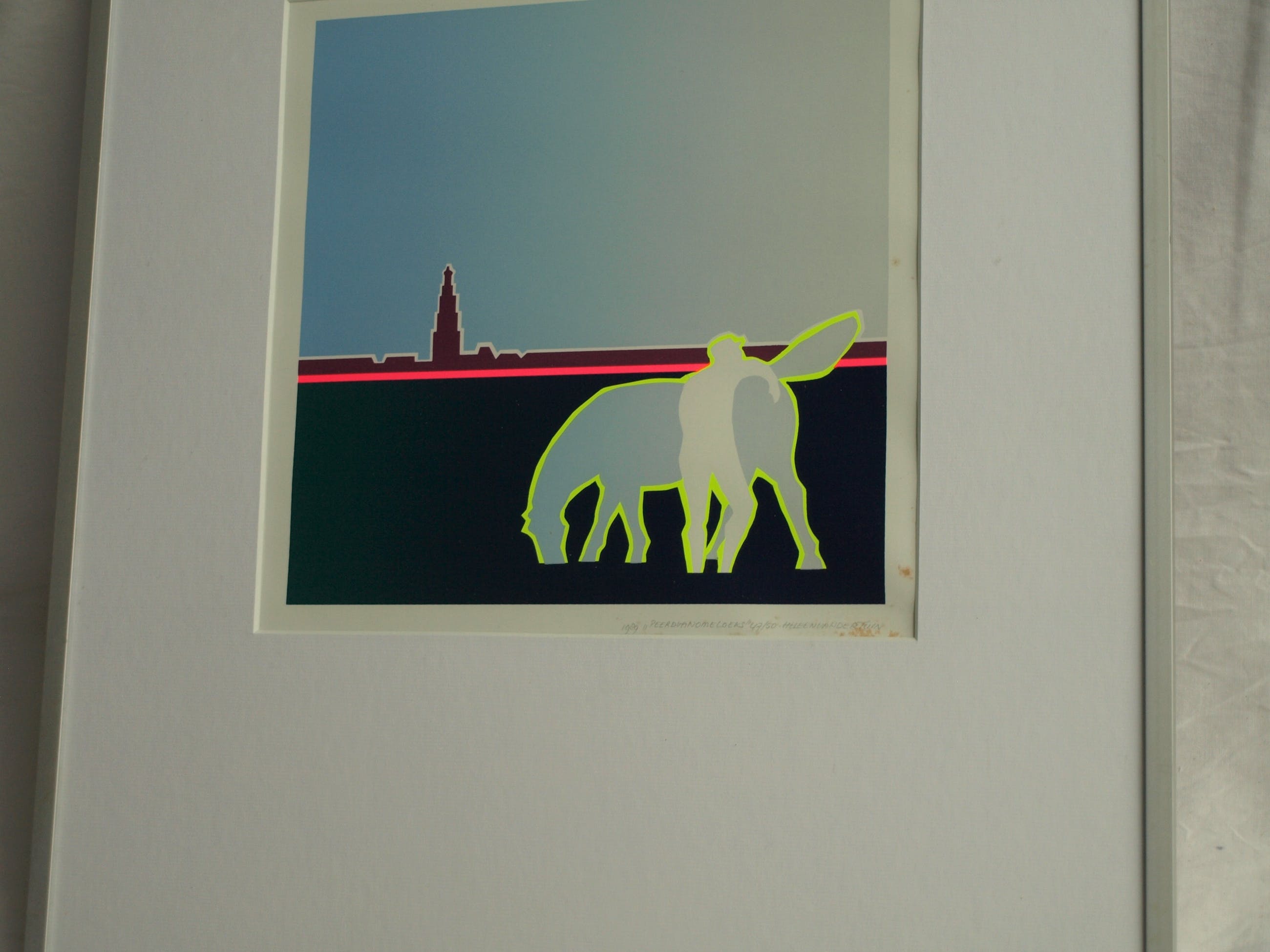 Een ingelijste zeefdruk van de Groningsese kunstenares Heleen van der Tuin (1945), getiteld "Peerd van Ome Loeks", met op de achtergrond de Martini-toren in Groningen.