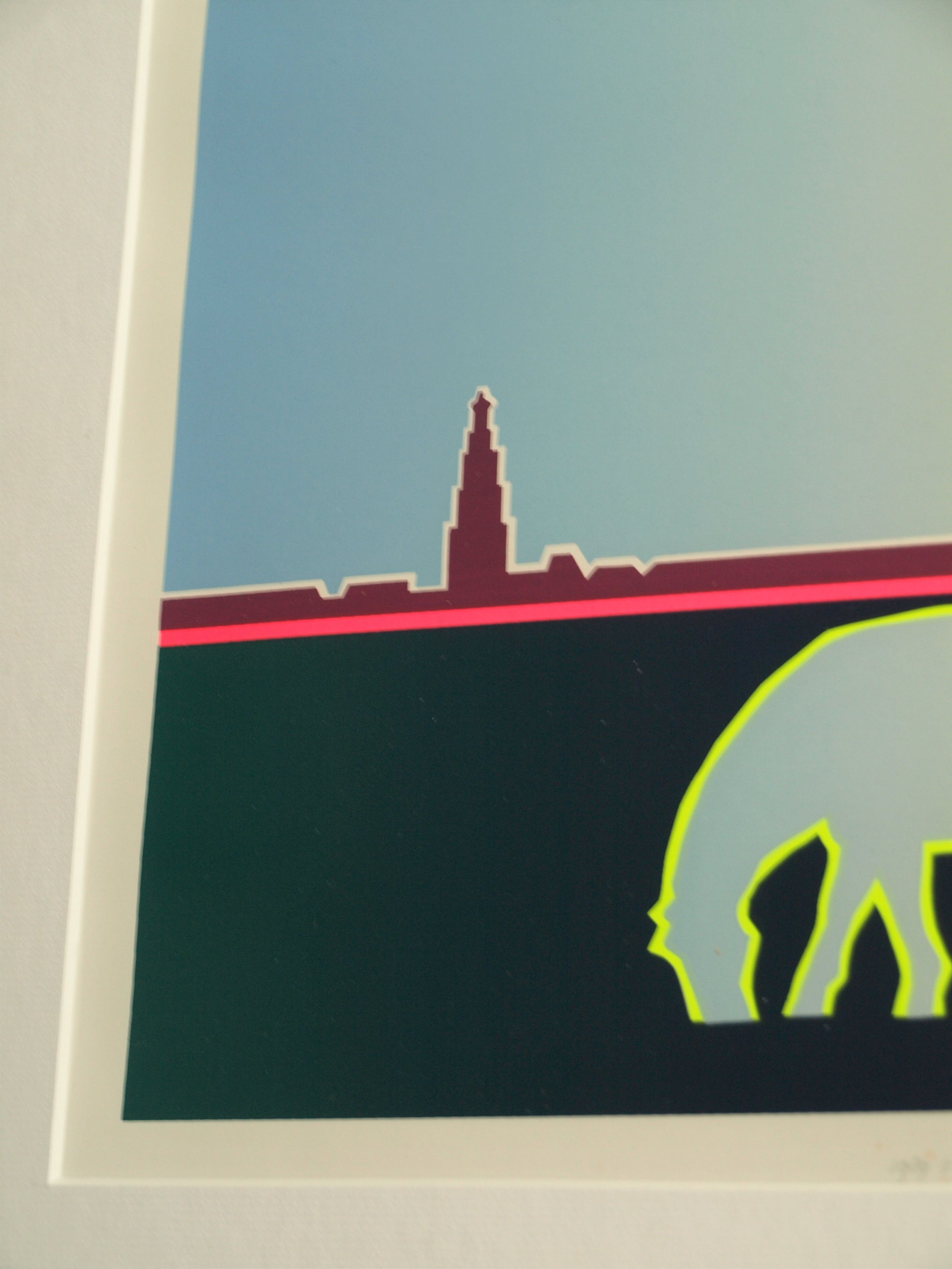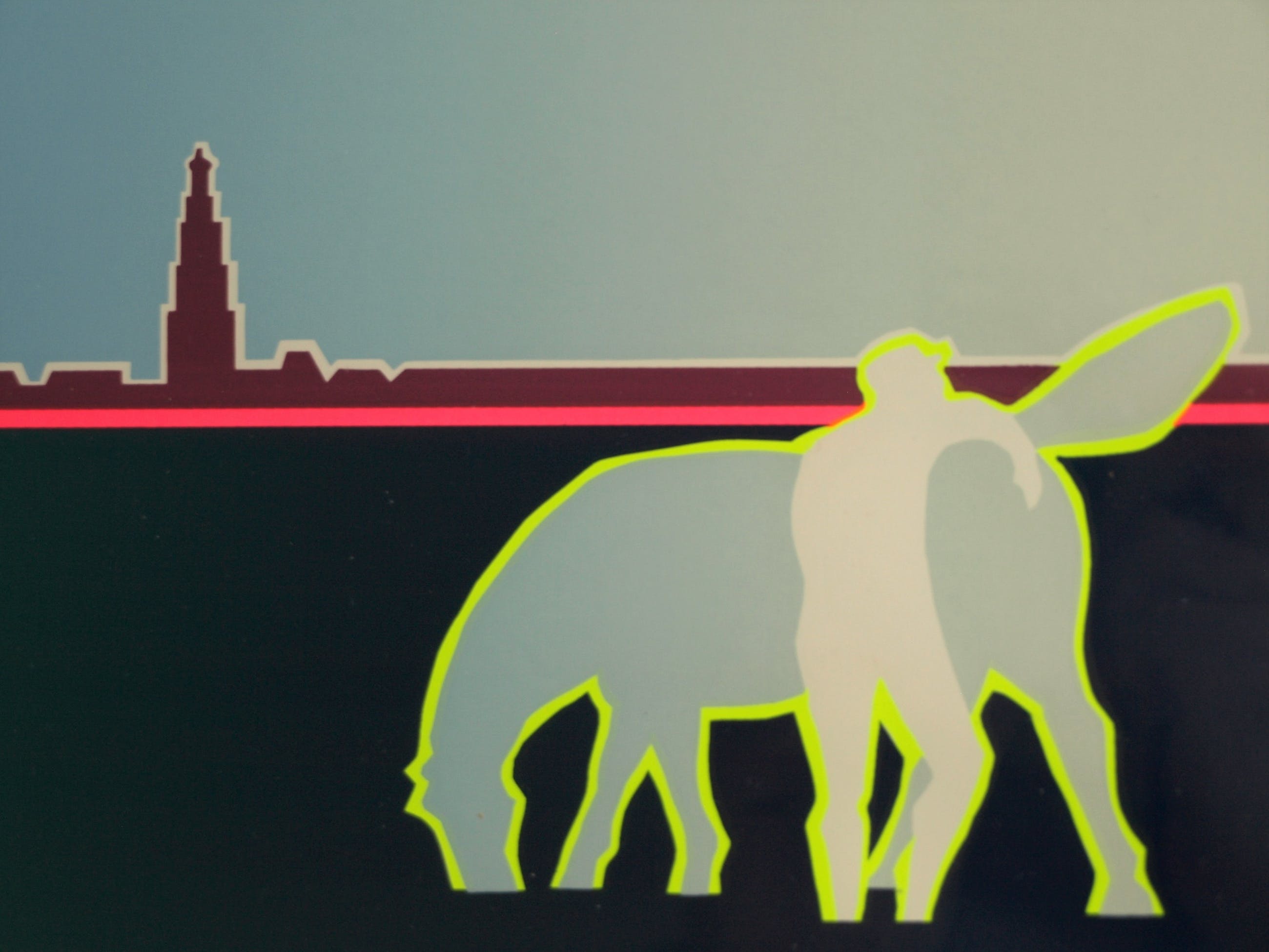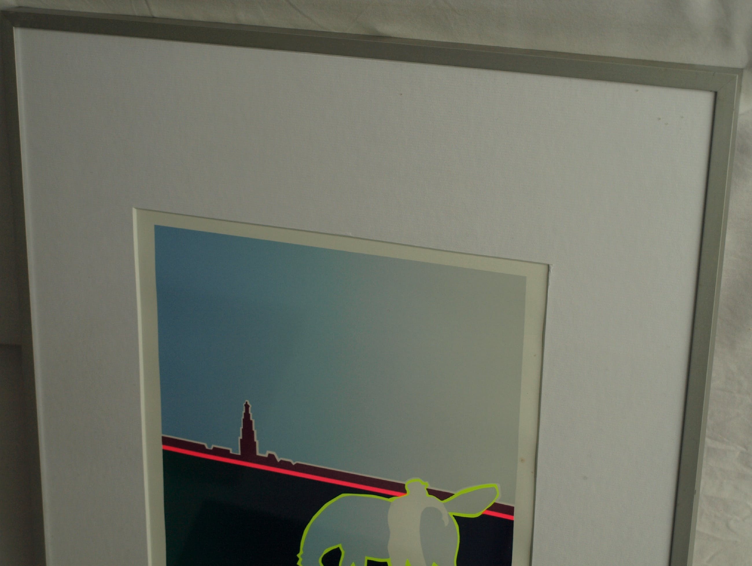 Een ingelijste zeefdruk van de Groningsese kunstenares Heleen van der Tuin (1945), getiteld "Peerd van Ome Loeks", met op de achtergrond de Martini-toren in Groningen.