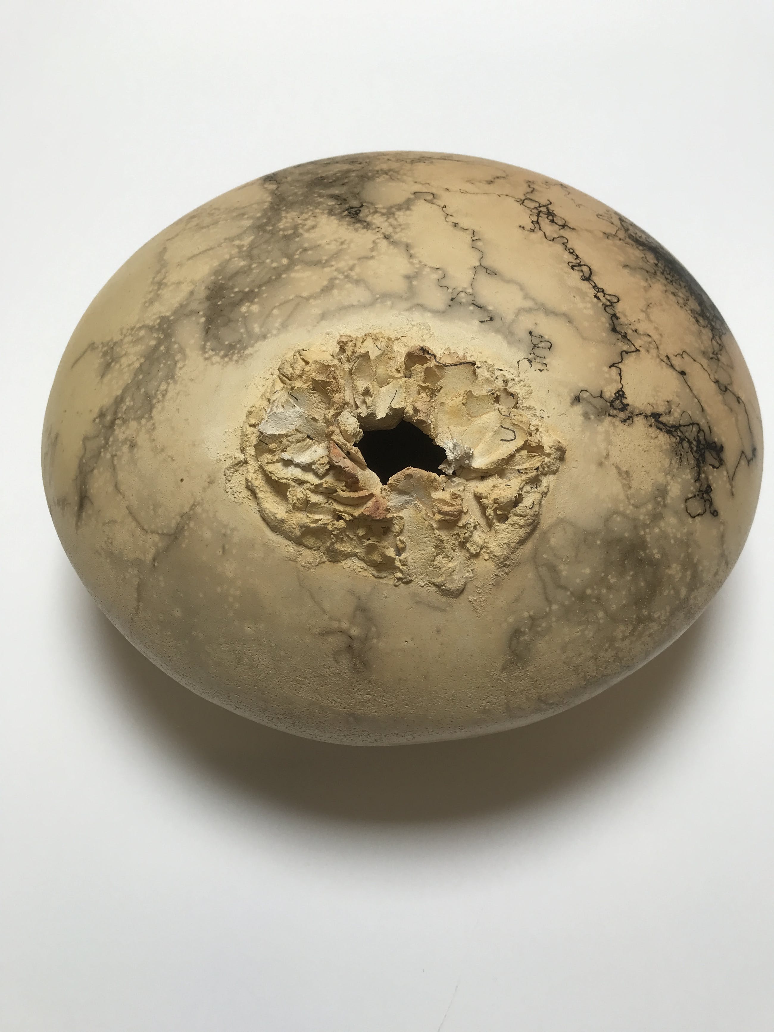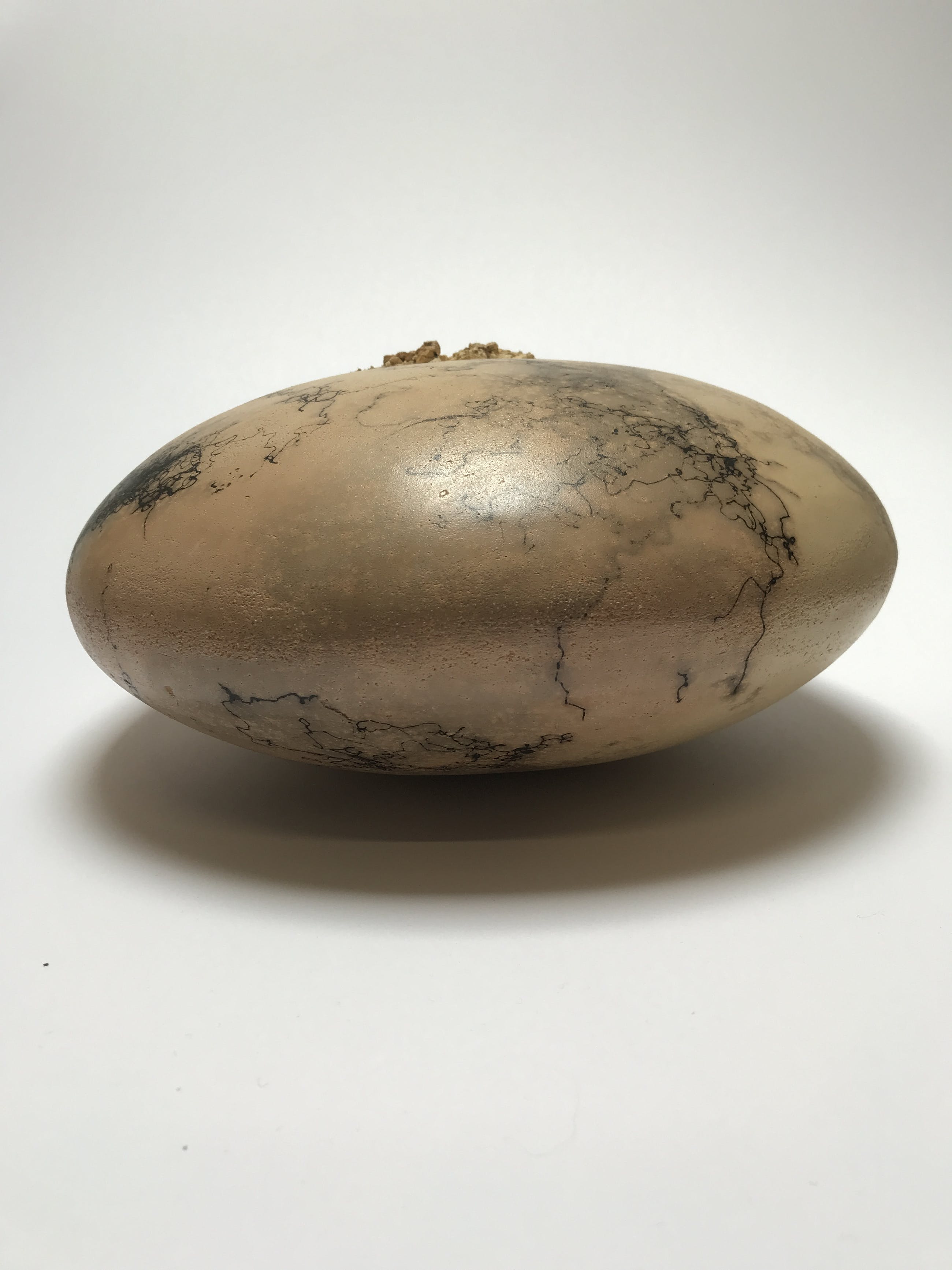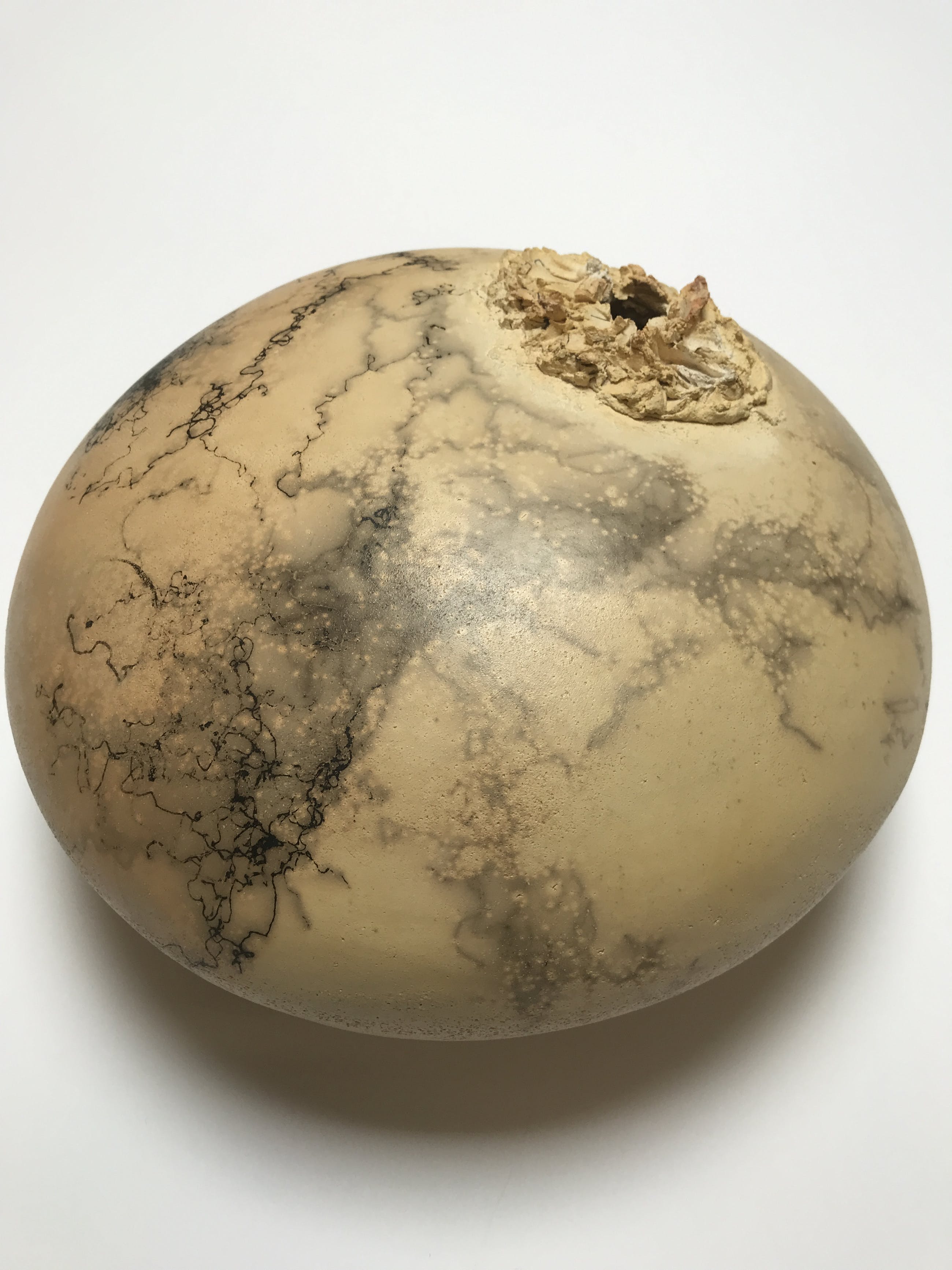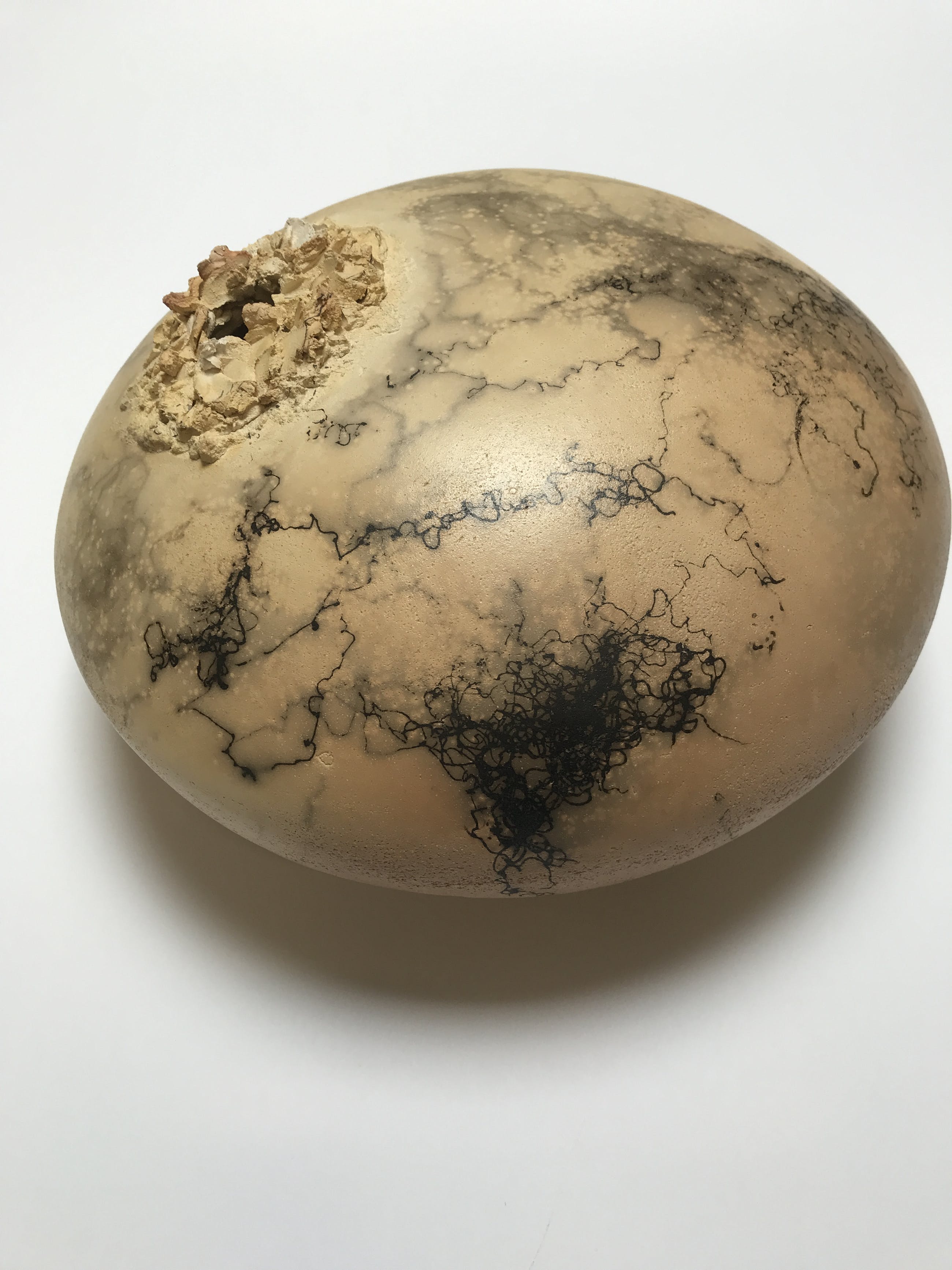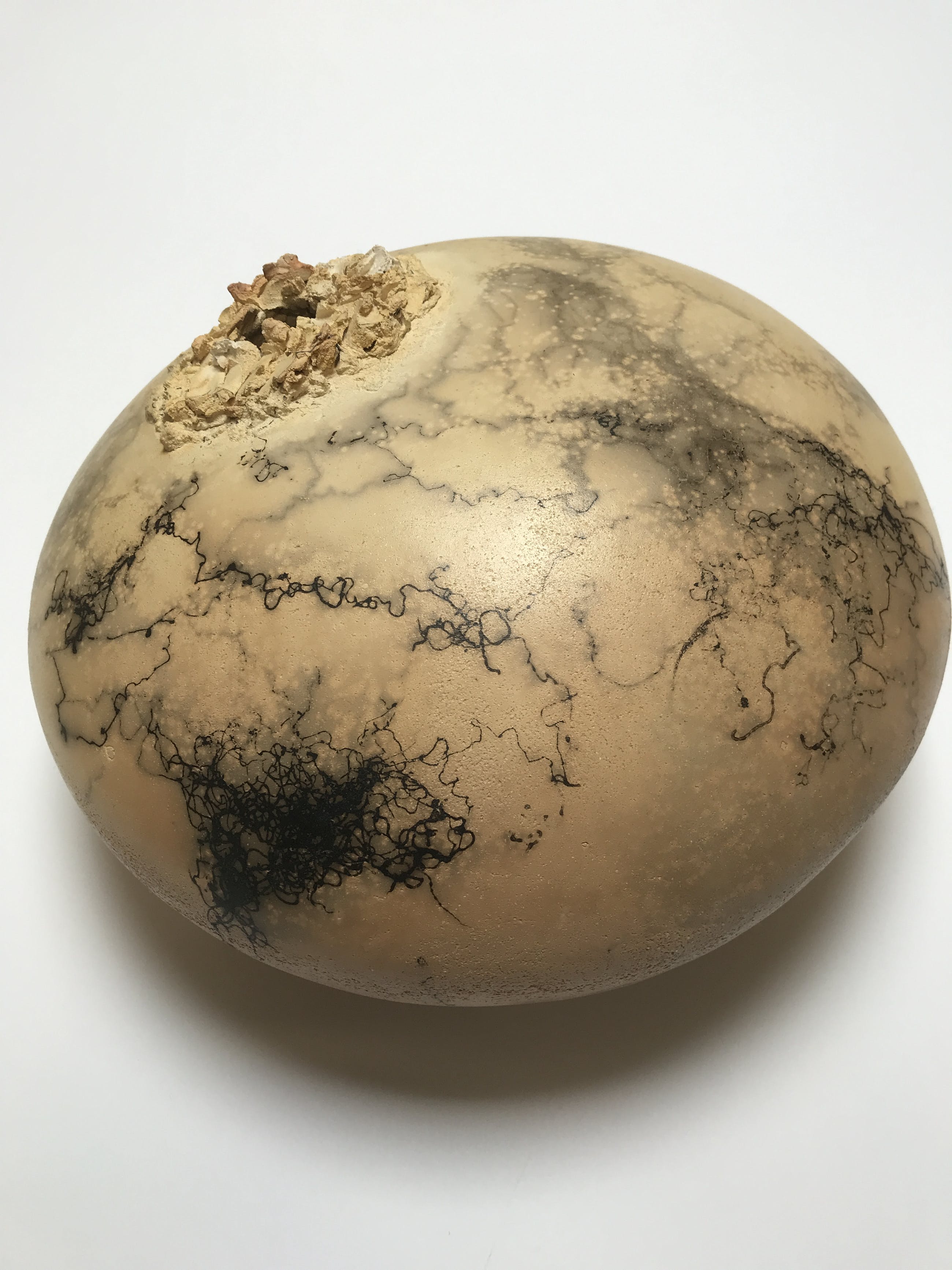 Het is een keramisch object met een bijzondere vorm. Het oppervlak van het object heeft een bijzondere belijning die uniek is. Deze lijnen zijn paardenharen die zijn meegebakken.