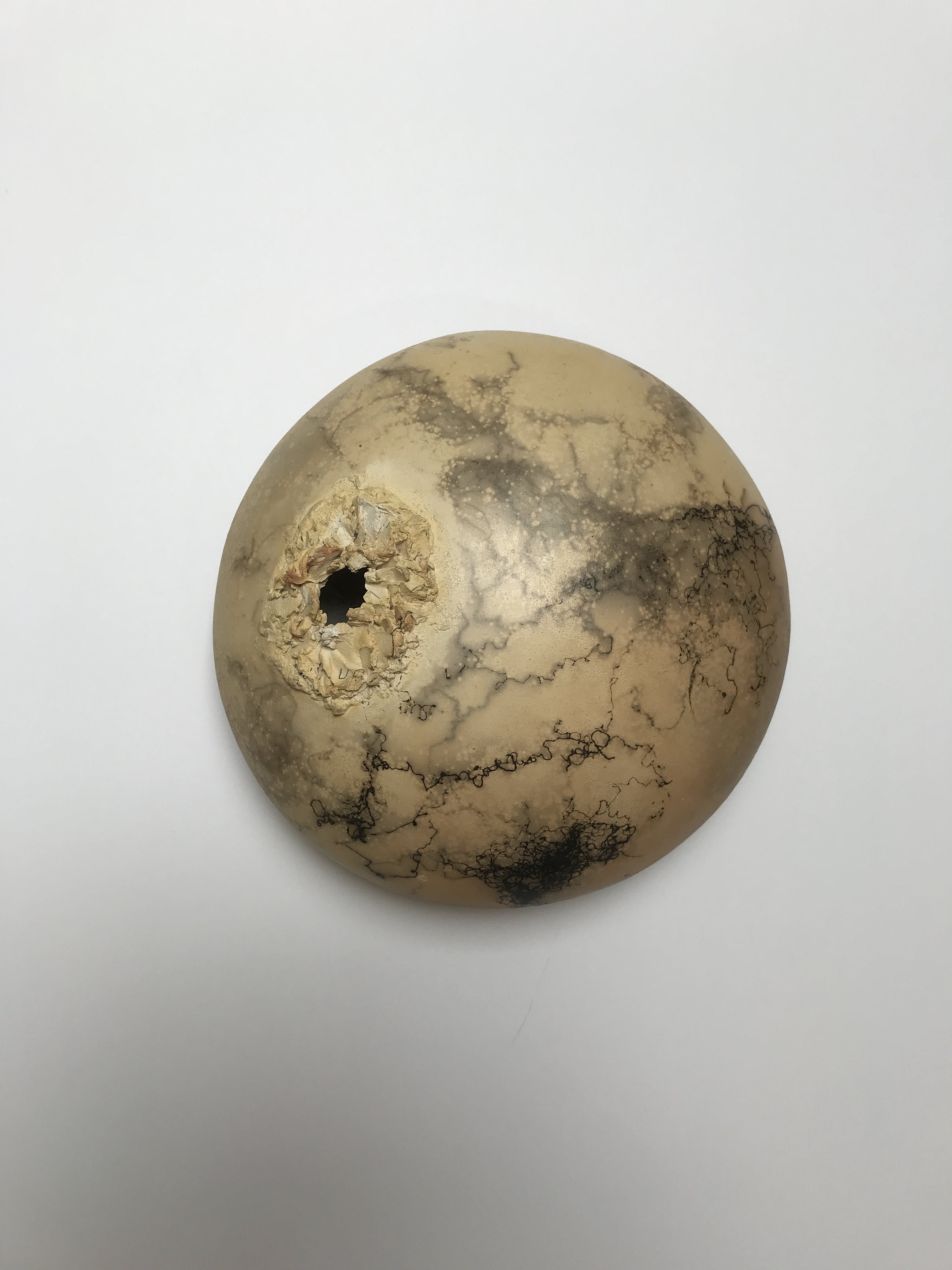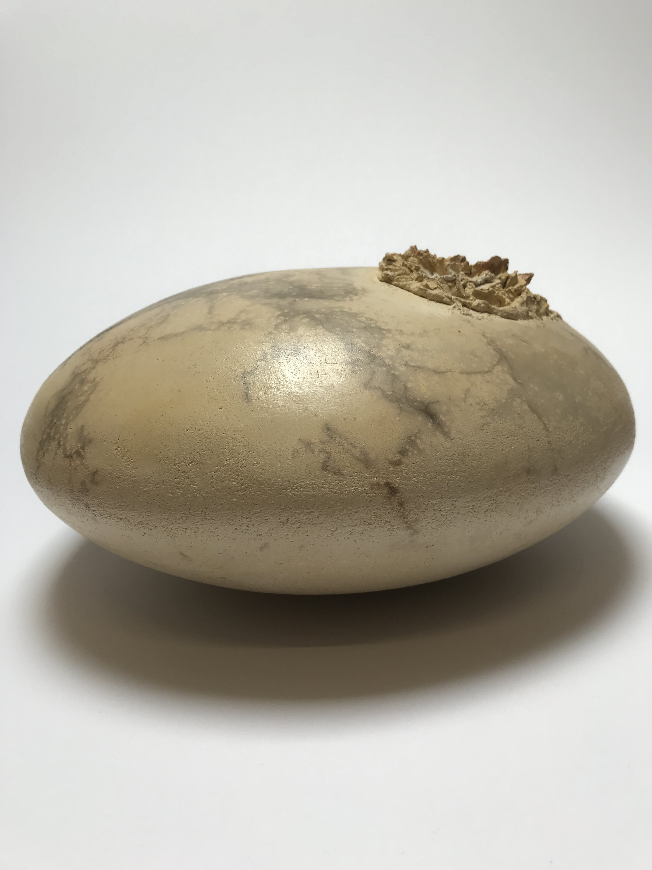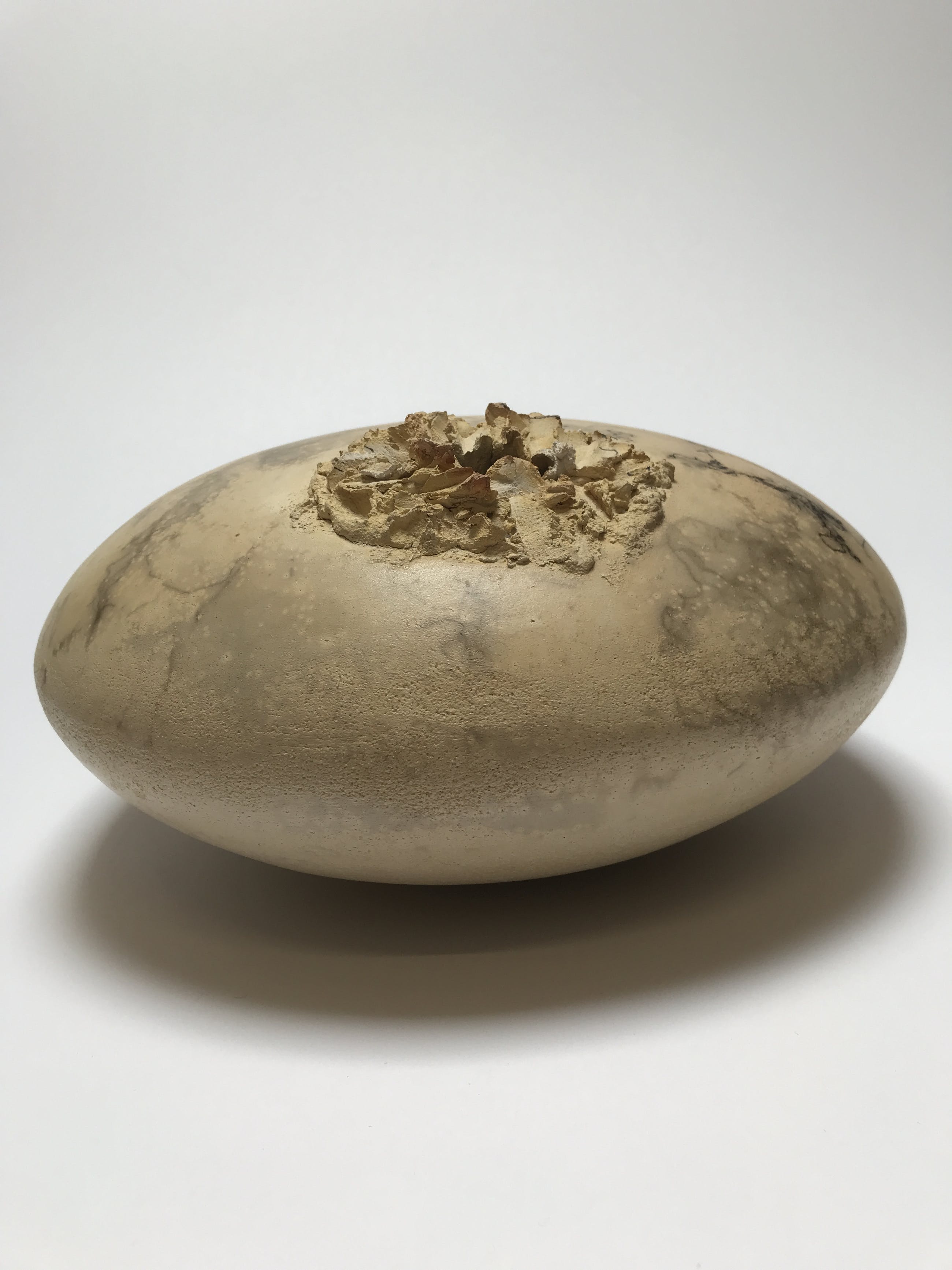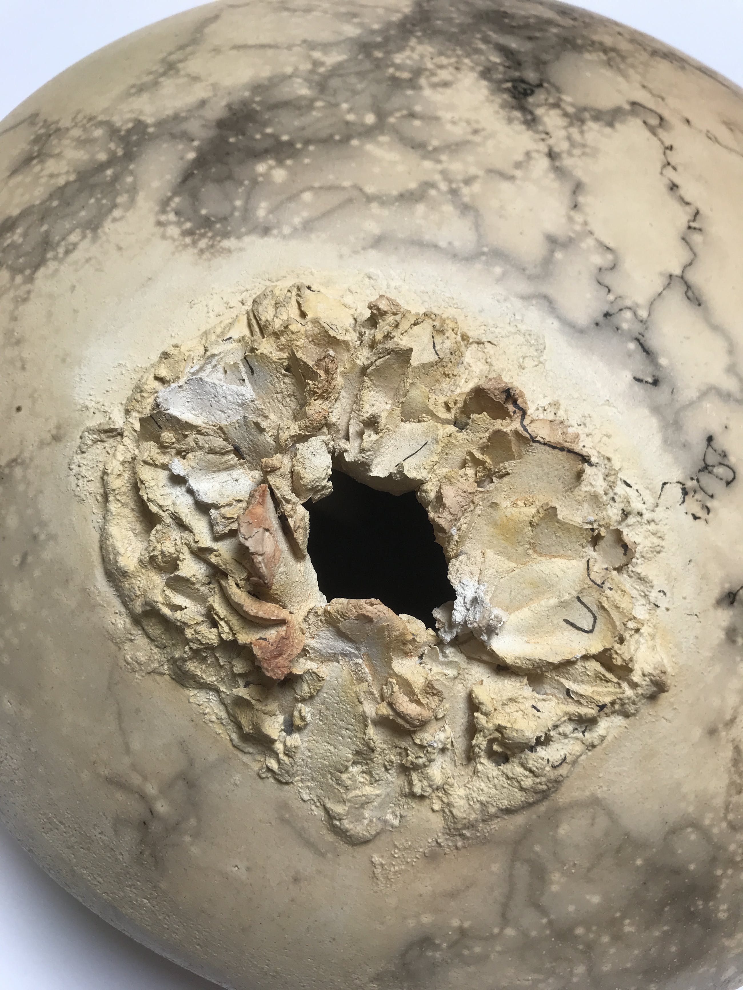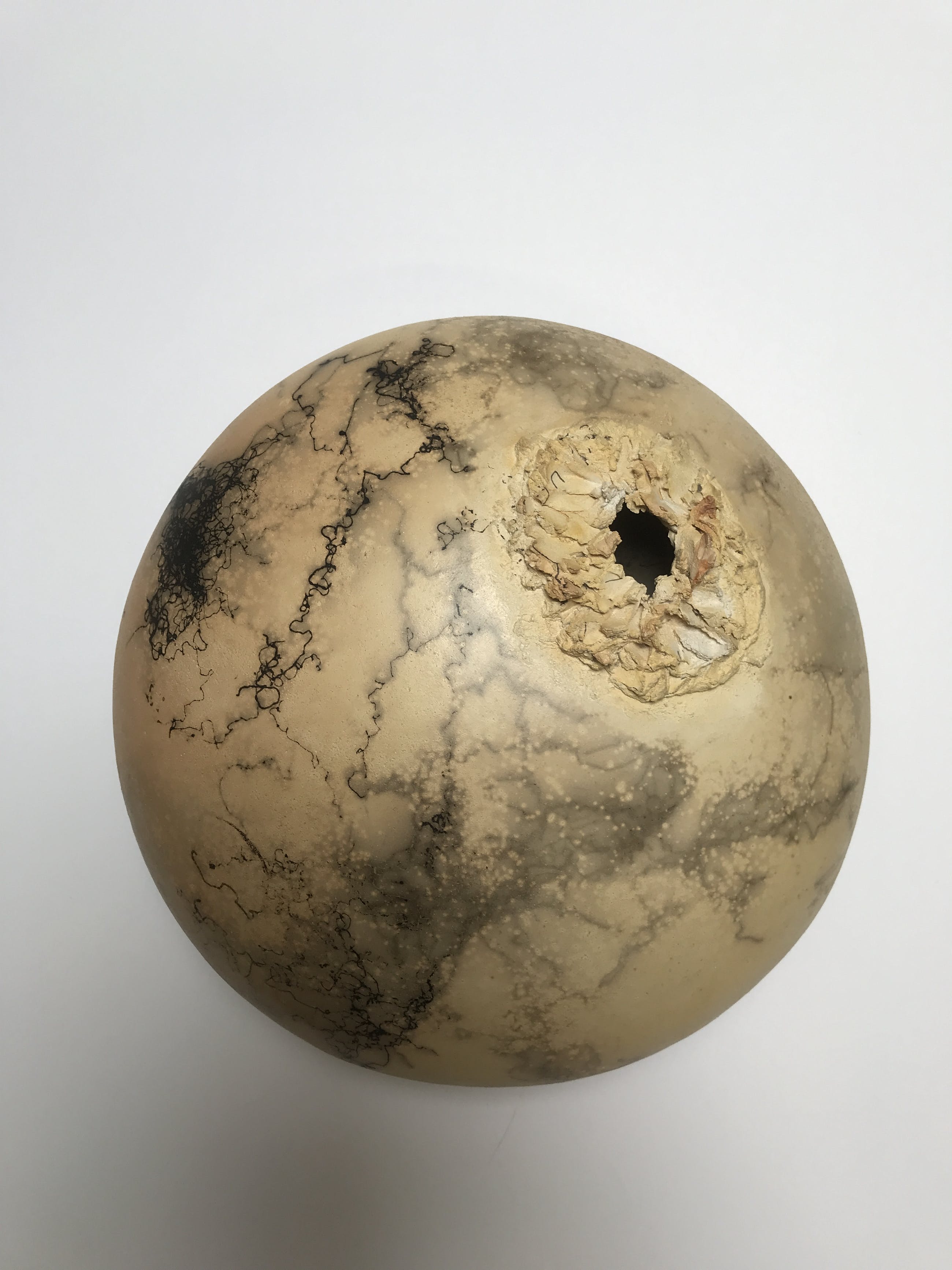 Het is een keramisch object met een bijzondere vorm. Het oppervlak van het object heeft een bijzondere belijning die uniek is. Deze lijnen zijn paardenharen die zijn meegebakken.