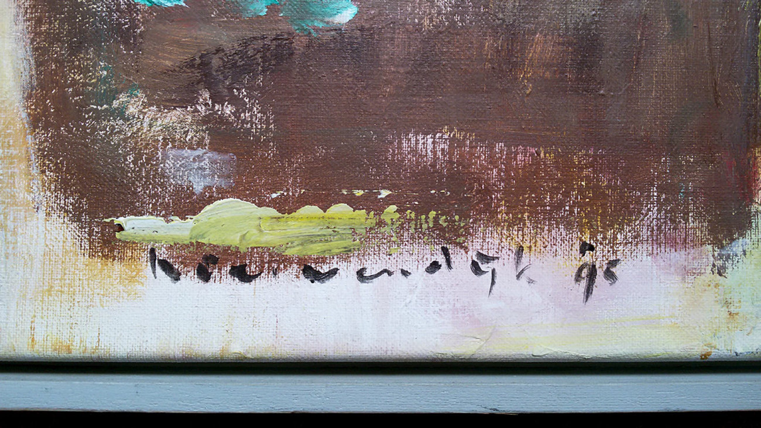 Groot, kleurrijk werk van Helen Nieuwendijk. Olieverf op doek, gesigneerd en gedateerd (‘95) linksonder, en nogmaals in verso. In grijskleurige, houten lijst, alles in zeer goede conditie. Het doek lijkt aan de achterkant rechtsonder (= aan de voorkant ter hoogte van de signatuur) gerepareerd maar daar is aan de voorkant niks van te zien. Waarschijnlijk een versteviging van het doek gedaan door de kunstenares zelf want het gebruikte linnen is identiek aan het gebruikte schildersdoek.