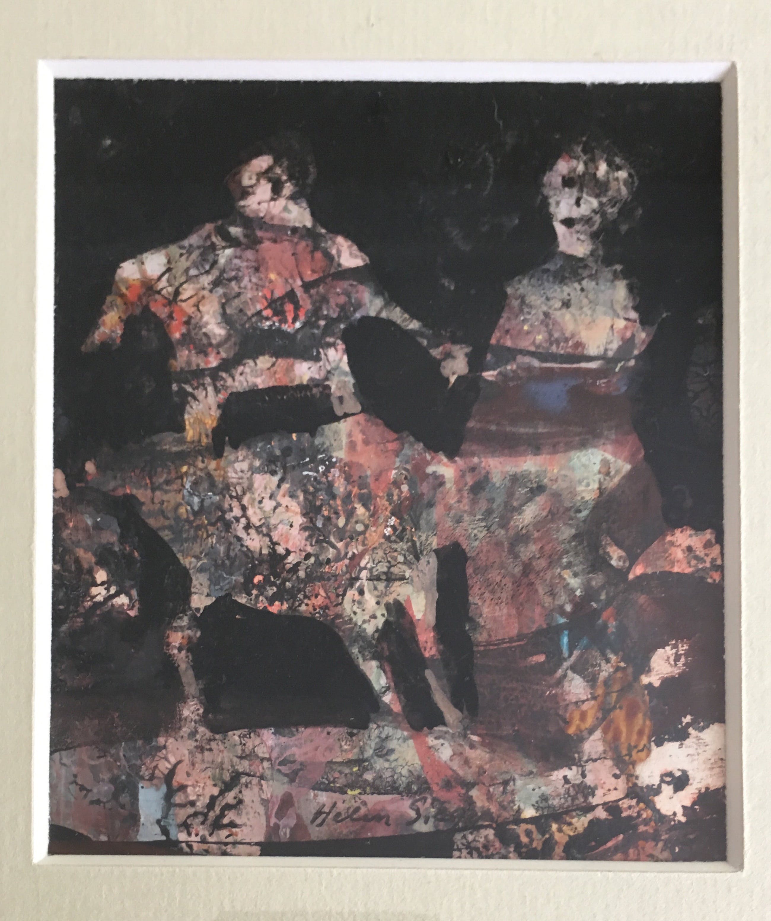 Betreft klein teer werk van Helen Sieger waarin in het klein hetzelfde is samengevat als in haar grotere werken. In een grote periode van haar leven betroffen abstracte dieren en mensen/figuren, in het middelpunt van een herkenbare omgeving of voorstelling een herkenbaar geheel. Diverse litho's/drukken hiervan zijn herkenbaar, de (acryl) geschilderde grote werken zijn zeer gewild. Dit kleine werk is voor een kenner een waardevolle aanvulling.