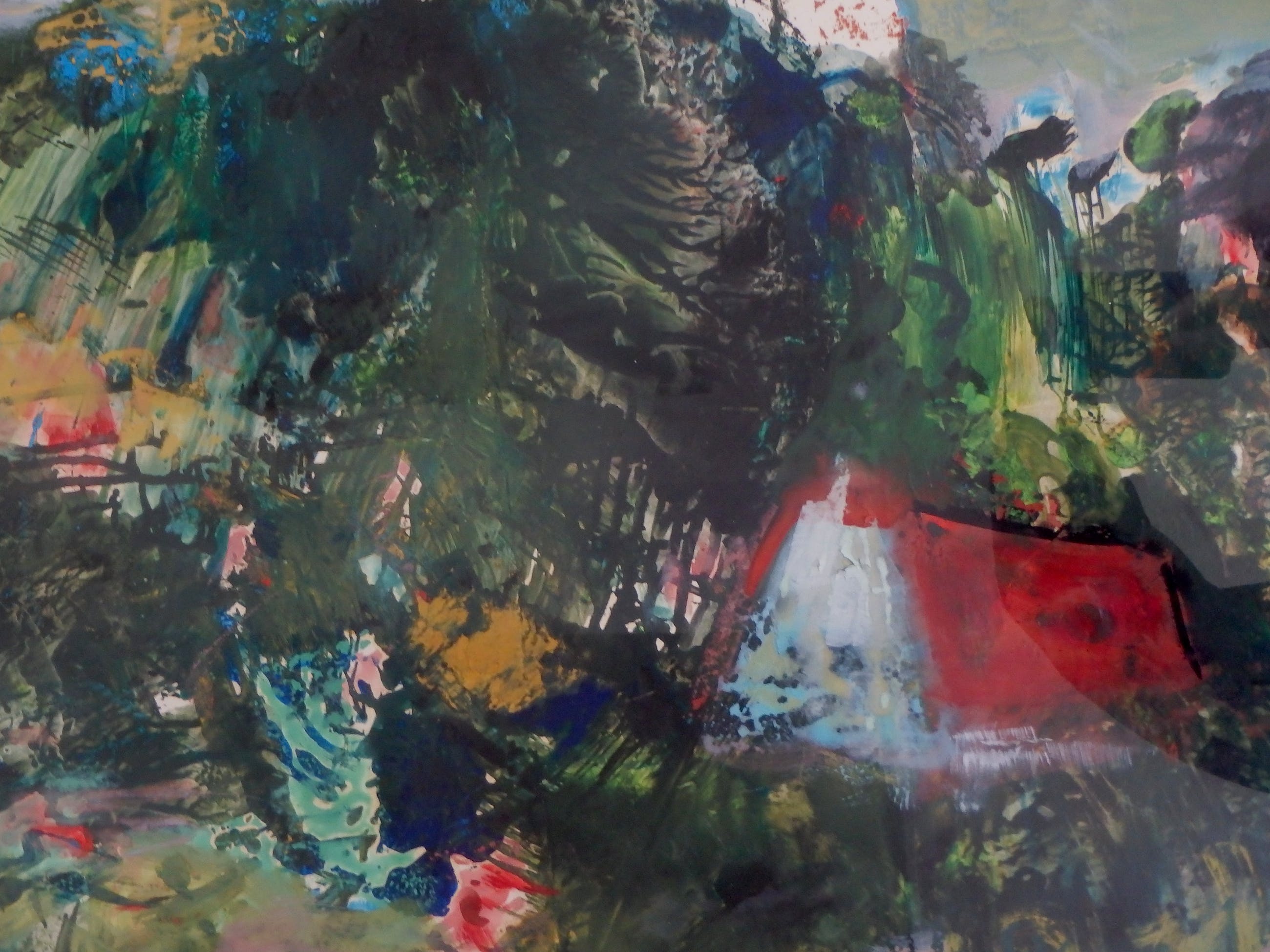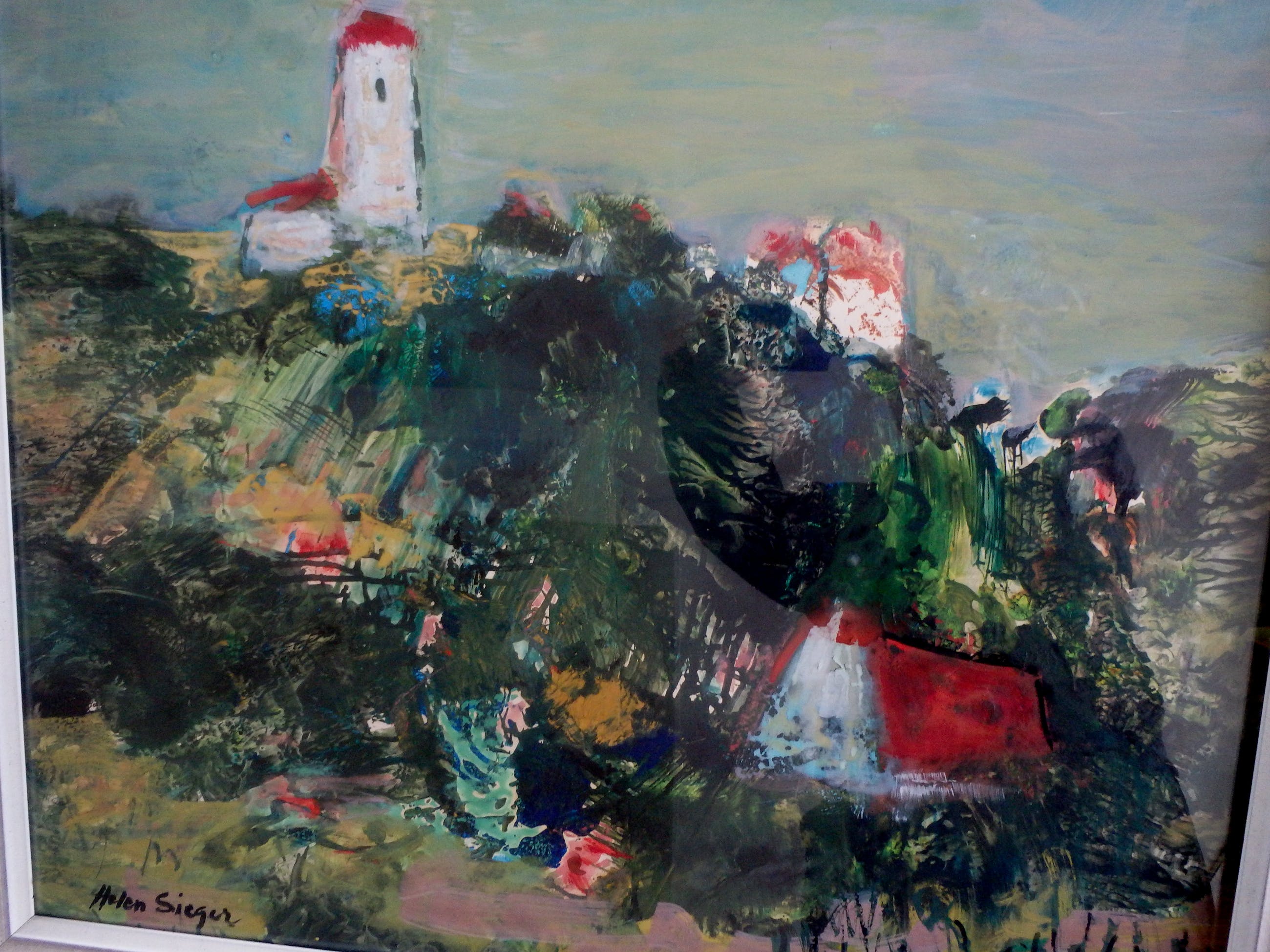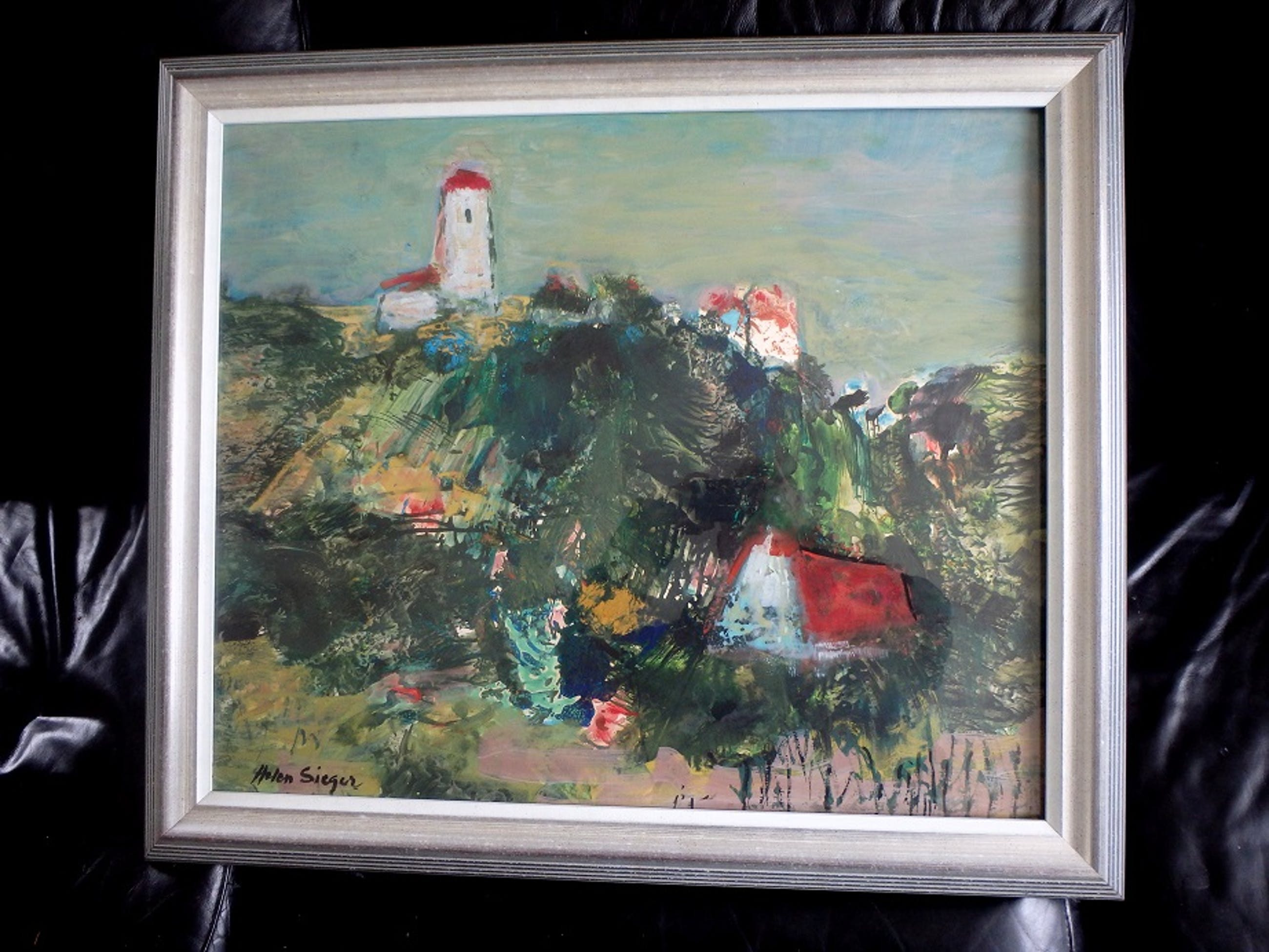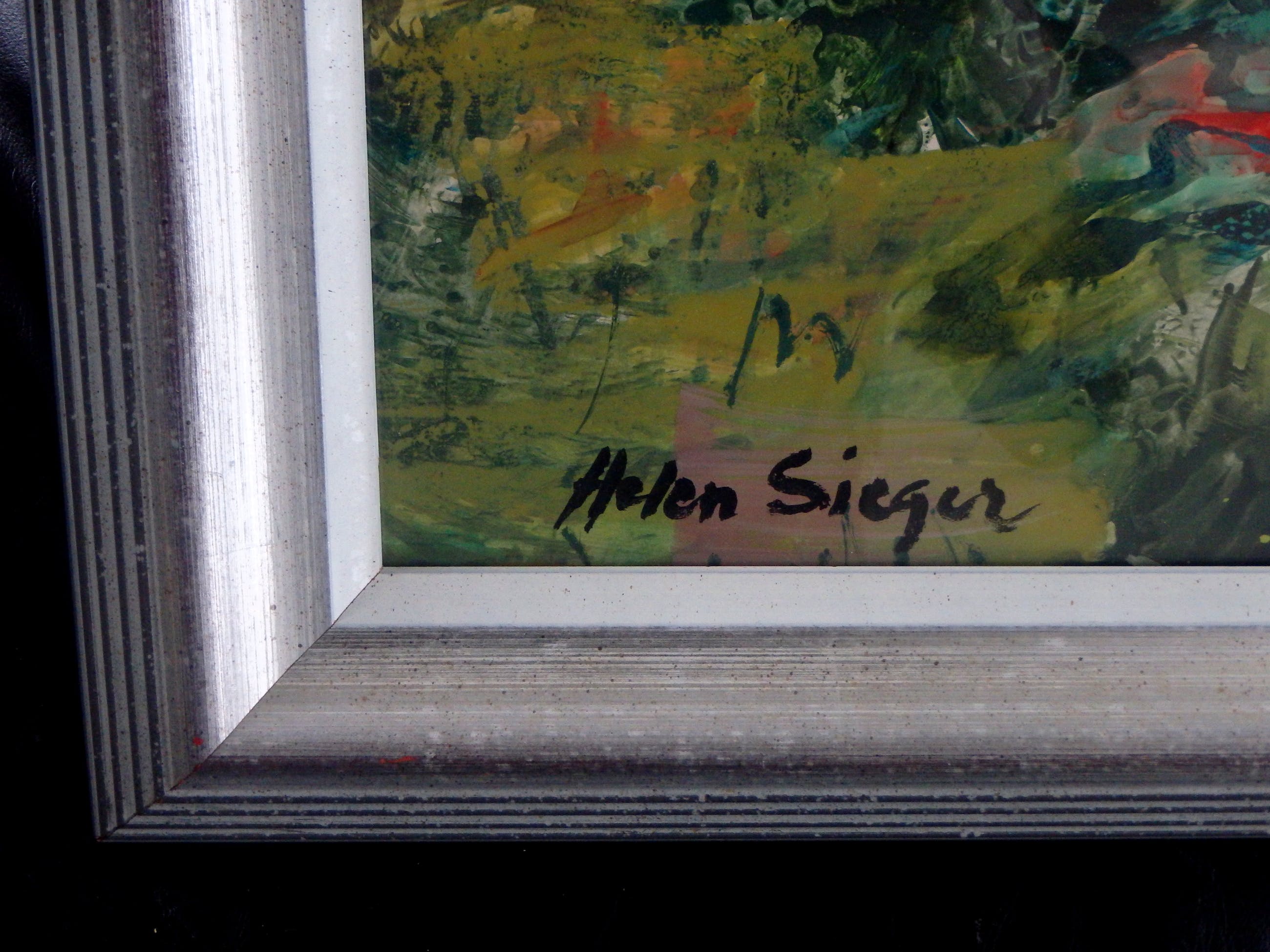 Gouache op karton 60x70, linksonder gesigneerd Helen Sieger, geschilderd ca. 1980, Ingelijst achter glas in mooie galerie-lijst, maat lijst 70x80 Helen Sieger-White. Geboren in New York 1911.