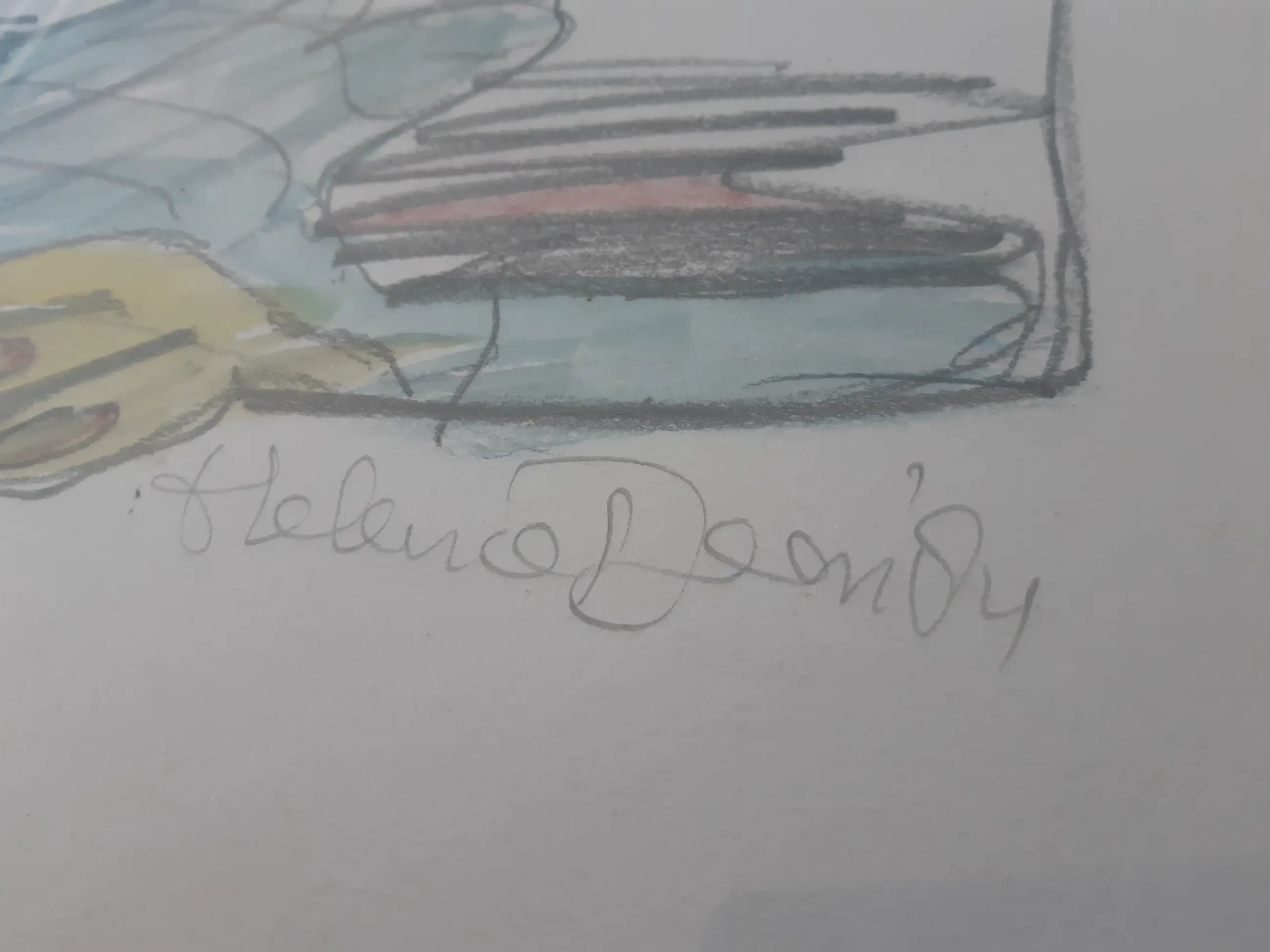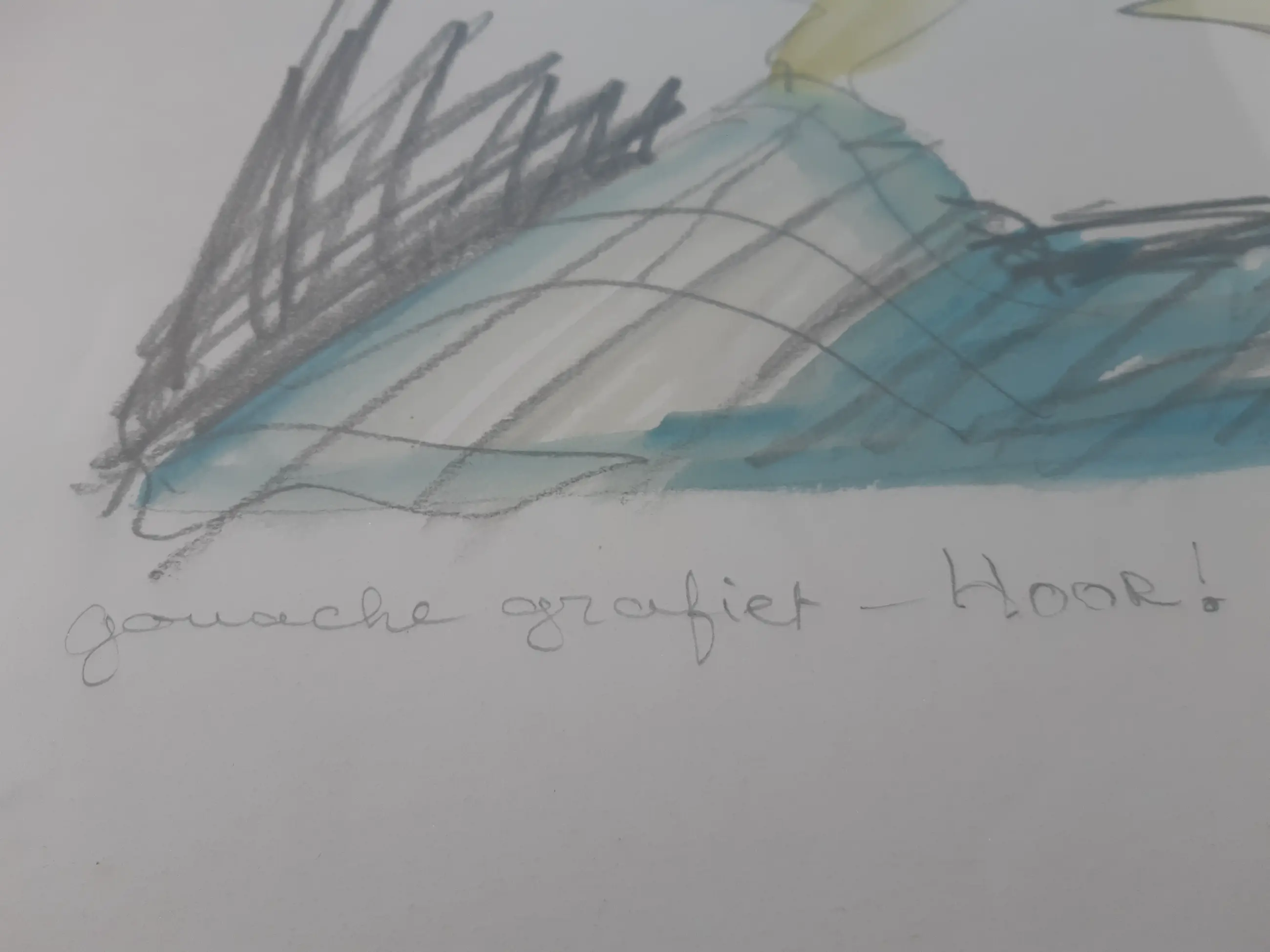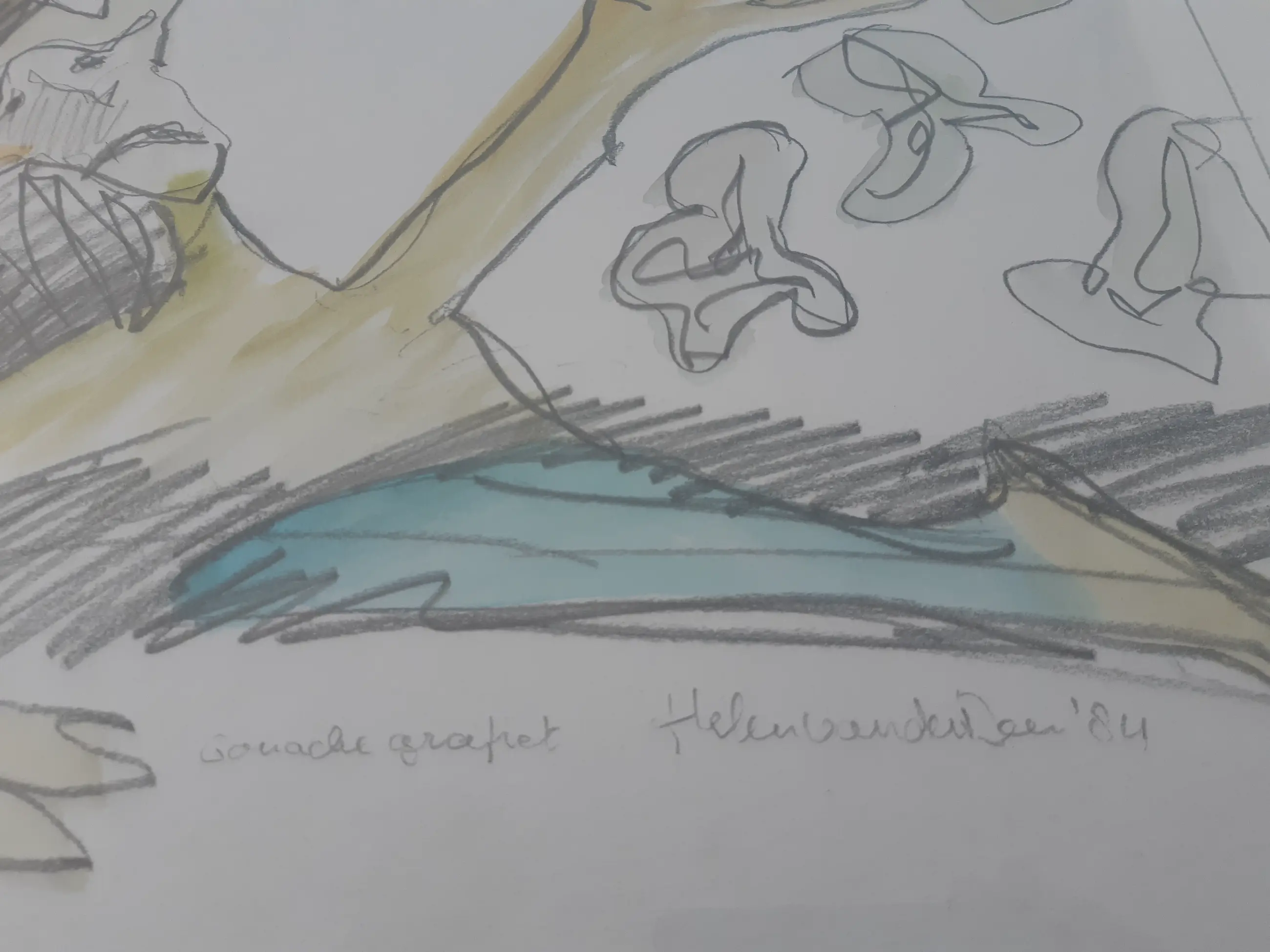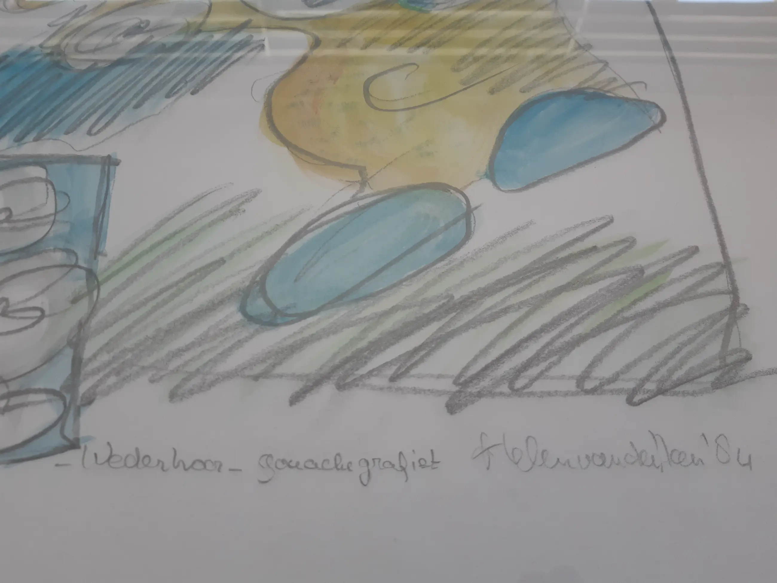 Te koop aangeboden in goede staat en professioneel ingelijste drieluik gouache grafiet tekeningen van Helen van der Deen uit 1984. Drie kunstwerken apart ingelijst getiteld: Hoor, Wederhoor en Geen Gehoor. Gesigneerd door kunstenaar.