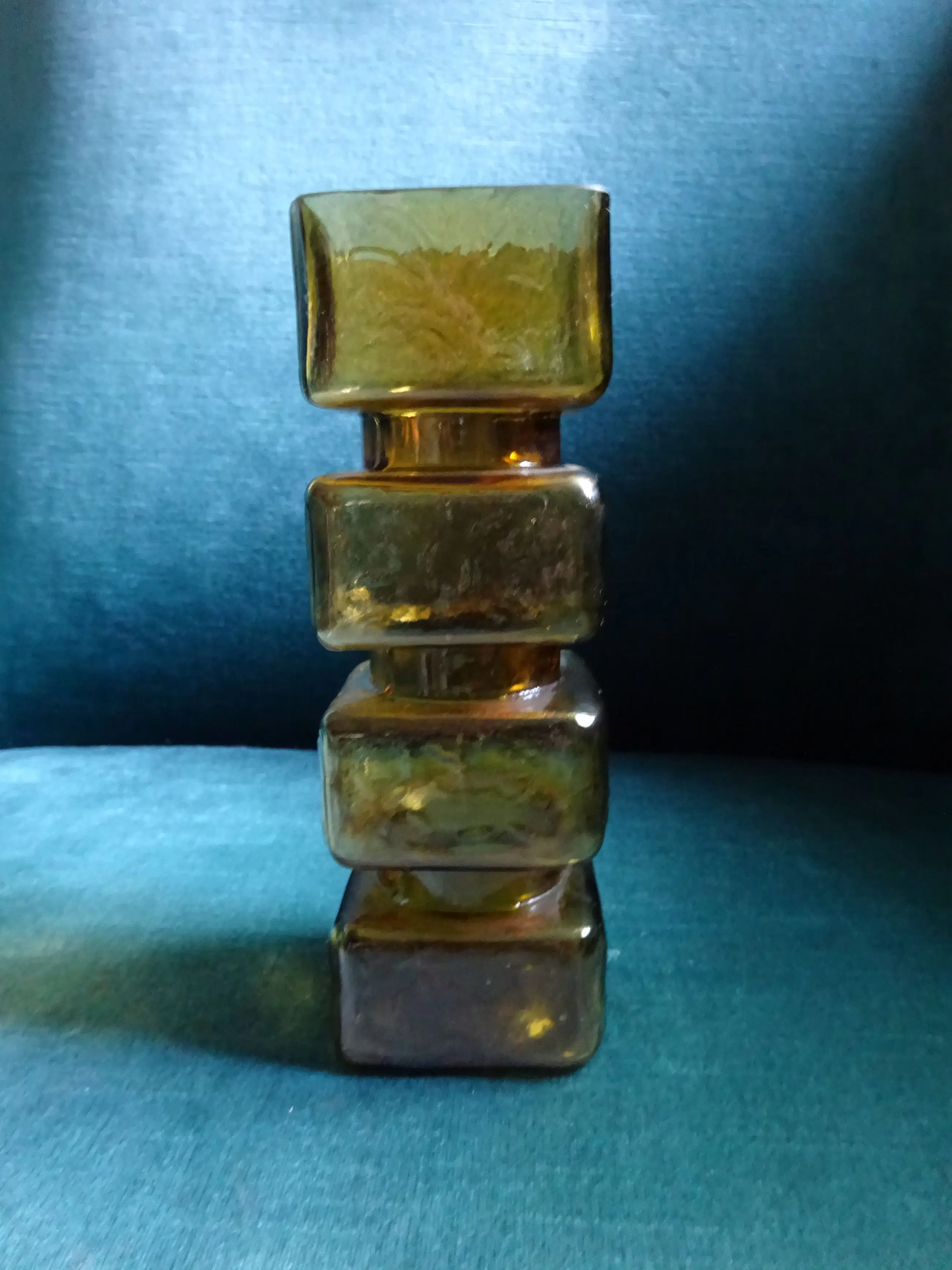 Helena Tynell vaasje uit de Pala serie Uitvoering: Riihimäen Lasi 1960-1976 Land: Finland Hoogte: 15 cm Breedte: 5 x 5 cm Kleur: amber Conditie: nieuwstaat