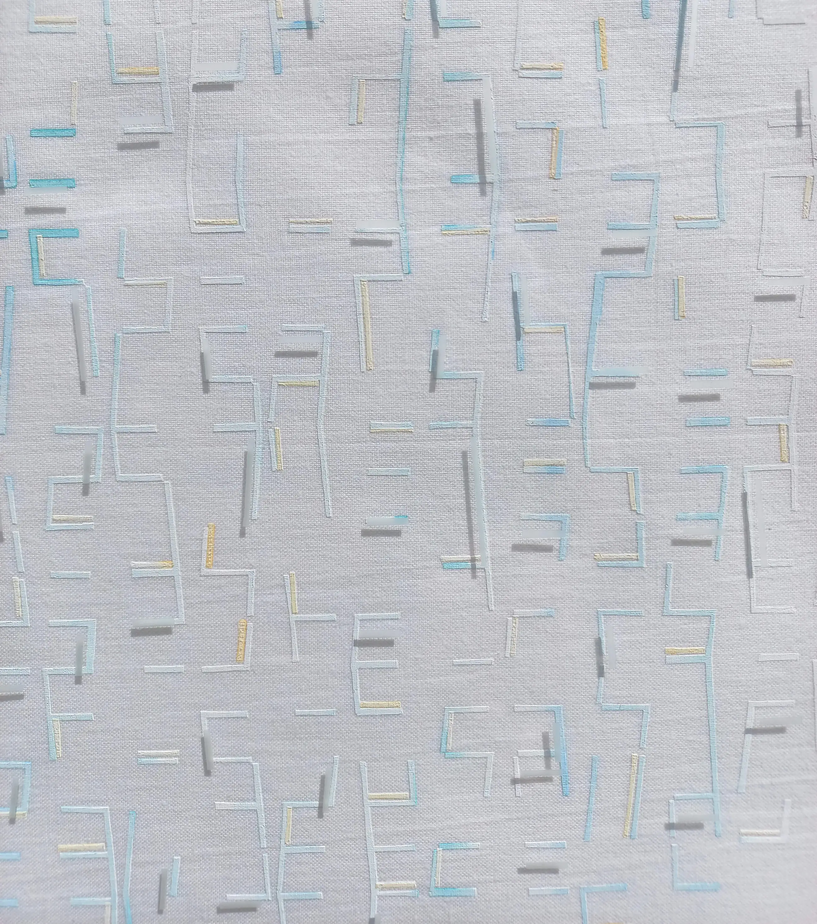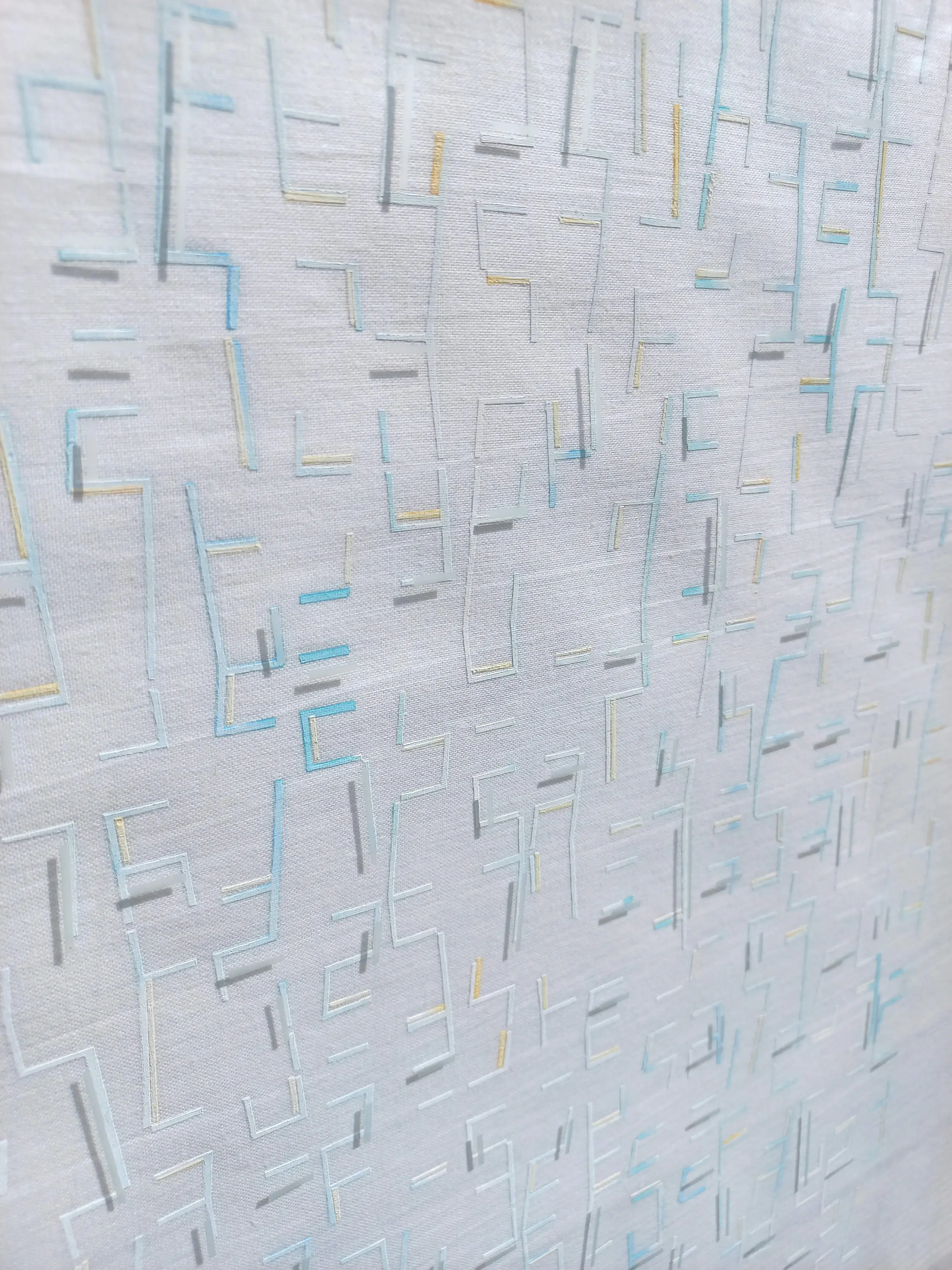Door de bewerking van het glas dat op enige afstand zit van het textiel zie je het werk veranderen wanneer het licht vanuit een andere hoek invalt. Precies volgens het principe van een zonnewijzer. Zie close-up foto’s voor een beter idee.