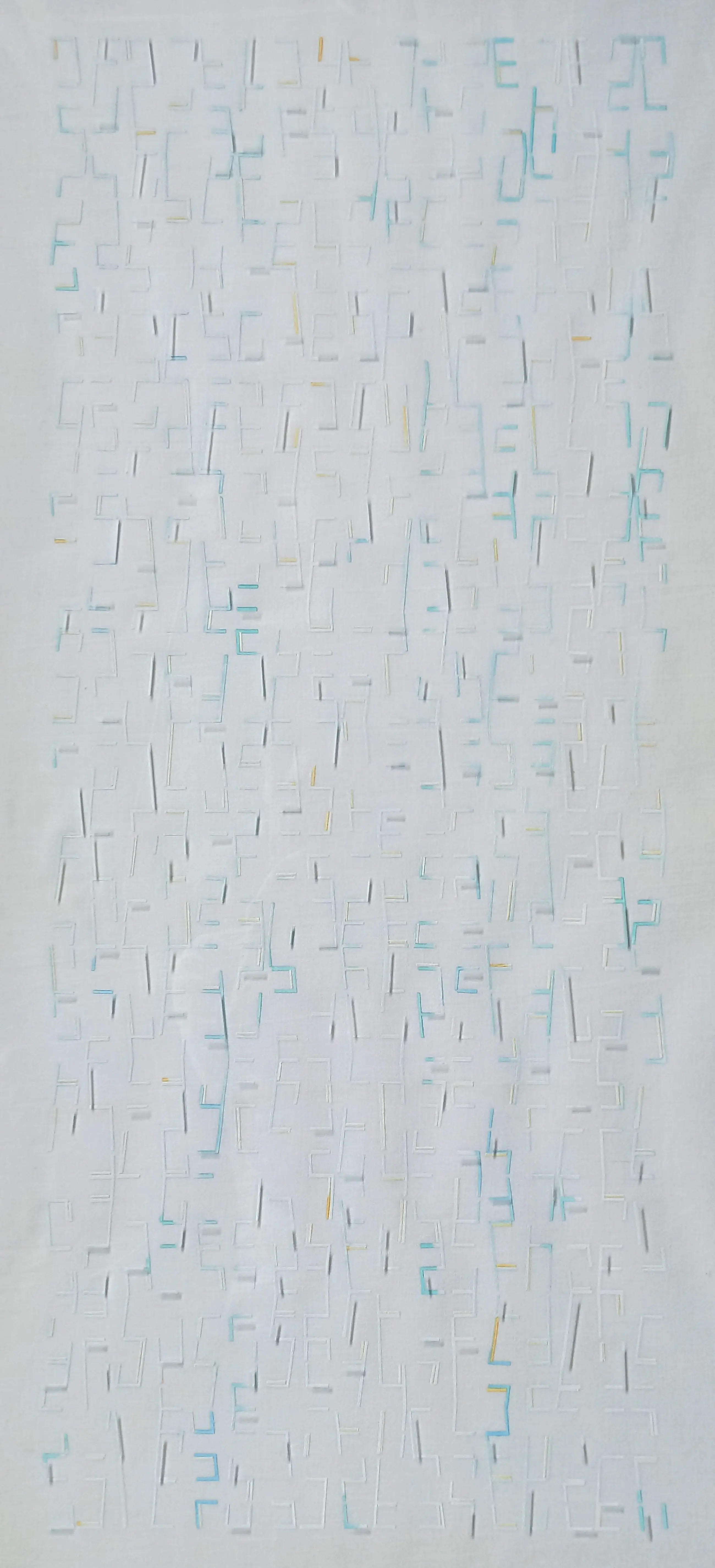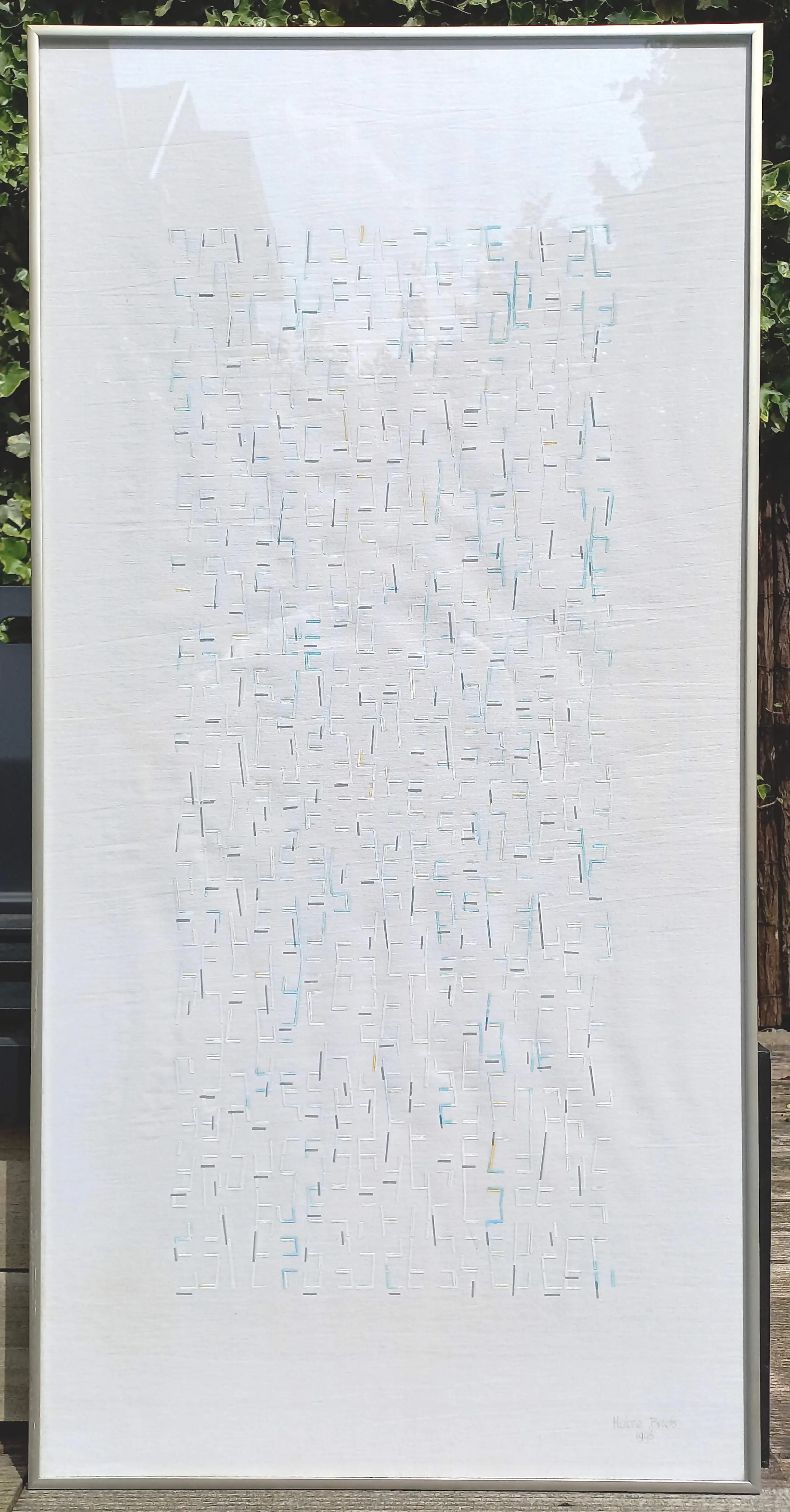 Fascinerend werk van Helene Briels, die graag werkt met verschillende technieken op textiel. Verf (zeefdruk of met de hand aangebracht) op textiel achter glas dat gegraveerd lijkt (of gezeefdrukt) in harmonie met het patroon op het textiel, met de hand gesigneerd en gedateerd (1996). In strakke aluminium lijst. Alles in zeer goede conditie.