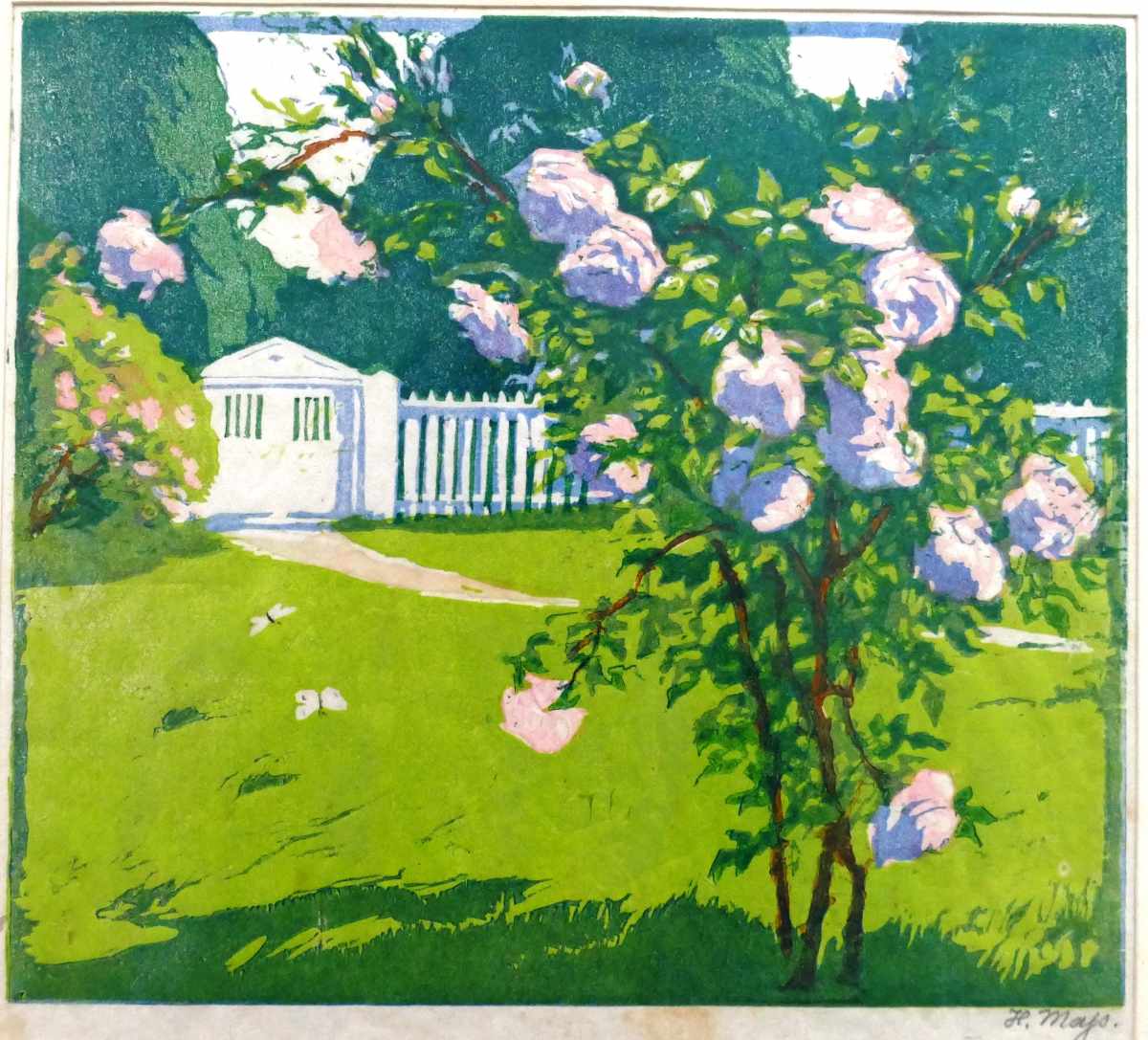 Rosengarten, Farbholzschnitt, Das Blatt ist hinter Passepartout und Glas gerahmt, Größe mit Rahmen: 35 x 37,5cm, Darstellungsgröße 22 x 25cm, rechts unten handsigniert, Die Rosen blühen hellrot, das ist auf der Abbildung schlecht zu erkennen. Zustand: Passepartout ist verschmutzt und direkt unterhalb der Darstellung befinden sich zwei kleine Fleckchen, ansonsten guter Zustand. Versandkosten innerhalb von Deutschland als versichertes Paket 7,- Euro.