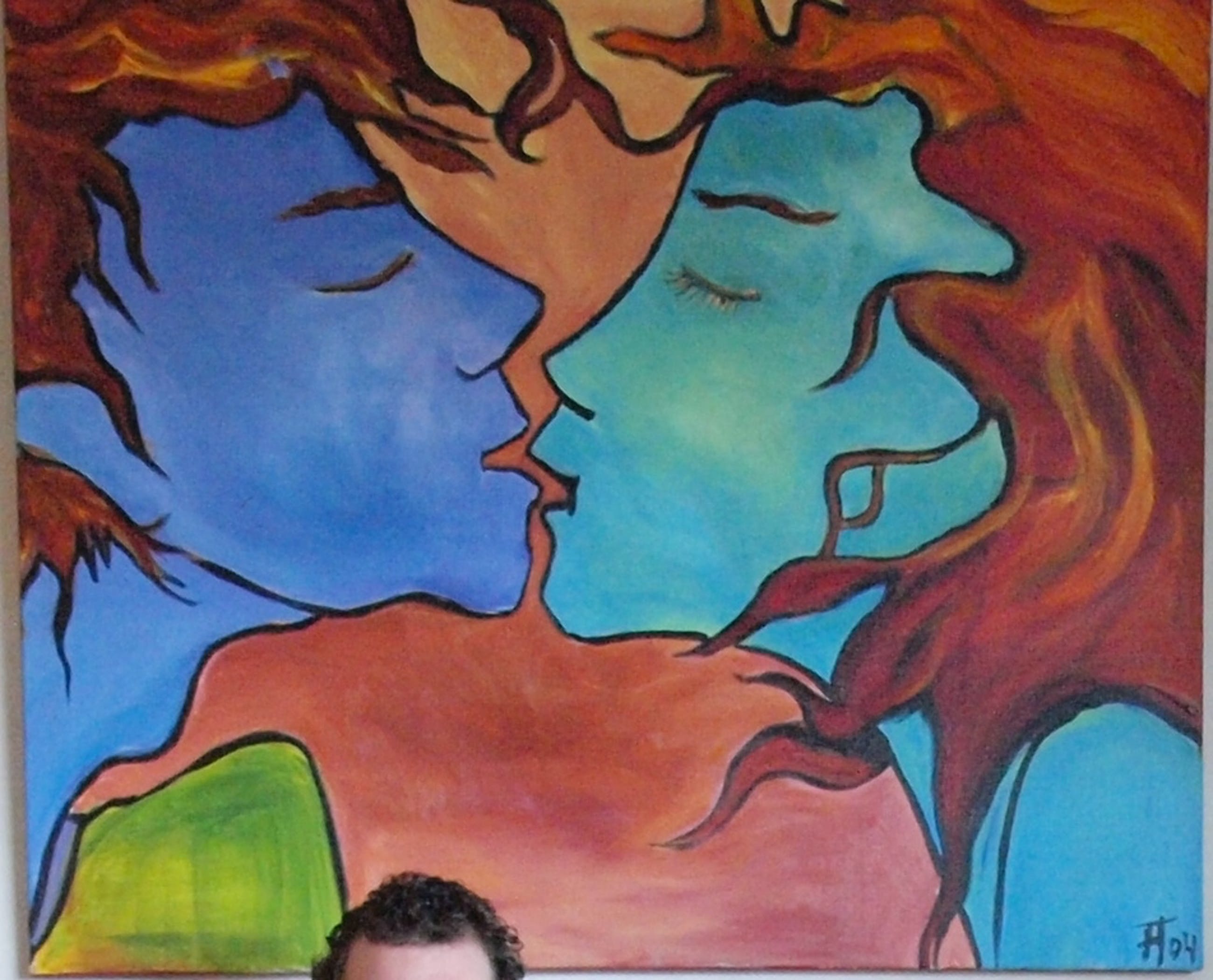 Groot, kleurrijk werk uit 2004 (=/- 1m2). Gesigneerd.
