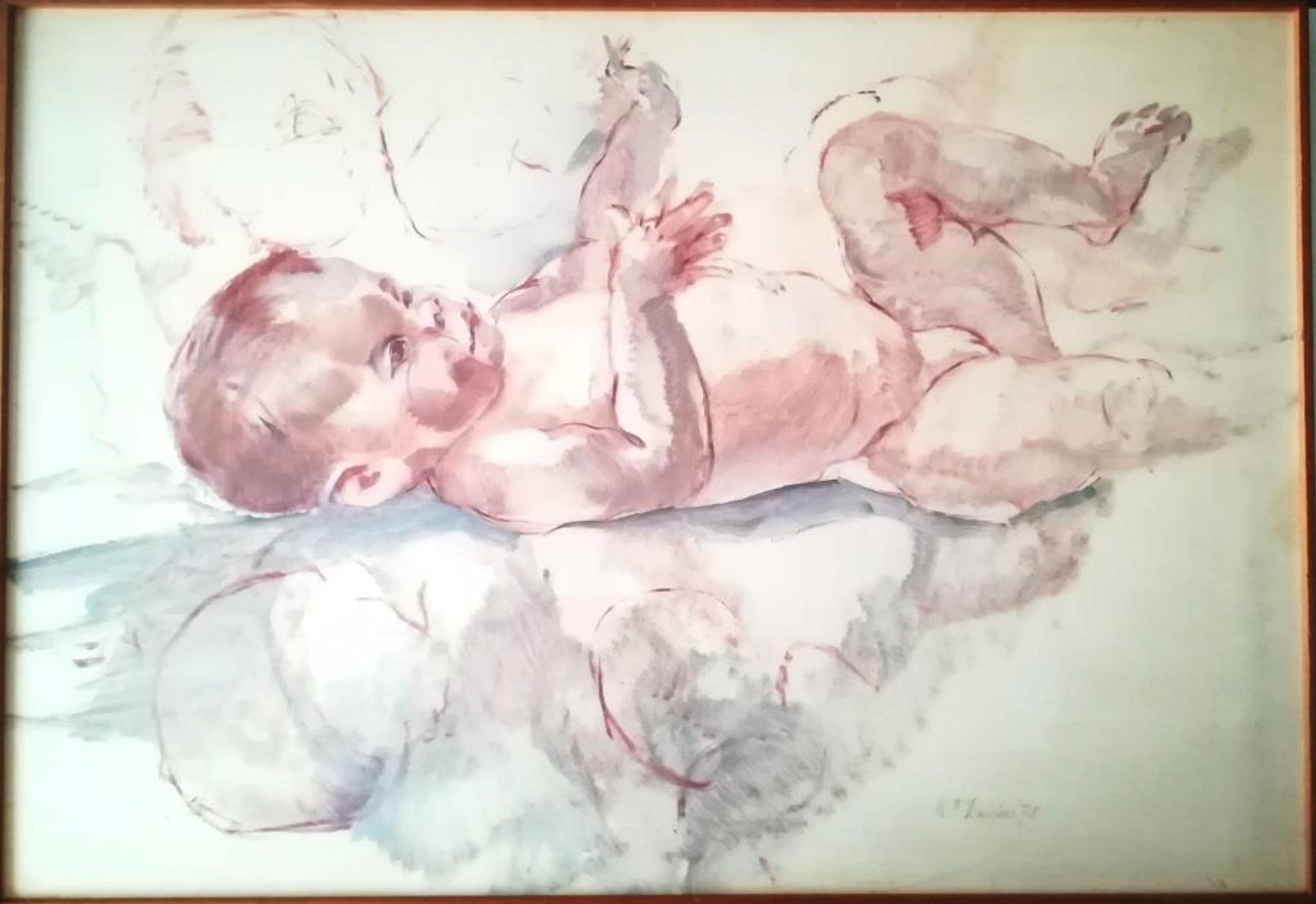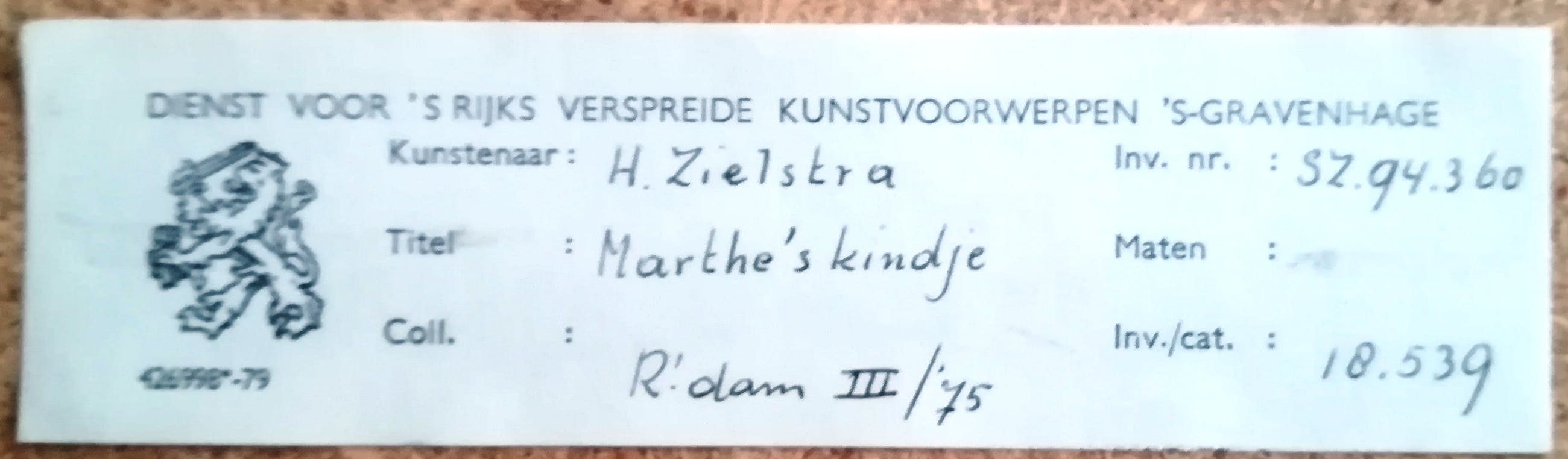 Conditie: Schilderij verkeert in nieuwstaat Stijl: Impressionisme Thematiek: Martha’s kindje Kleur: Polychroom Materiaal: Olieverf op papier/paneel Lijst: Eenvoudige grenen houten lijst Dimensies: 94x65x4 cm RKD: Geregistreerd Provenance: Dienst voor ’s rijks verspreide kunstvoorwerpen ‘s-Gravenhage
