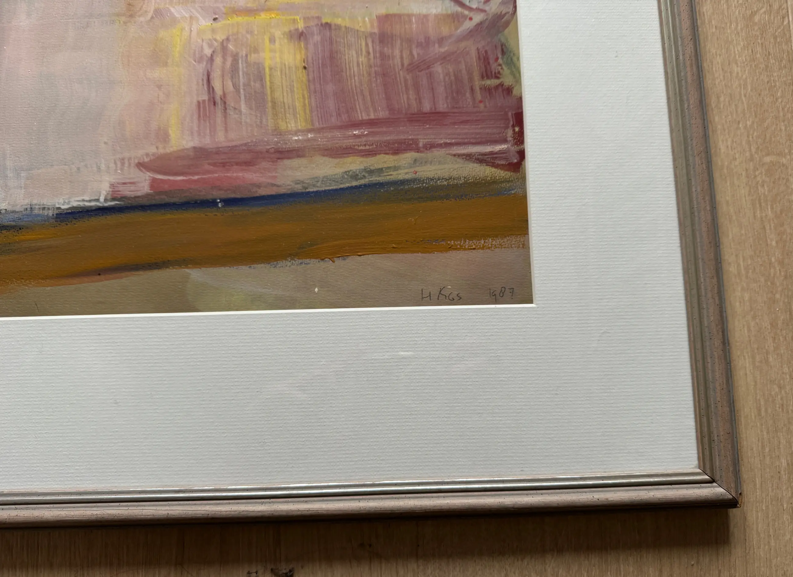 Fraai en kleurrijk werk van Helga Kos, ingelijst met passe-partout en klaar om aan de muur te hangen.