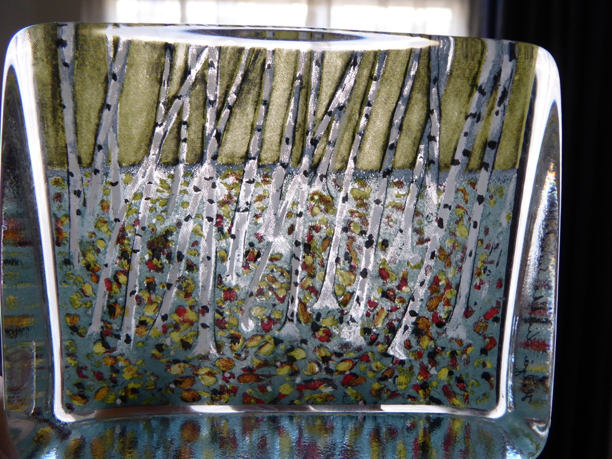 Het object is 8 cm hoog en 10 cm breed en gesigneerd door de kunstenares. Het is in uitstekende staat. Als het licht erdoor valt komt het berkenbos tot leven.