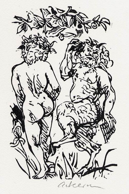 Helmut Ackermann - PAN mit FLÖTE & WEIBLICHEM AKT - Handsignierter Linolschnitt - ER war ihr TRAUM, und SIE sein SCHLAF - Verkocht