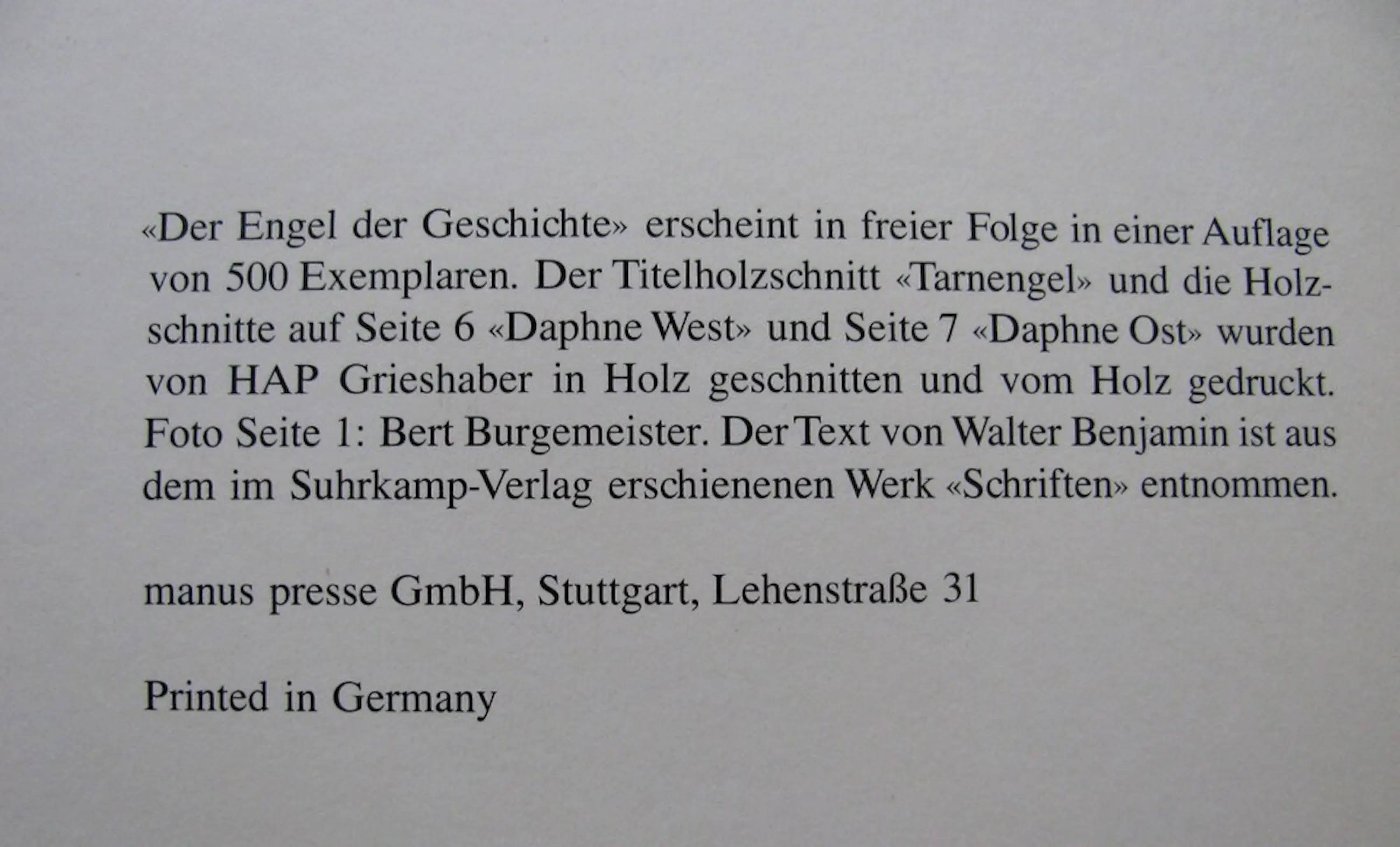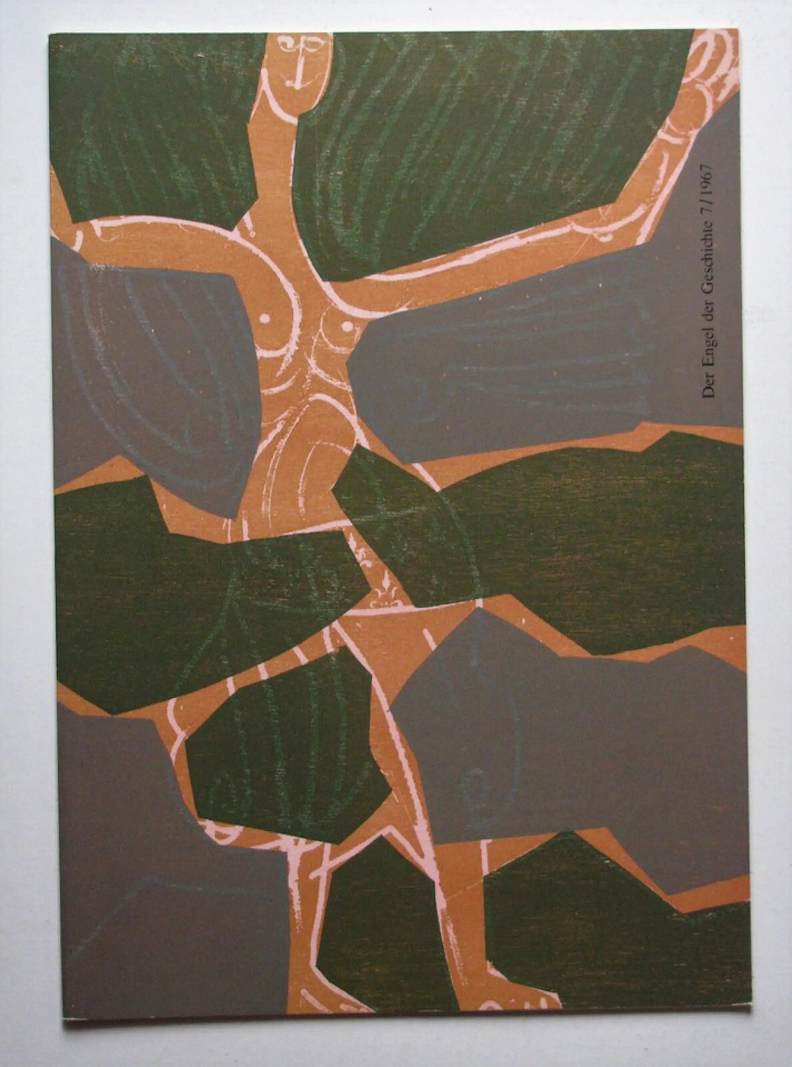 ENGELEN VAN VERHAAL 7, uit 1967 VERMOMMDE ENGELEN. Folioformaat, 41 x 29 cm. Handtekening van HAP Grieshaber. 12 pagina's. Originele kartonnen map. Een van de 500 exemplaren. Fichtner 57. Met 3 paginagrote originele kleurenhoutsneden van HAP Grieshaber (WVZ Fürst 67/34b-36b). In zeer goede staat. Uit de nalatenschap van professor Gerhard Fichtner.