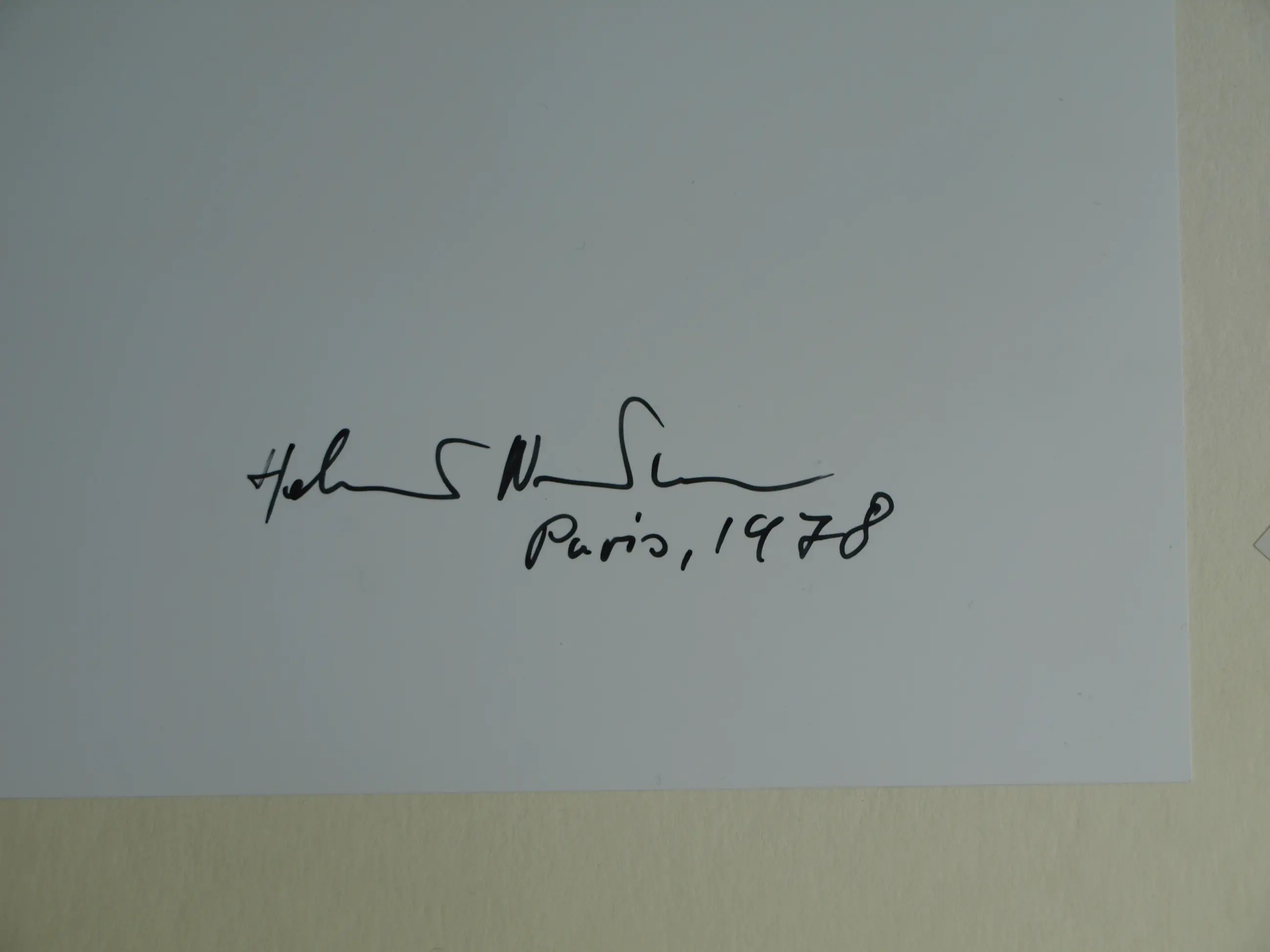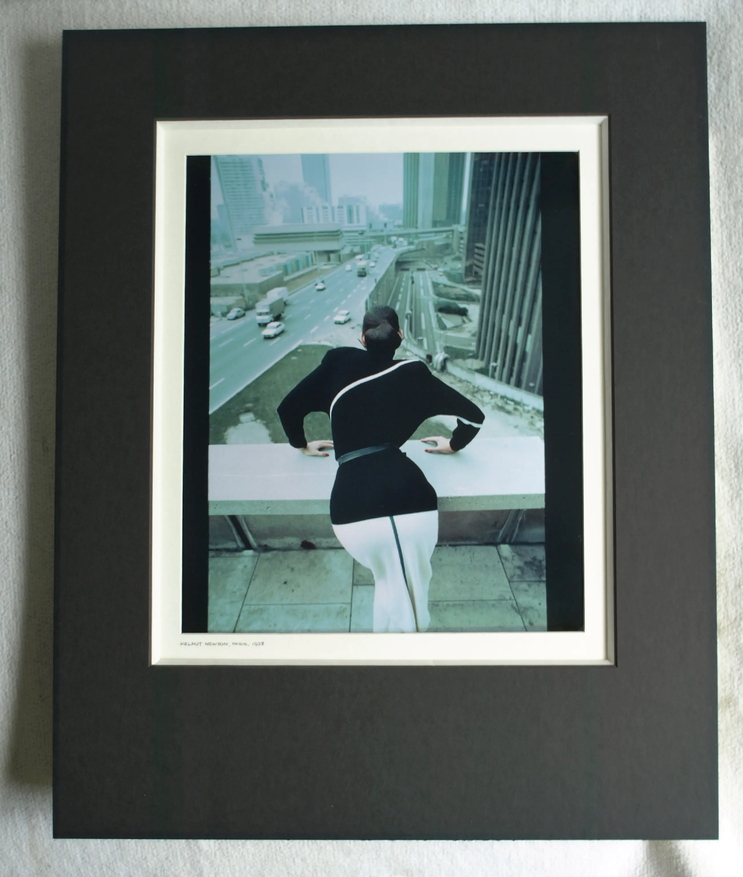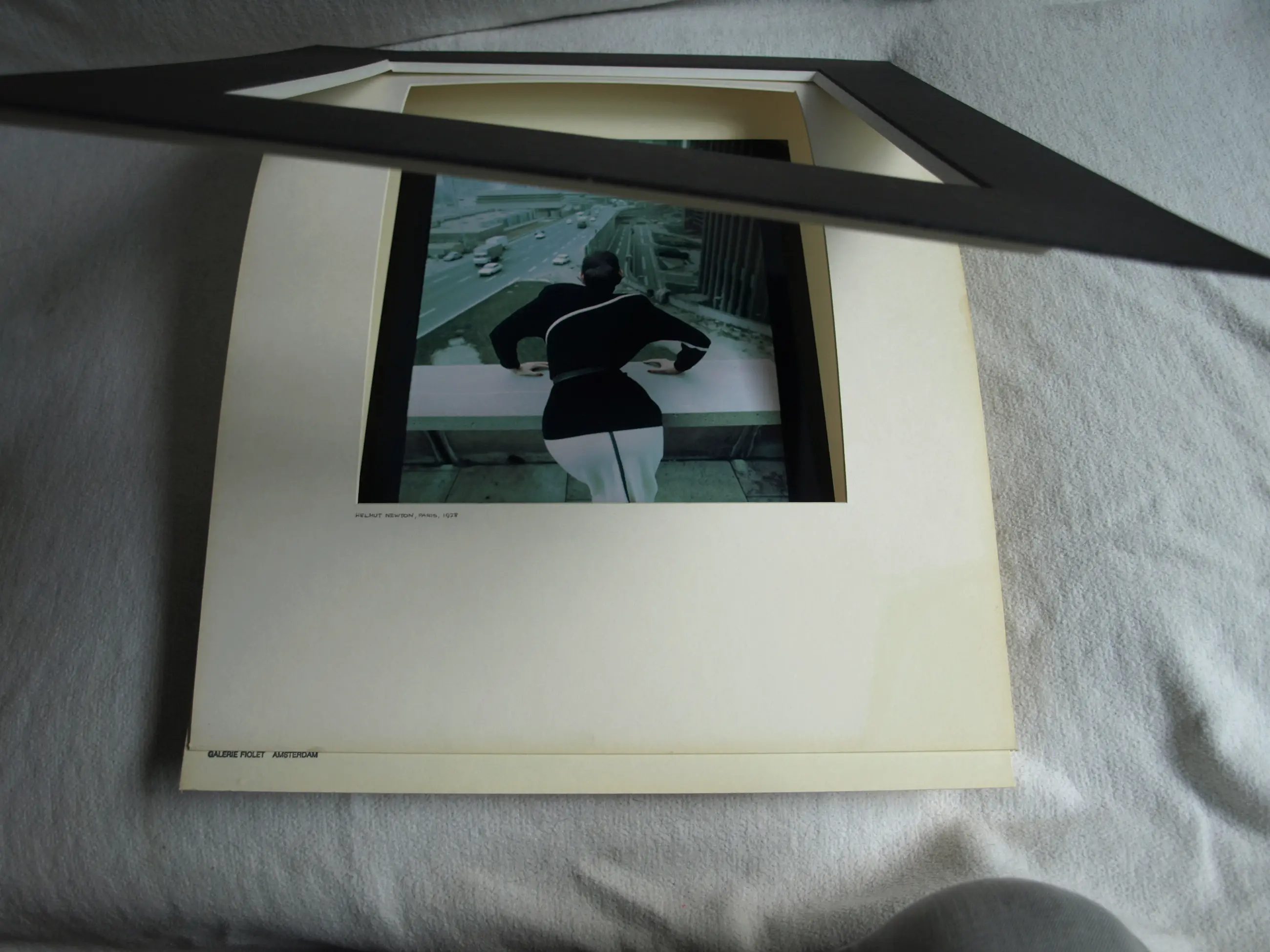 Een ingelijste foto uit 1978 van de Duits-Australische fotograaf Helmut Newton (1920-2004). De foto is gemaakt voor het promoten van de herfstcollectie 1978 van ontwerper Thierry Mugler (1948-2022). -De foto is handgesigneerd en -gedateerd op de achterkant van de foto. Door de inlijsting is de signatuur niet te zien en is een kopie van deze signatuur bevestigd op de achterkant van de lijst (zie de foto’s). -Techniek: C-print (Chromogenic print). -De foto is ingelijst in een zwarte houten lijst met dubbel passe-partout en glasplaat. -Afmetingen: Lijst, 53 x 43 x 2,5 cm. Fotoblad, 30 x 25 cm. Beeld/foto, 29 x 24 cm. -Herkomst: Uit de collectie van de Nederlandse decor- en kostuumontwerper Jan Aarntzen (1950). -Provenance: De foto is oorspronkelijk afkomstig van ‘Galerie Fiolet’ in Amsterdam, de eerste in fotografie gespecialiseerde galerie in Nederland en is ooit geveild bij Veilinghuis AAG in Amsterdam. -Conditie: De foto is in goede staat. De kleuren zijn iets vervaagd. De zwarte houten lijst heeft slijtplekken en kleine beschadigingen met verfverlies. Zie ook de foto’s voor een eigen indruk. Kan zo aan de muur.