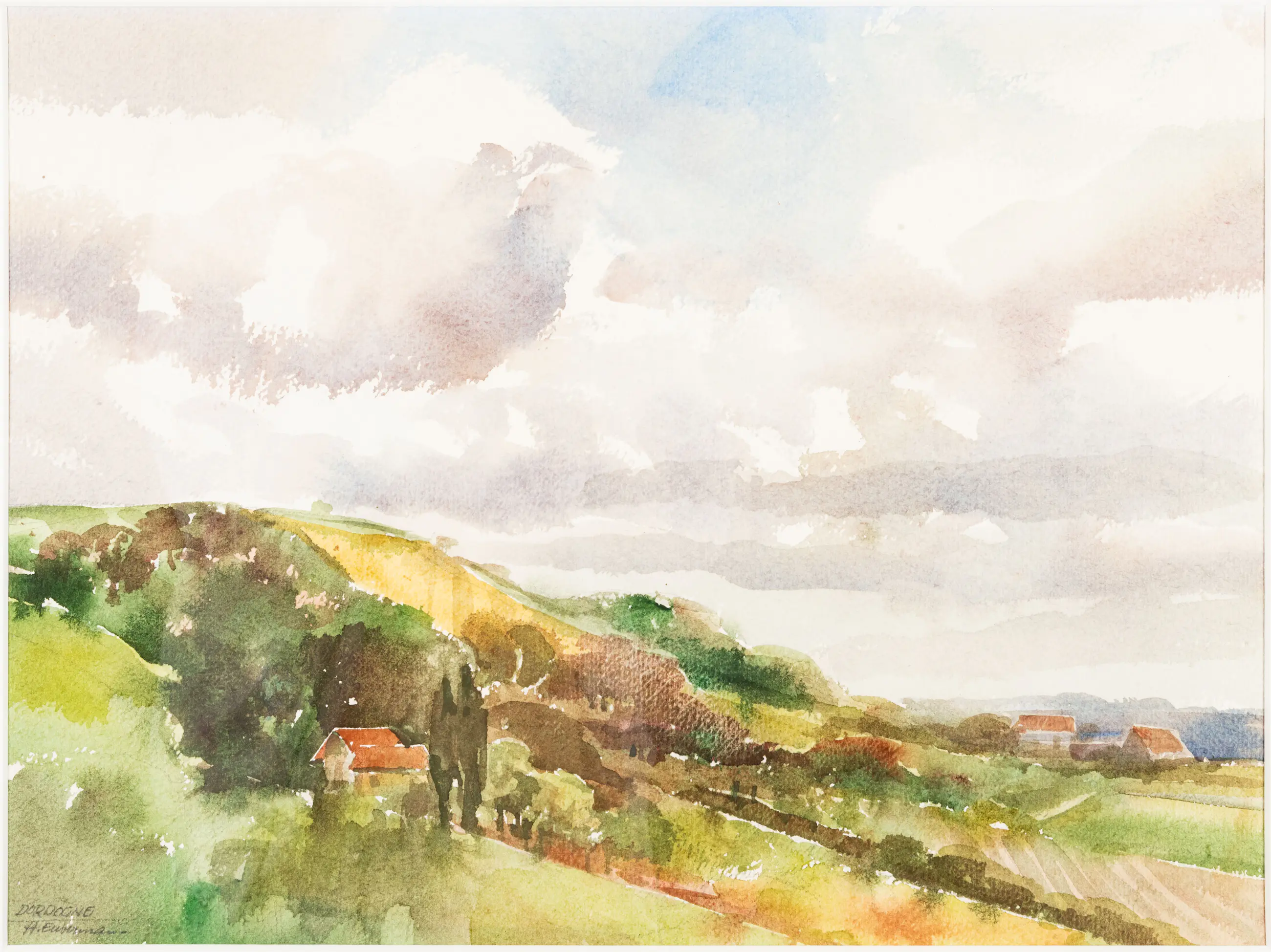 Subtiele aquarel die een indruk geeft van de Franse Dordogne. Kunstenaar Henny Euverman is geboren op 11 december 1918 te Enschede. Hij volgde een studie aan de Academie voor Kunst en Industrie Enschede. Hij is overleden in 1994 en laat een mooi oeuvre na.