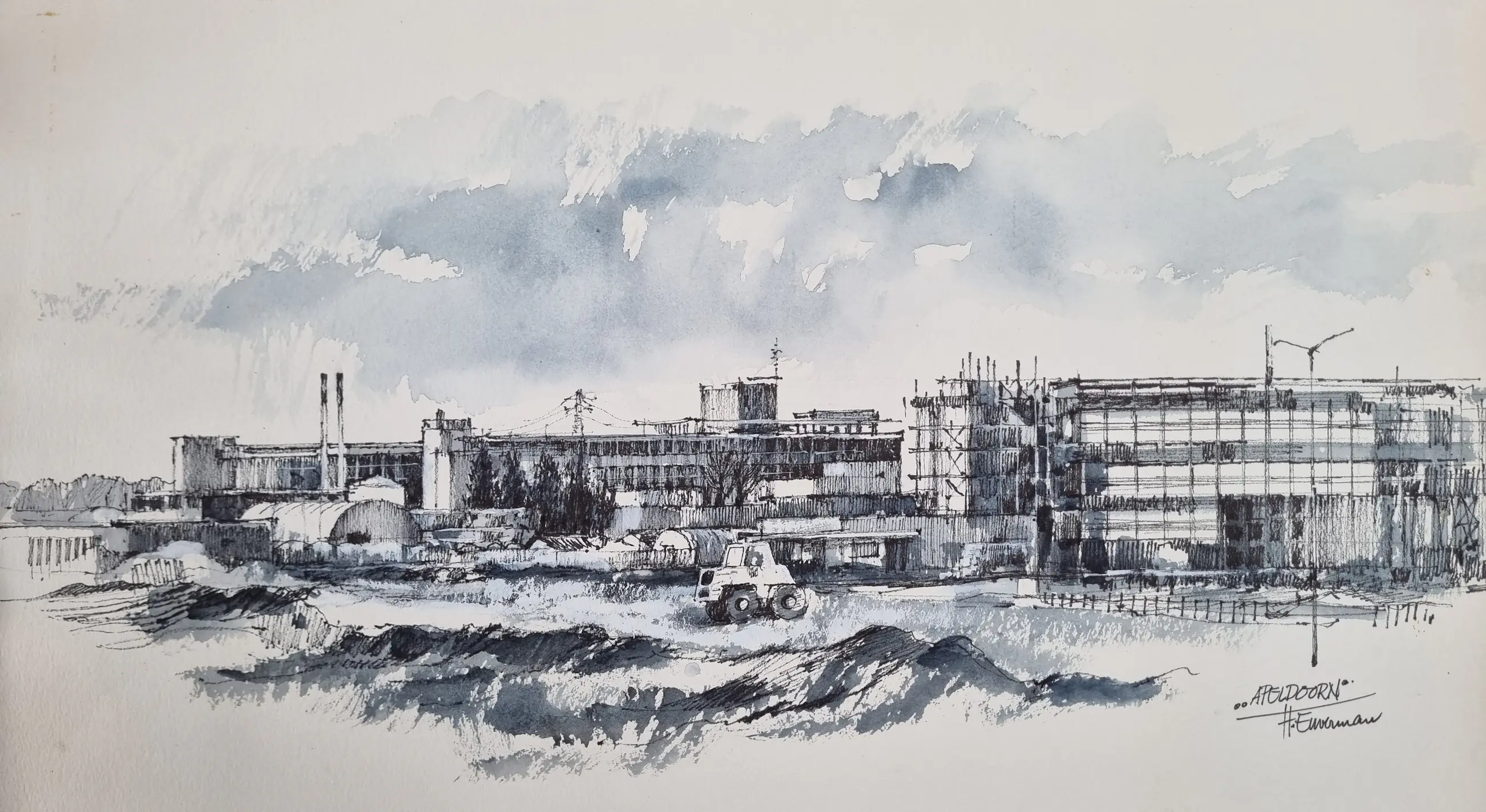 Hen Euverman werkte voor Philips. In de jaren '60 vervaardigde hij voor het bedrijf deze tekening van de Philips fabriek in aanbouw.