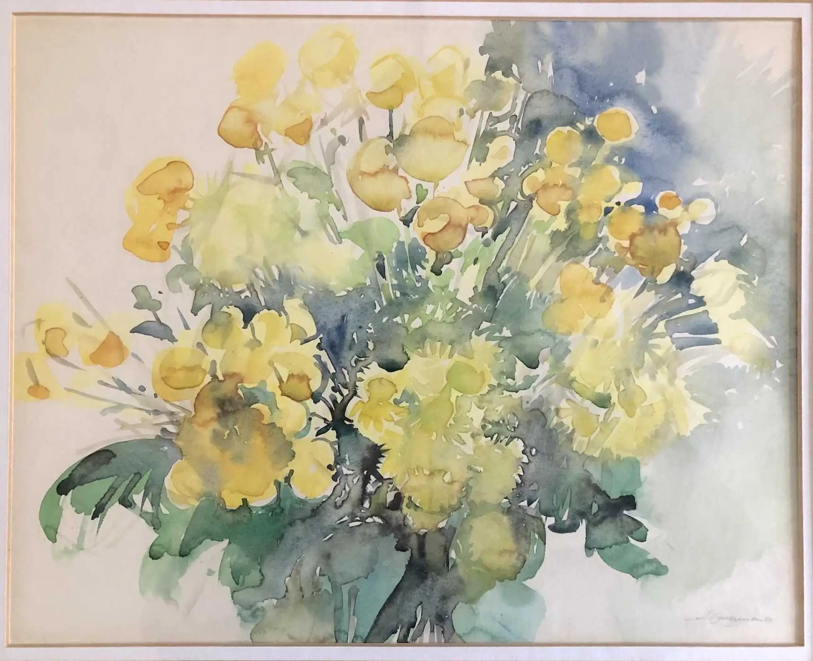 22 K Henny Euverman Stilleven Boeket gele bloemen Aquarel 1989 40 x 50 cm 50 x 61 cm Herkomst: Peter van den Braken Centrum te Sterksel. Linksonder glasgebroken
