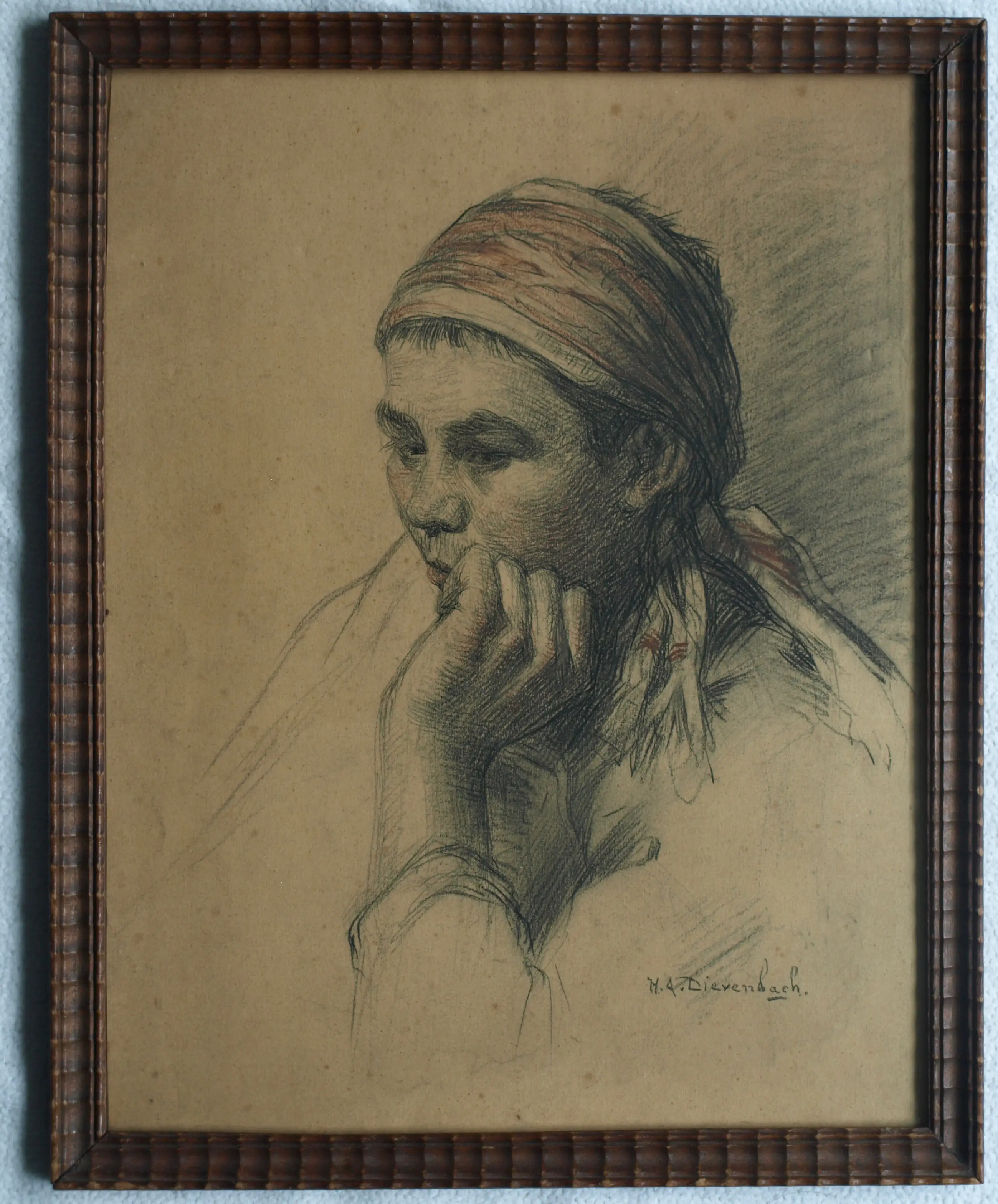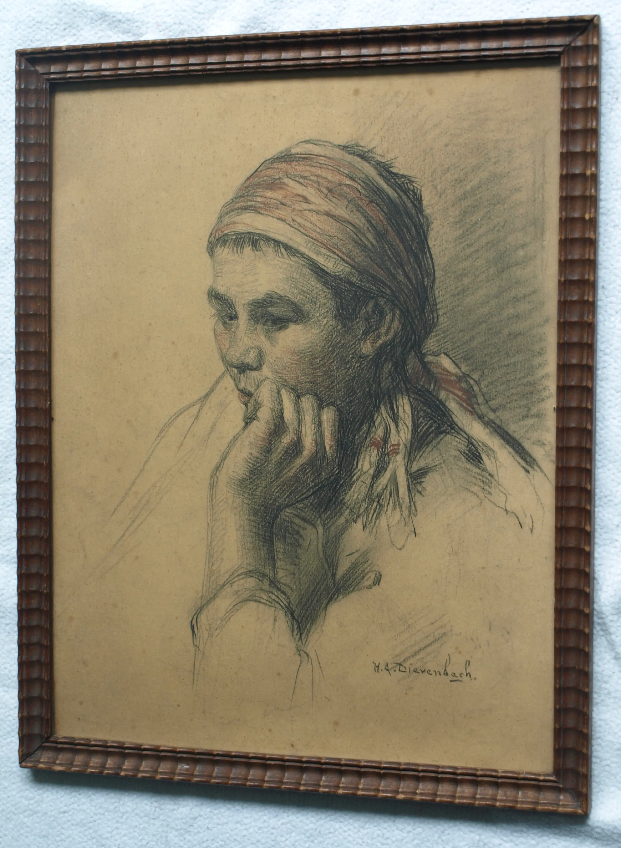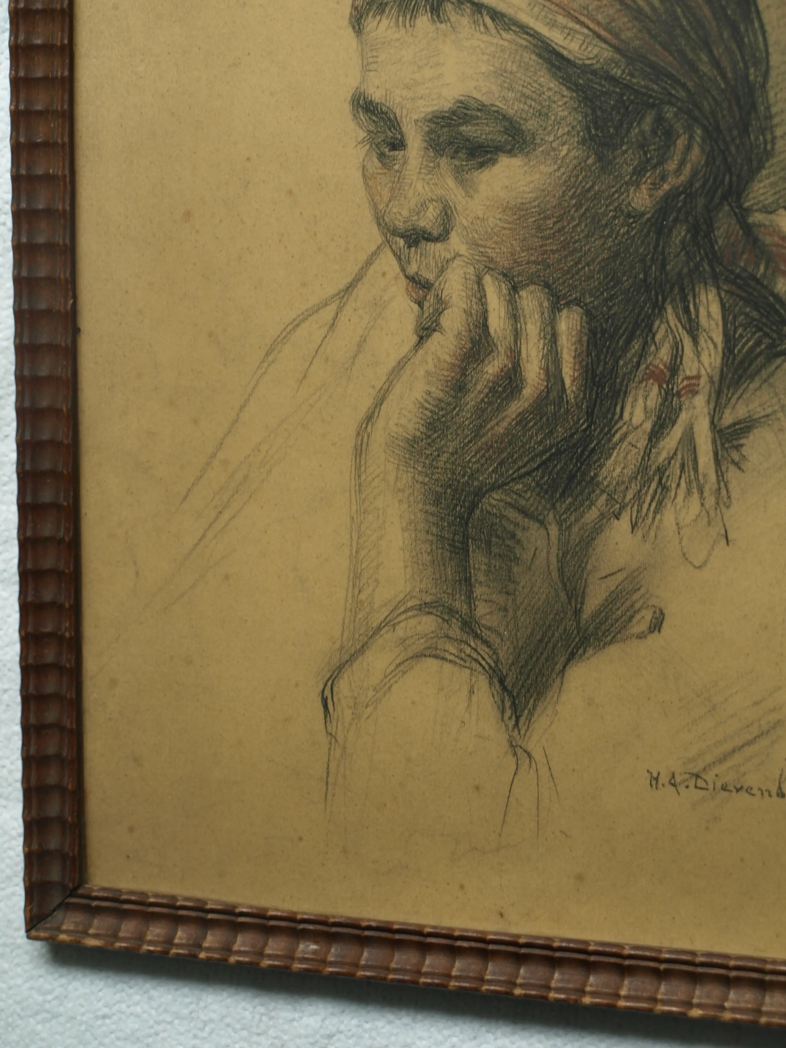 Een ingelijste tekening van de Nederlandse kunstenaar Hendricus Dievenbach (1872-1946). -Ingelijst in een houten lijst met glasplaat. -Gesigneerd rechtsonder. -Afmetingen: Lijst, 38 x 30 x 1 cm. Beeld, 34 x 26½ cm. -Herkomst: Uit een inboedel. -Conditie: Het werk is in goede staat. Het papier is wat vergeeld en heeft een paar (zuur)vlekjes. De lijst heeft slijtplekjes. De kartonnen achterplaat zit gedeeltelijk los van de spijkertjes. Een ophanghaakje ontbreekt. Zie ook de foto’s voor een eigen indruk.