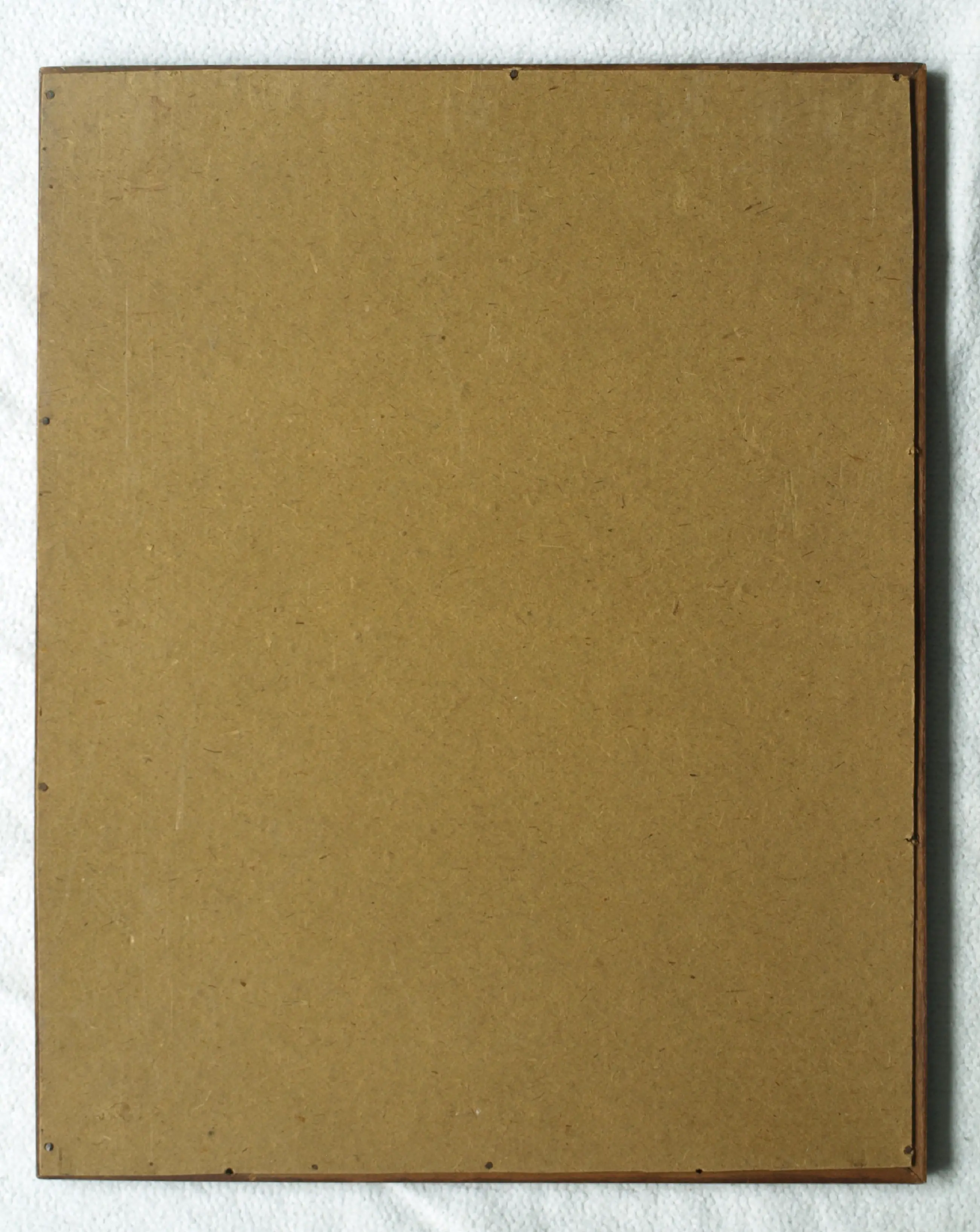 Het werk is in goede staat. Het papier is wat vergeeld en heeft een paar (zuur)vlekjes. De lijst heeft slijtplekjes. De kartonnen achterplaat zit gedeeltelijk los van de spijkertjes. Een ophanghaakje ontbreekt. Zie ook de foto’s voor een eigen indruk.