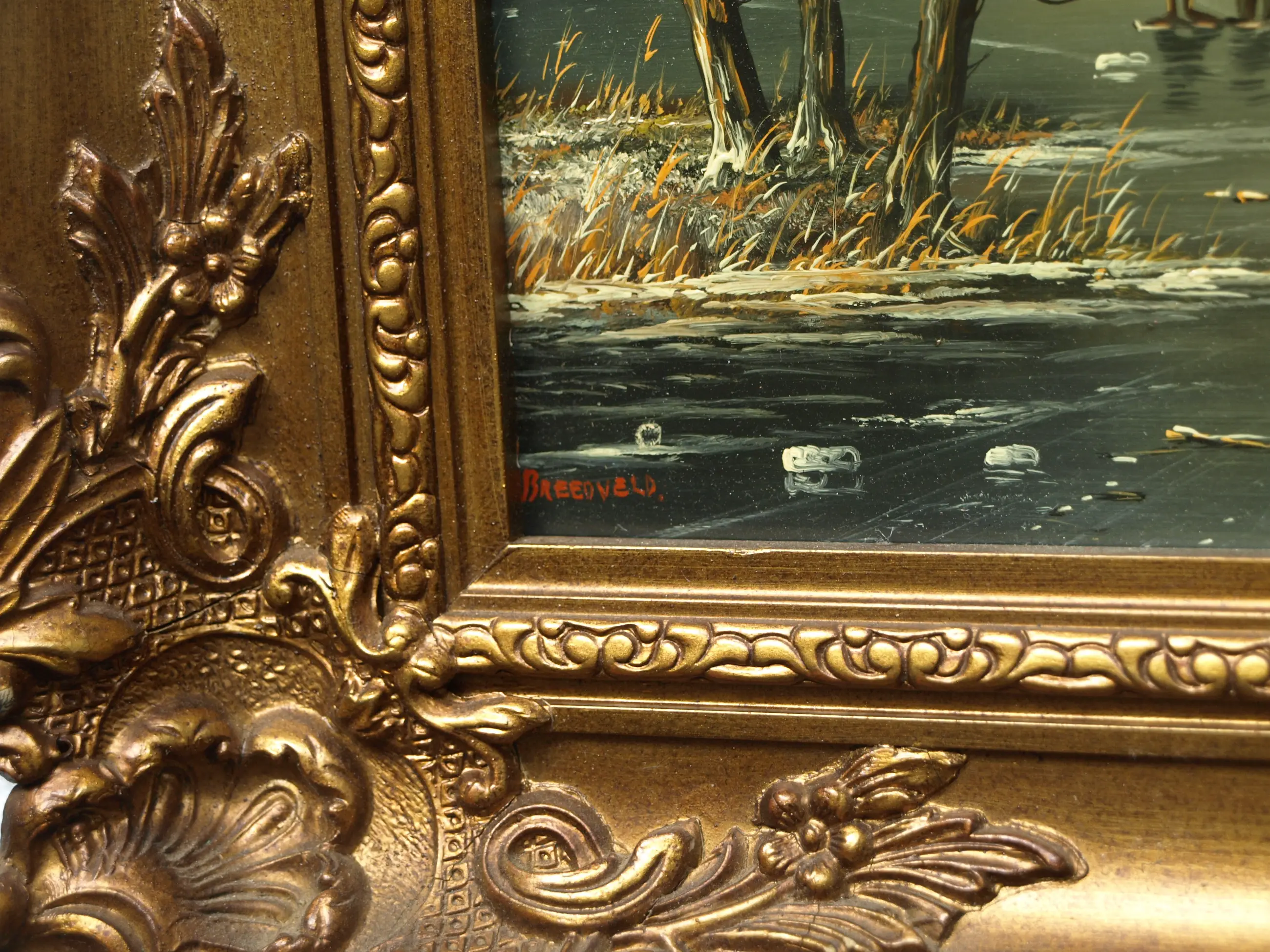 Informatie over de kunstenaar: Hendrik Breedveld werd geboren op 24 maart 1918 in Sliedrecht en is overleden op 17 januari 1999. -Opleiding: Autodidact. Hij werkte voornamelijk in de omgeving van Sliedrecht en in de periode 1969-1970 in de omgeving van Holten. Hendrik Breedveld schilderde, tekende en aquarelleerde zowel landschappen als stadsgezichten, maar hij is vooral bekend om zijn vele schilderijen van eenden aan het water.