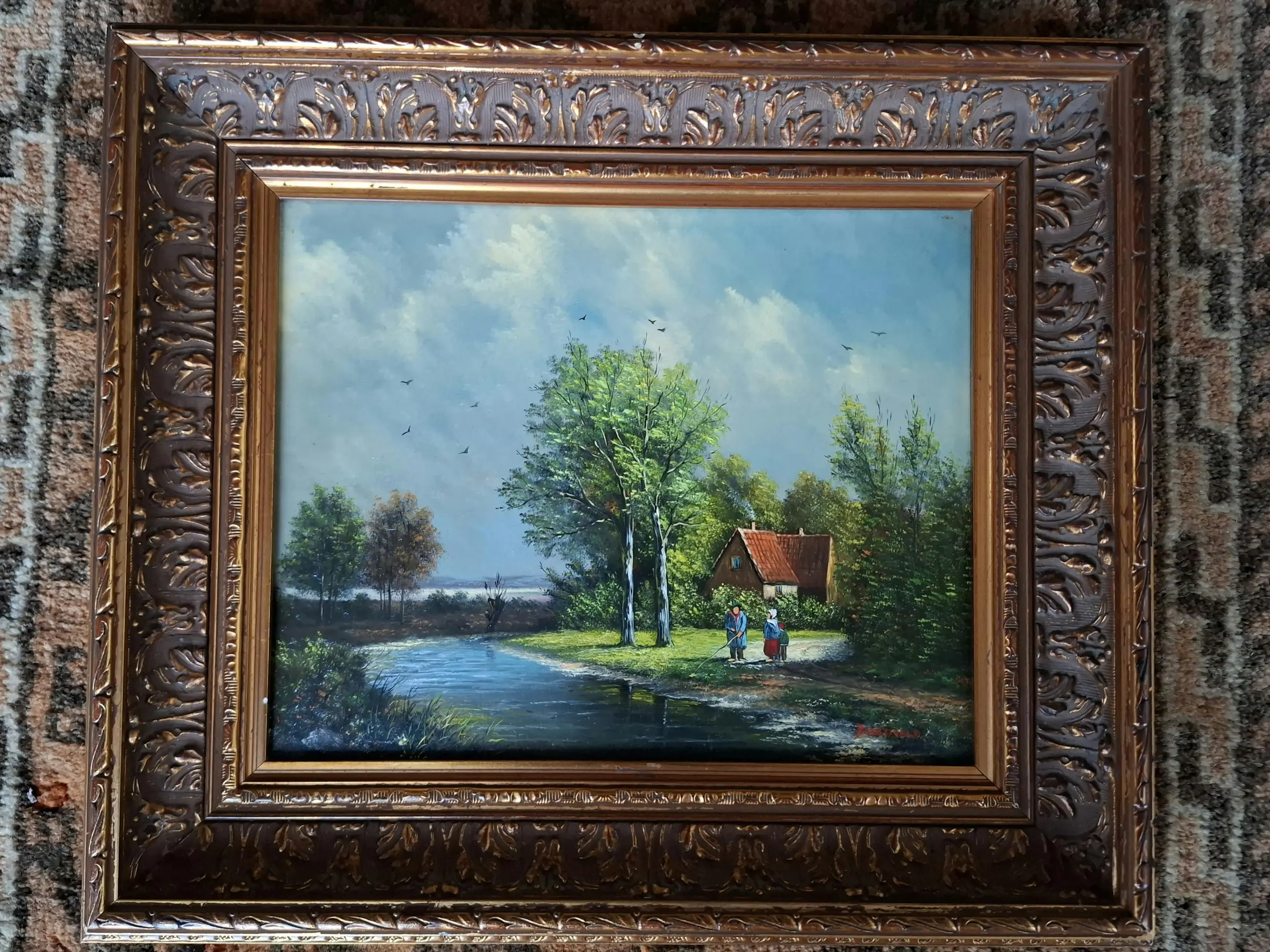 Huis en personen in de bocht van een rivier.