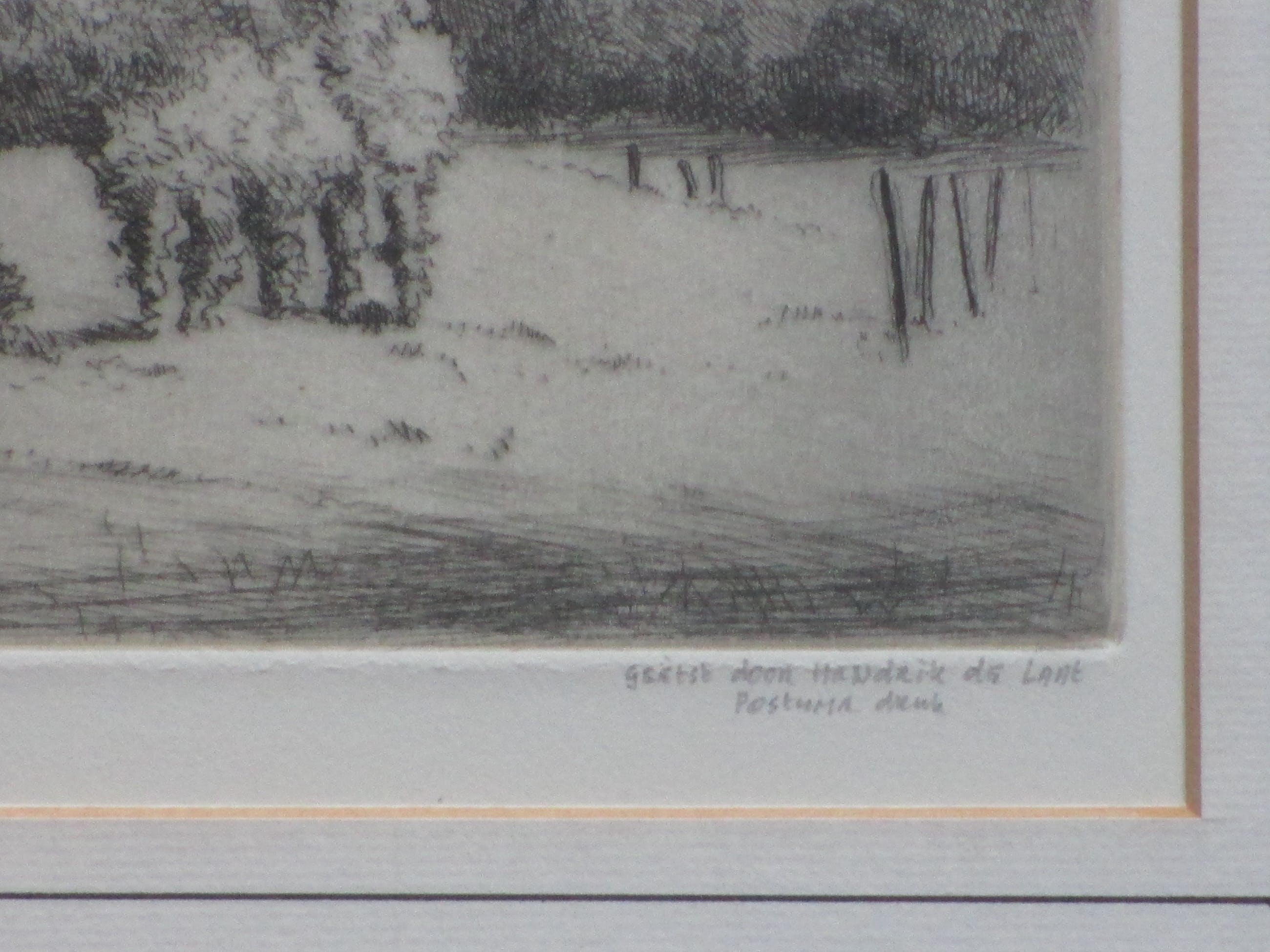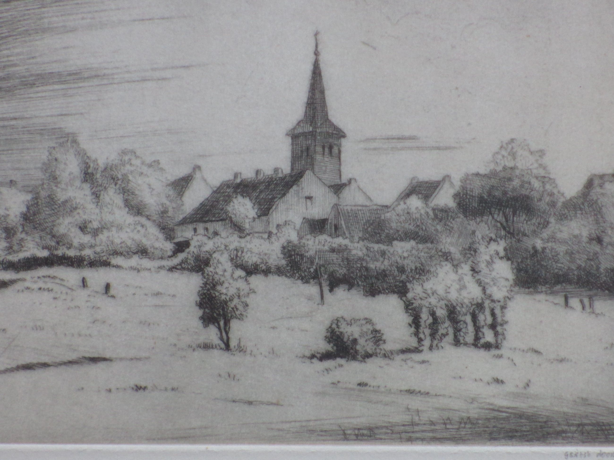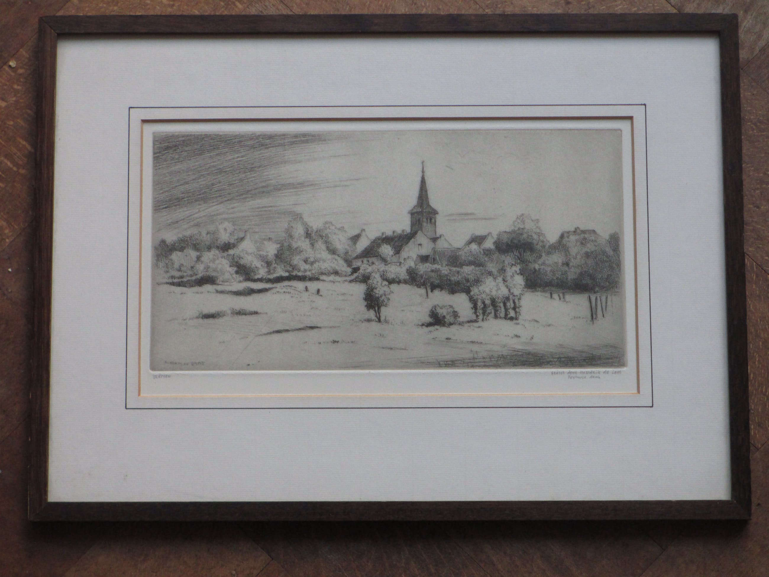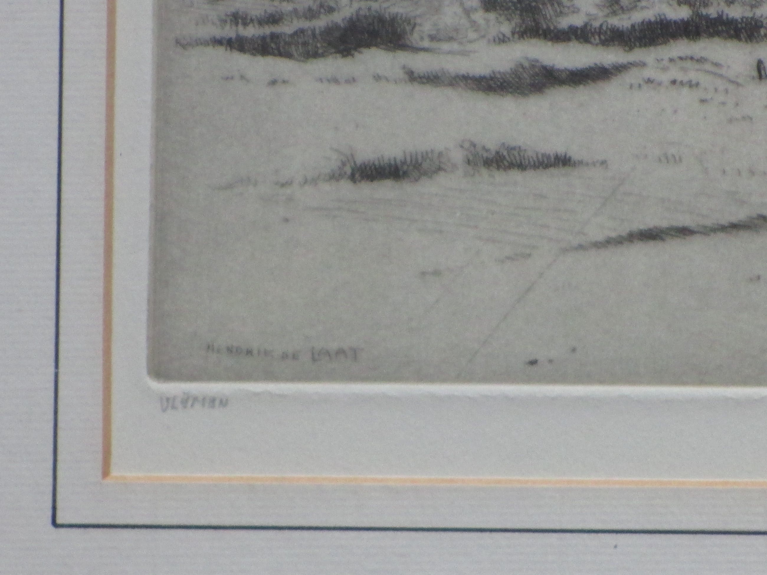 Ets door Hendrik de Laat. Voorstelling van een gezicht op Vlijmen. Gelijst, beeldmaat 12.5x24, lijstmaat 26.5x37 Postume druk, r.o. in potlood Gesigneerd in de druk l.o.: 'Hendrik de Laat' Getiteld in potlood l.o.: 'Vlijmen'