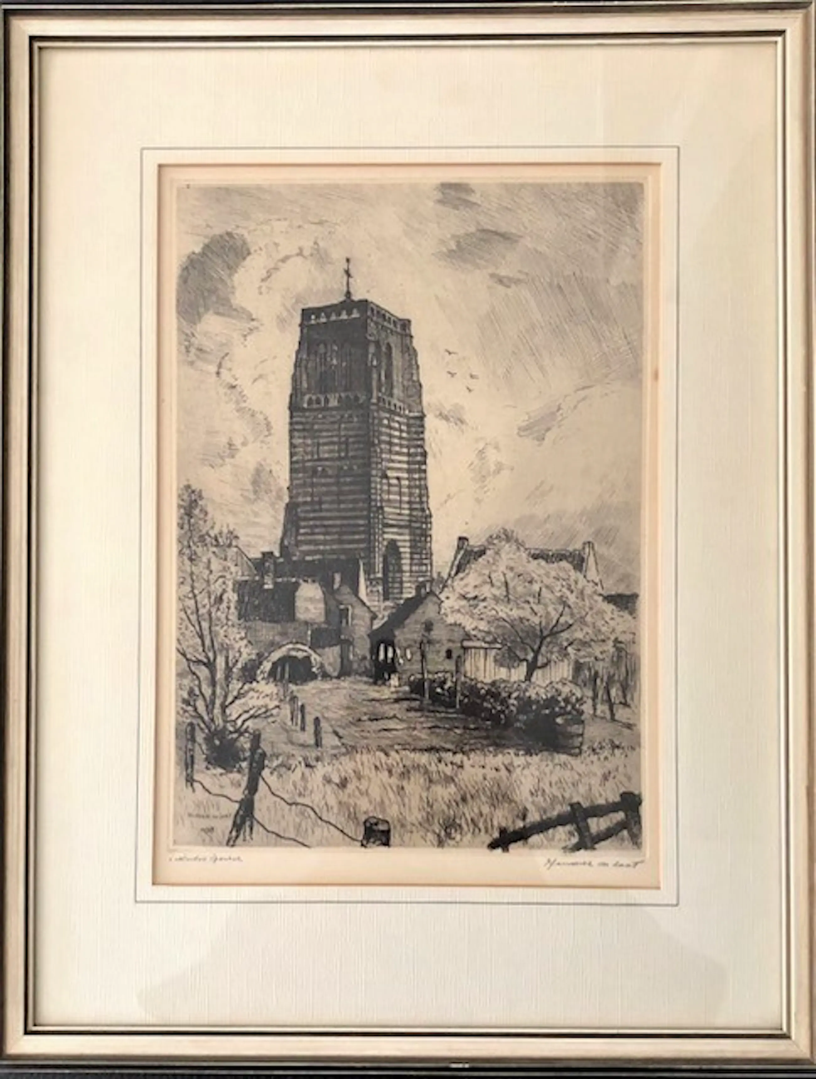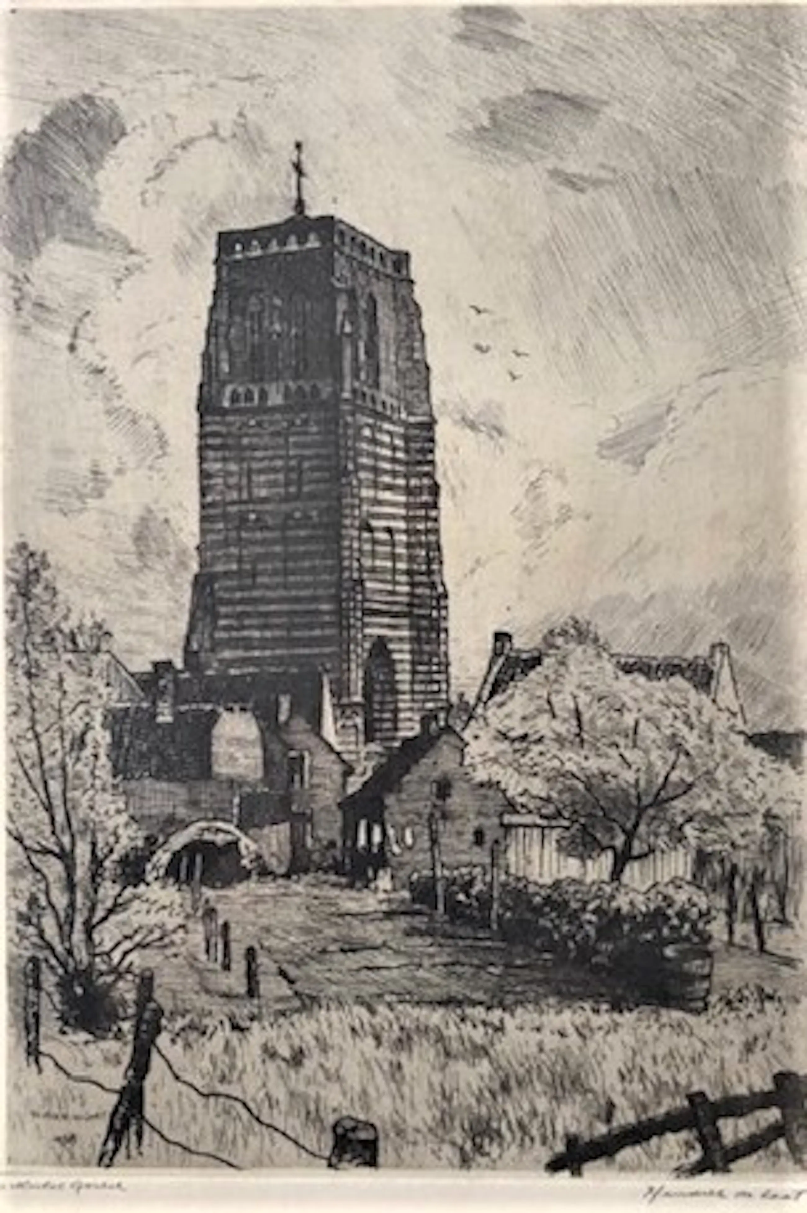 Mooie scherpe ets voorstelling Kerktoren St. Michielsgestel. Gesigneerd Hendrik de Laat ( 1900-1980 )