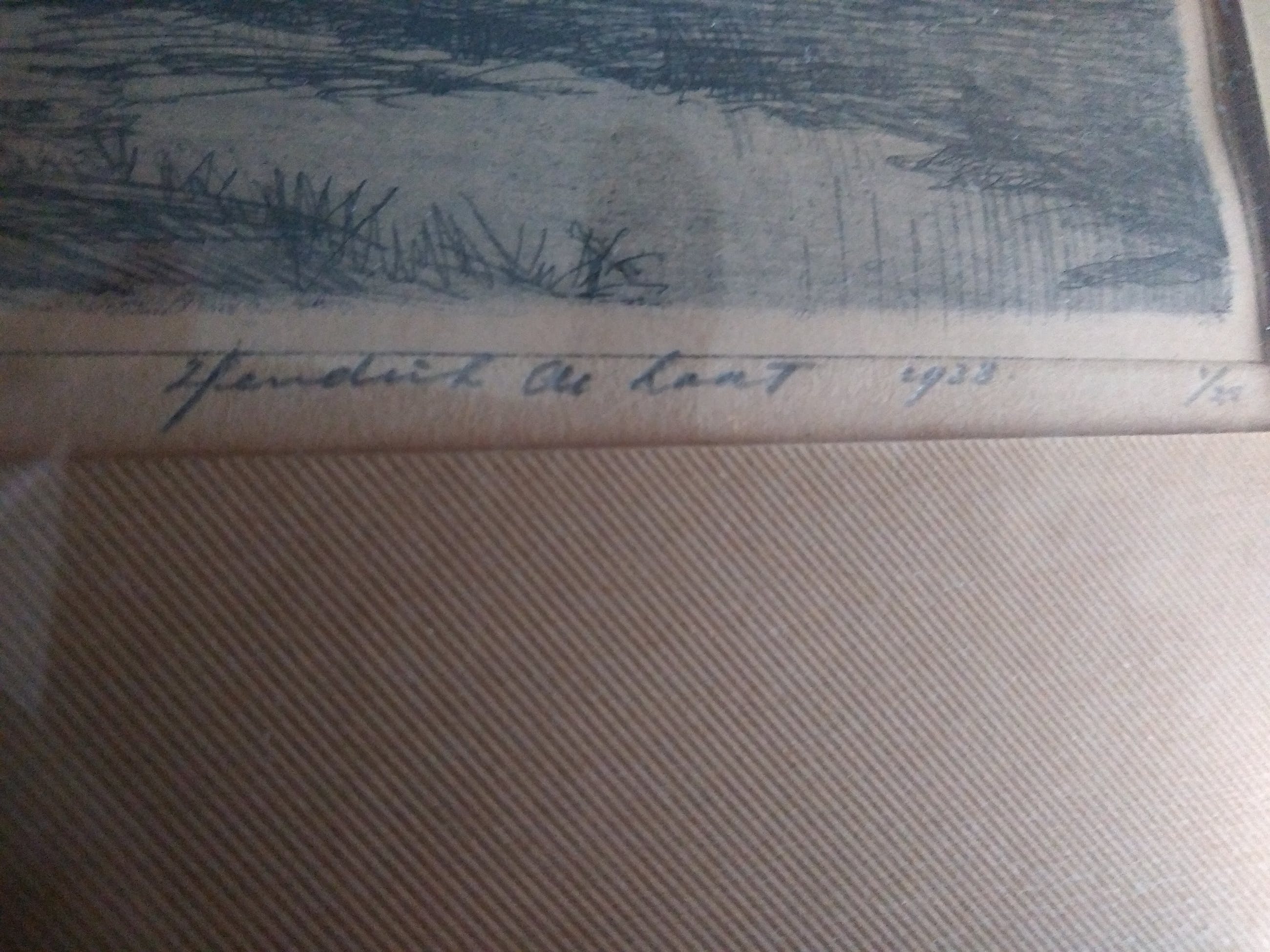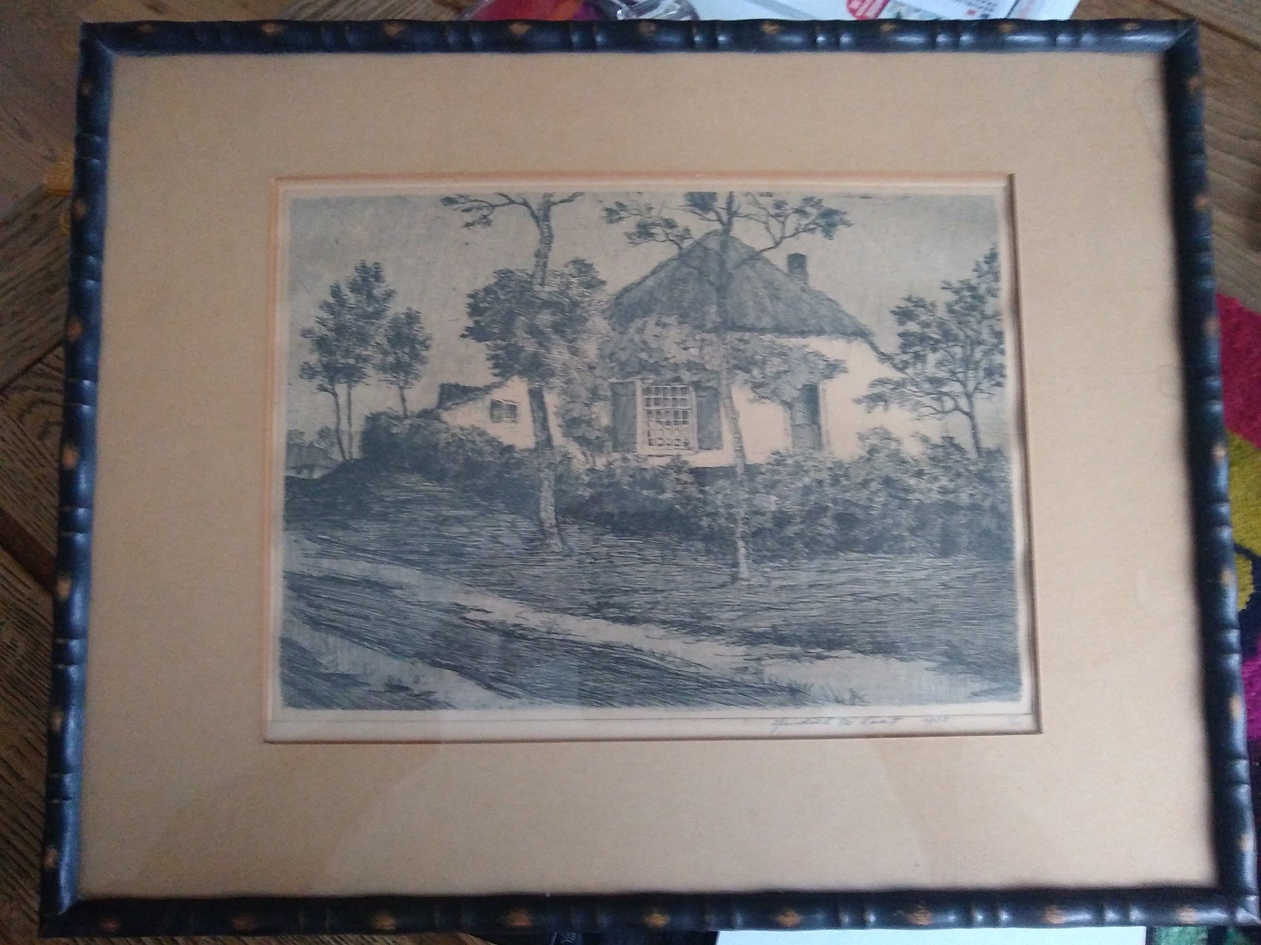 1938. Mooie ets van een Brabantse boerderij. Met potlood gesigneerd