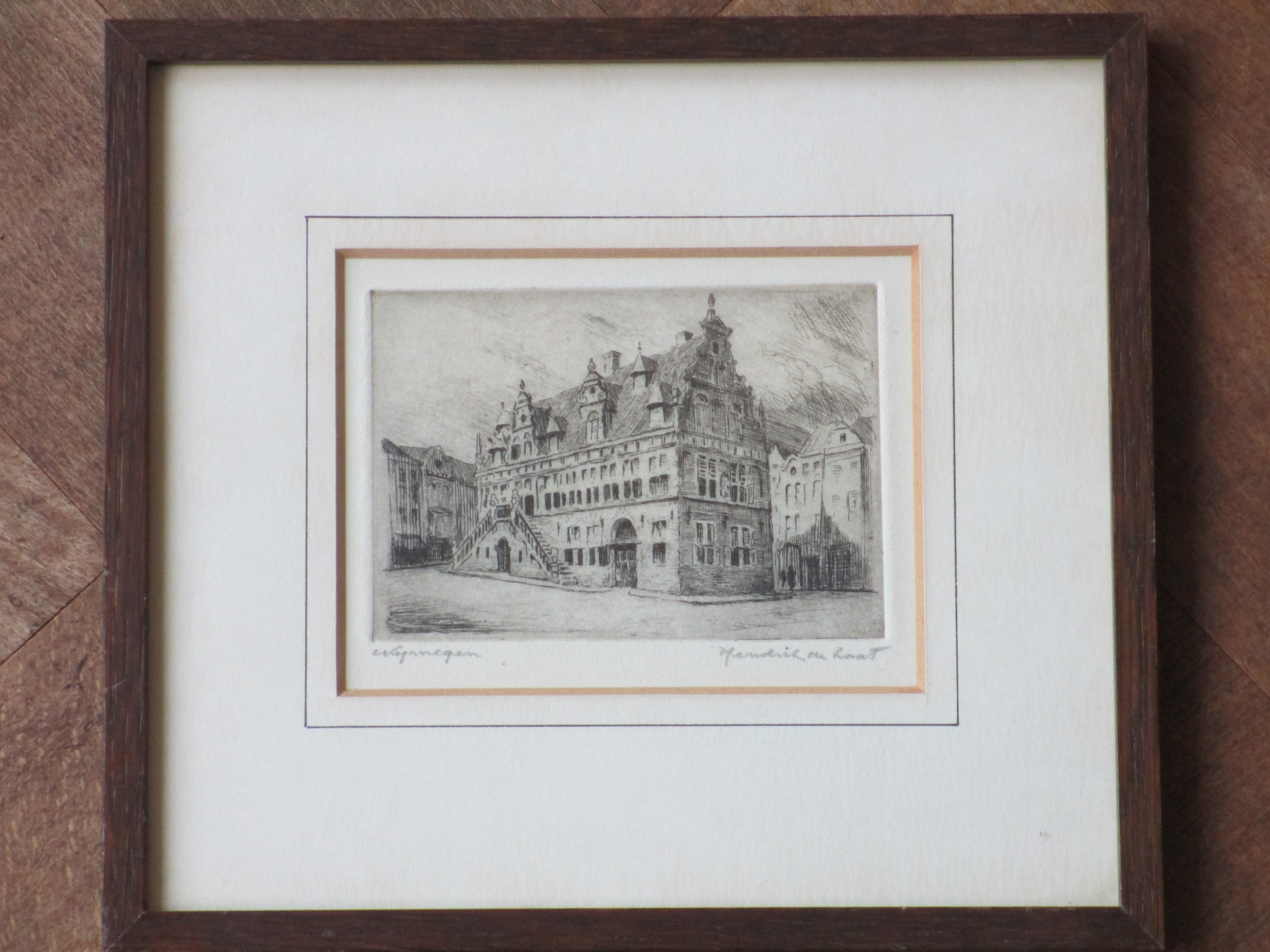 Ets door Hendrik de Laat Voorstelling van het oude stadhuis van Nijmegen aan de Markt Gelijst, beeldmaat 7x10, lijstmaat 18x20 Gesigneerd in potlood r.o.: 'Hendrik de Laat' Getiteld in potlood l.o.: 'Nijmegen' Authenticiteit volledig gegarandeerd