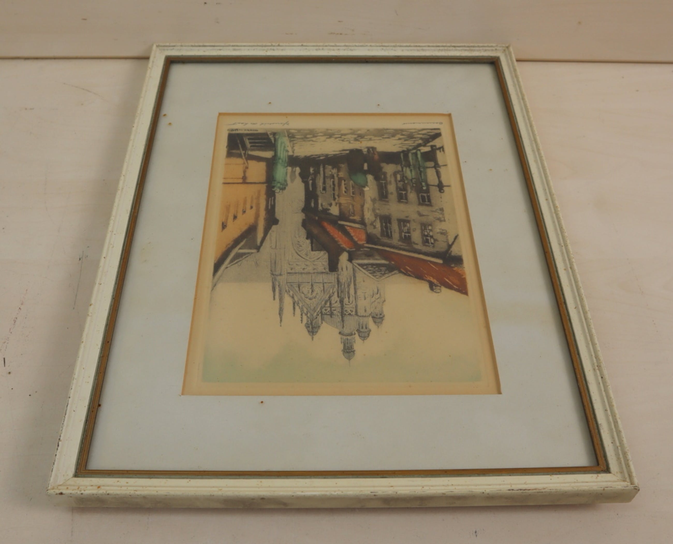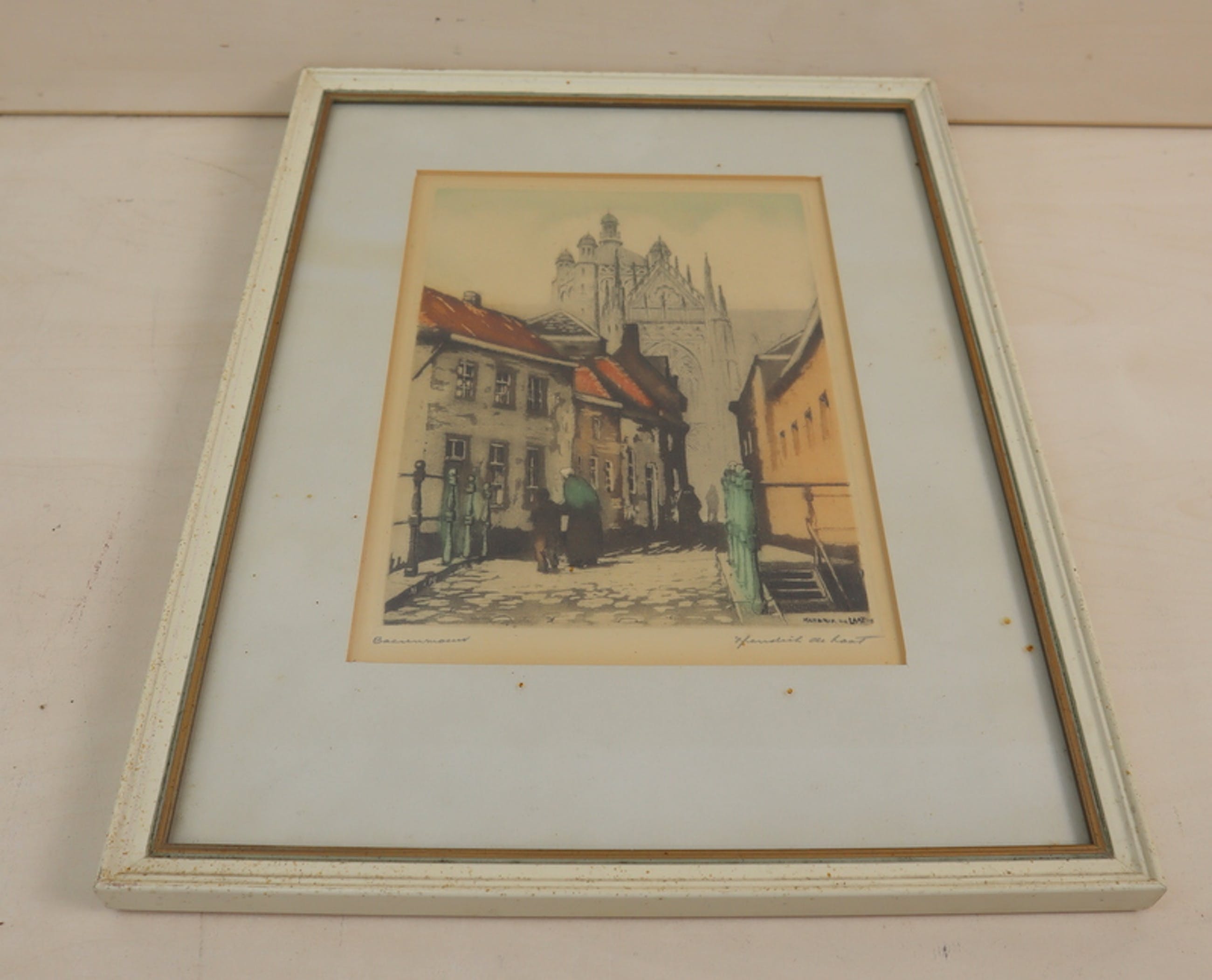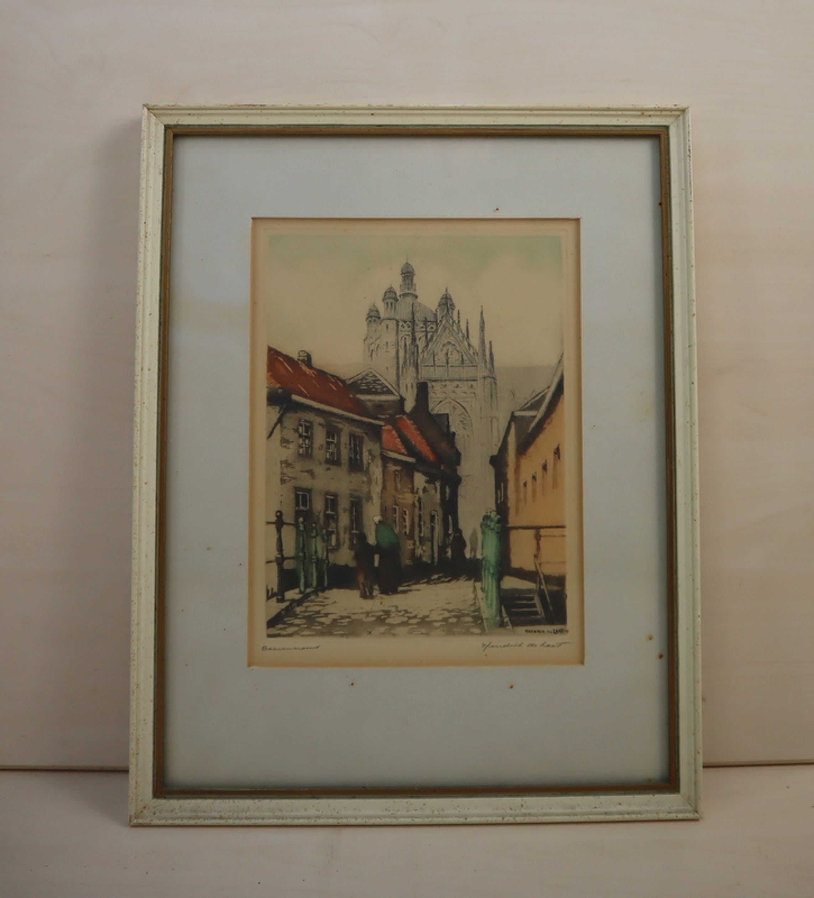 Ingekleurde ets, ingelijst met passe partout achter glas.
