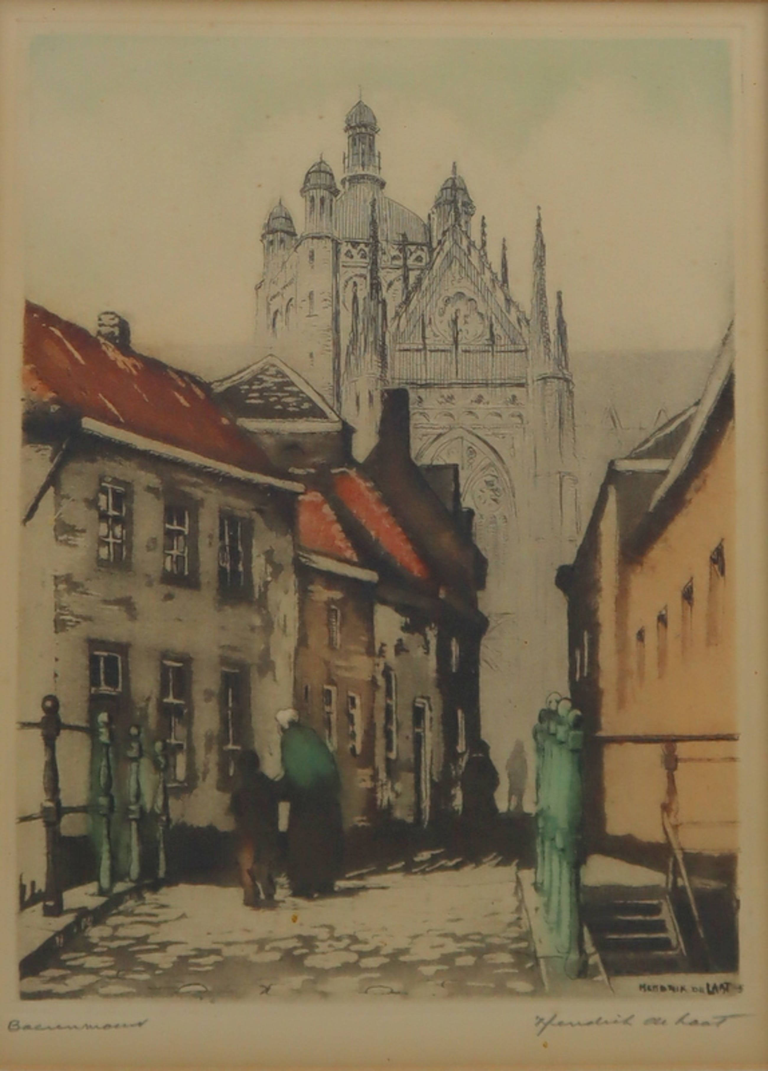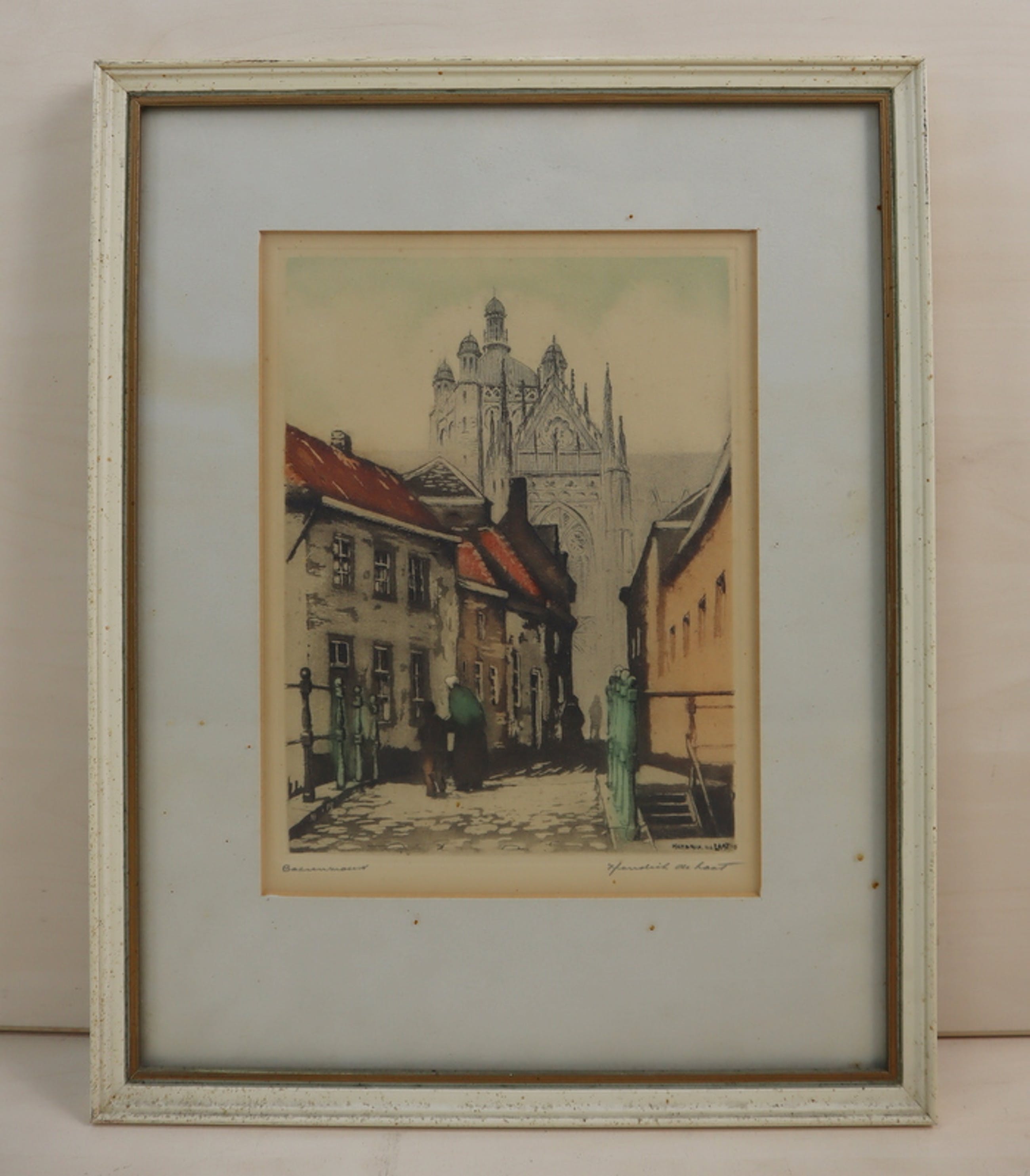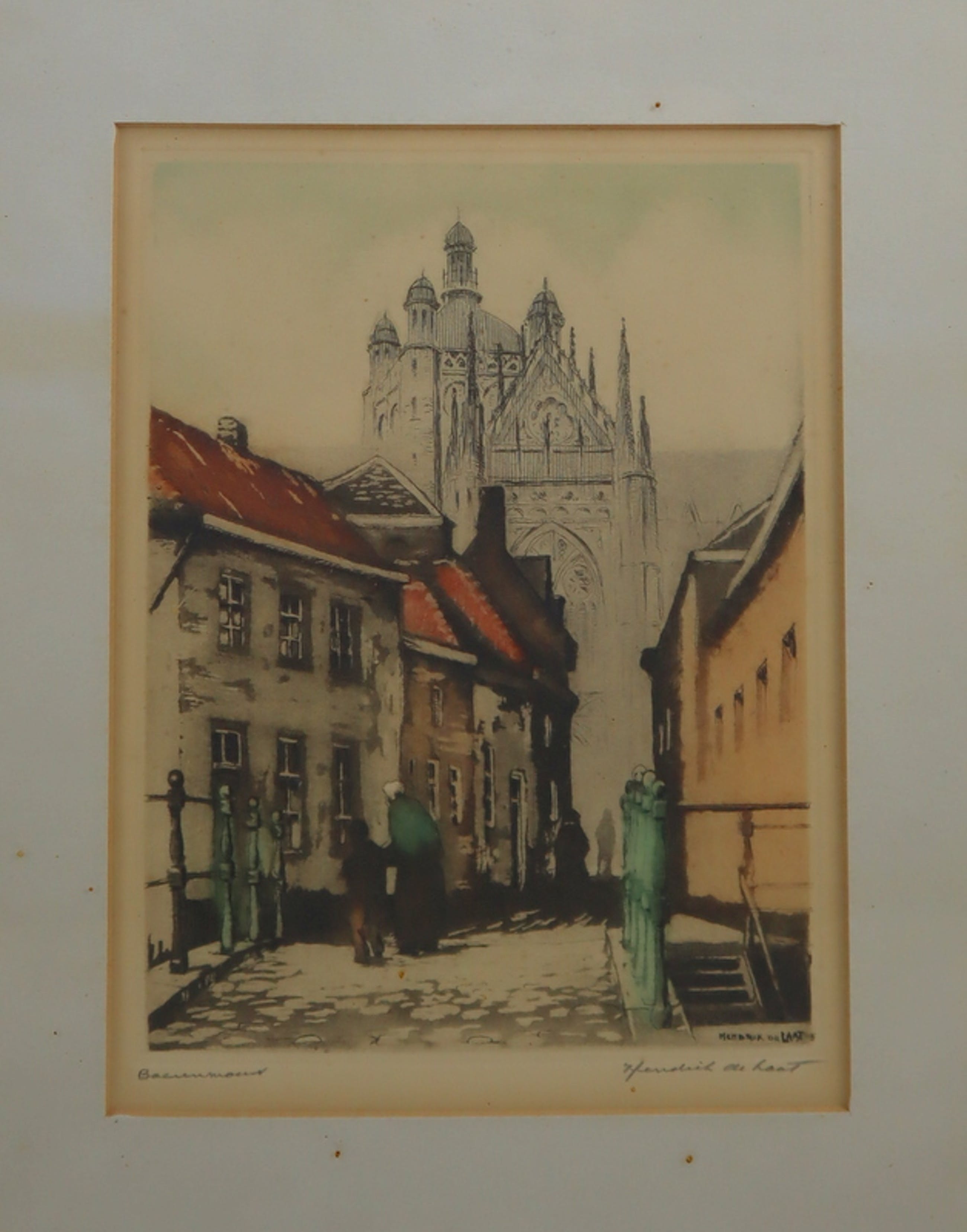 Ingekleurde ets, ingelijst met passe partout achter glas.