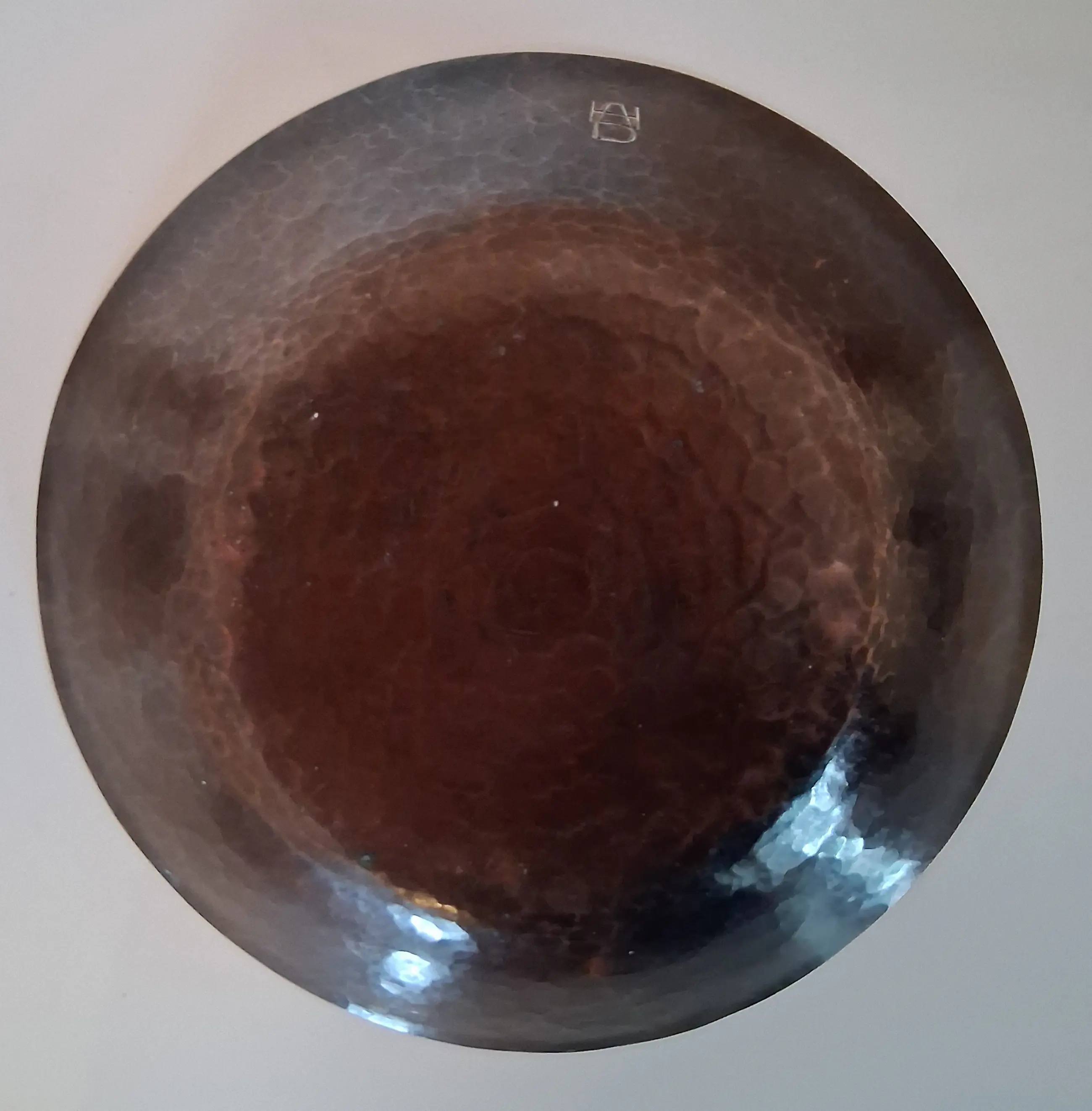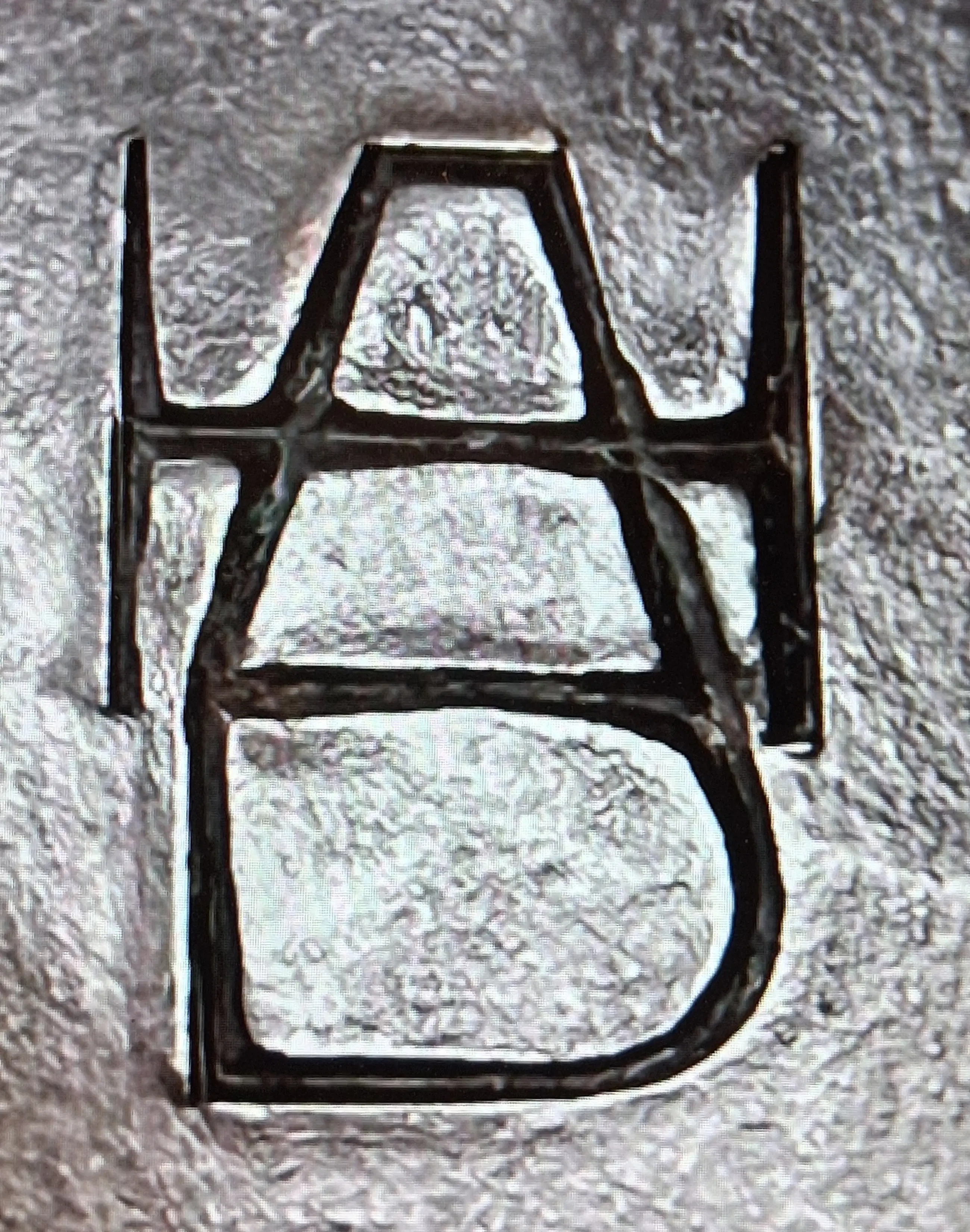 Het blokachtige, architectonische monogram dat je toont is kenmerkend voor ambachtelijke signaturen uit die periode en wordt vaker bij dit type werk aangetroffen dan bij latere decoratieve koperproductie.