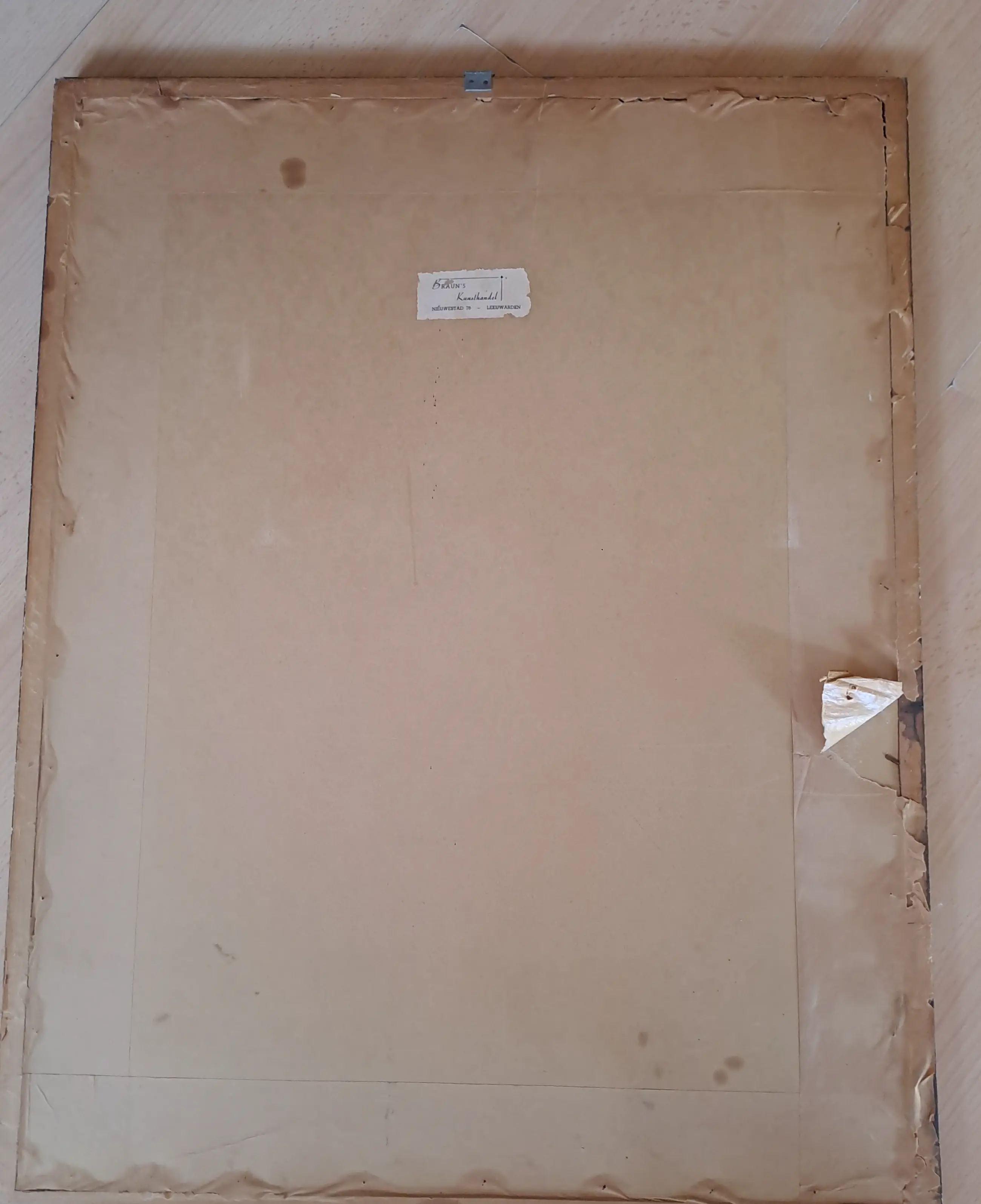 Vergeeld maar nog netjes.De lijst vertoont enige gebruikerssporen maar is ook nog netjes en het glas onbeschadigd.